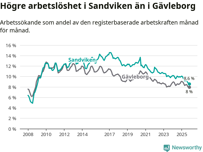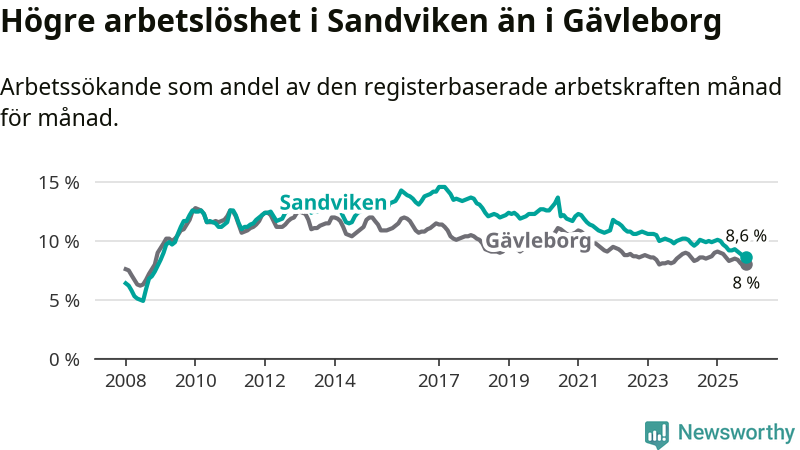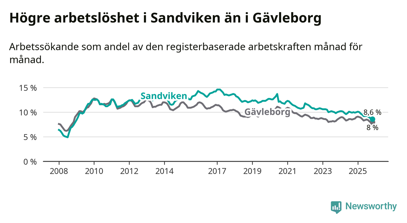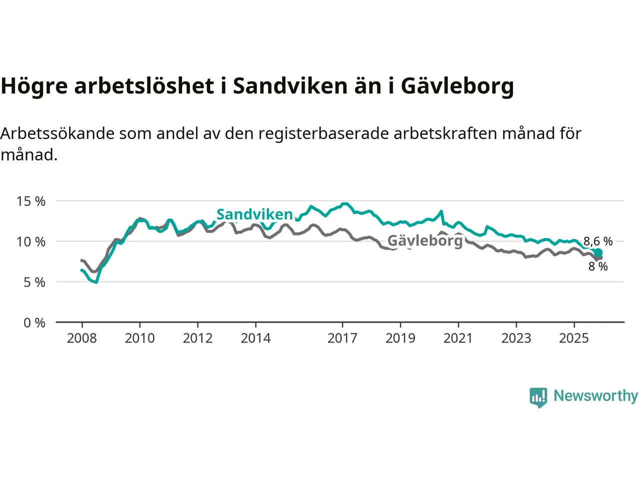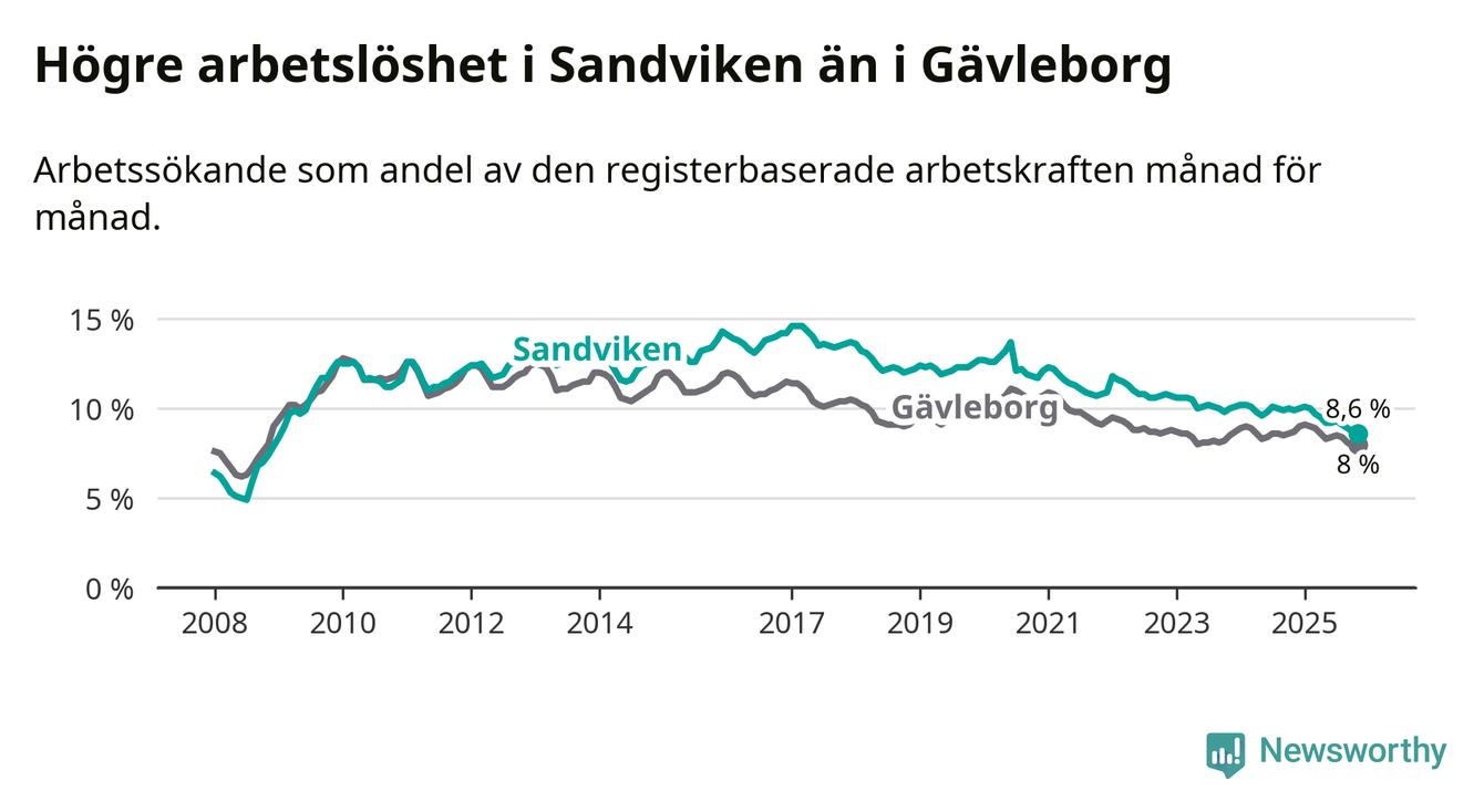 Det är 13:e månaden i följd som arbetslösheten i Sandviken är lägre än den var under samma tidpunkt året innan. Sedan oktober 2024 har arbetslösheten gått ner från 10,0 till 8,6 procent. Den nuvarande arbetslöshetsnivån är därmed den lägsta sedan januari 2009.