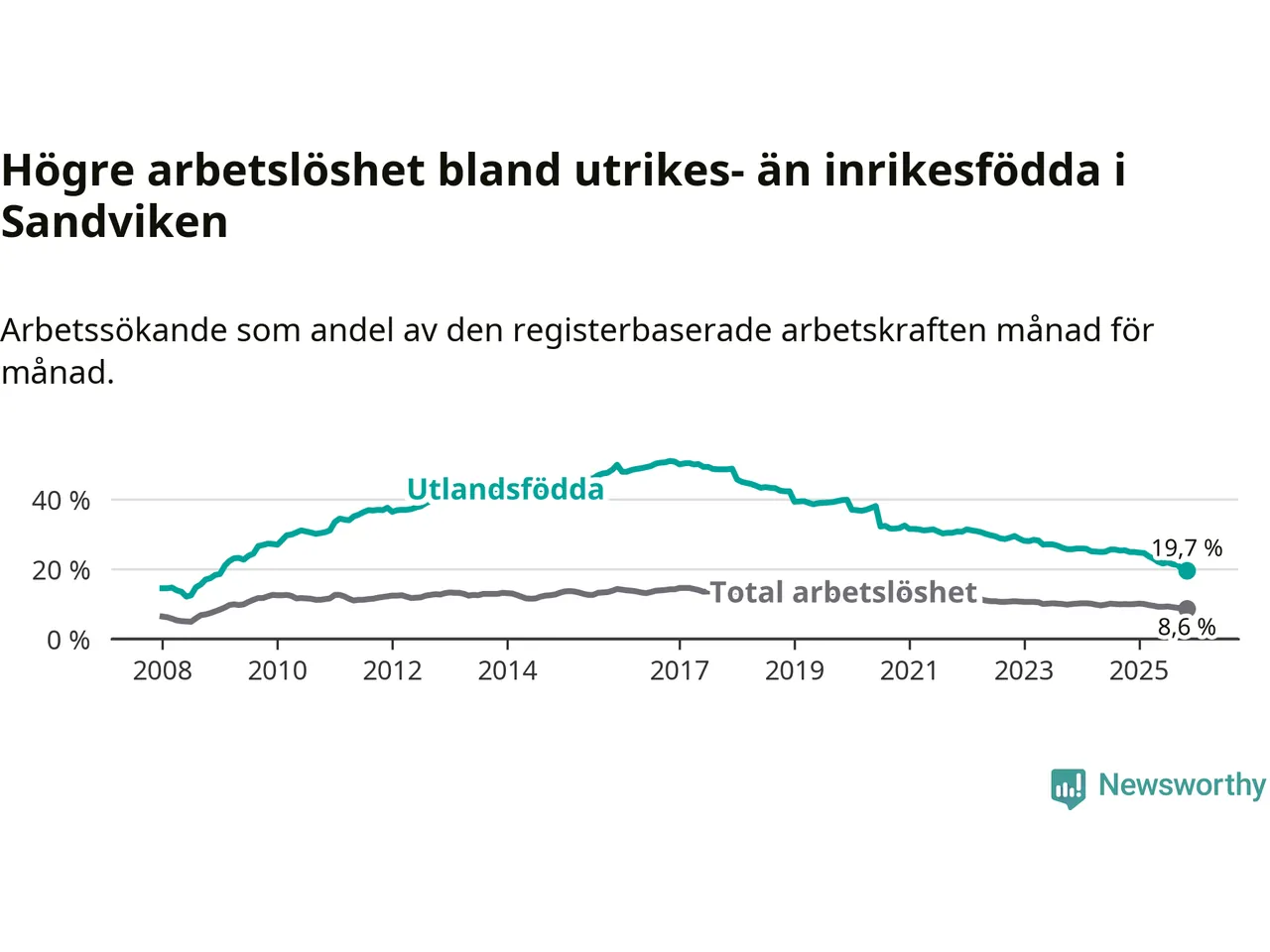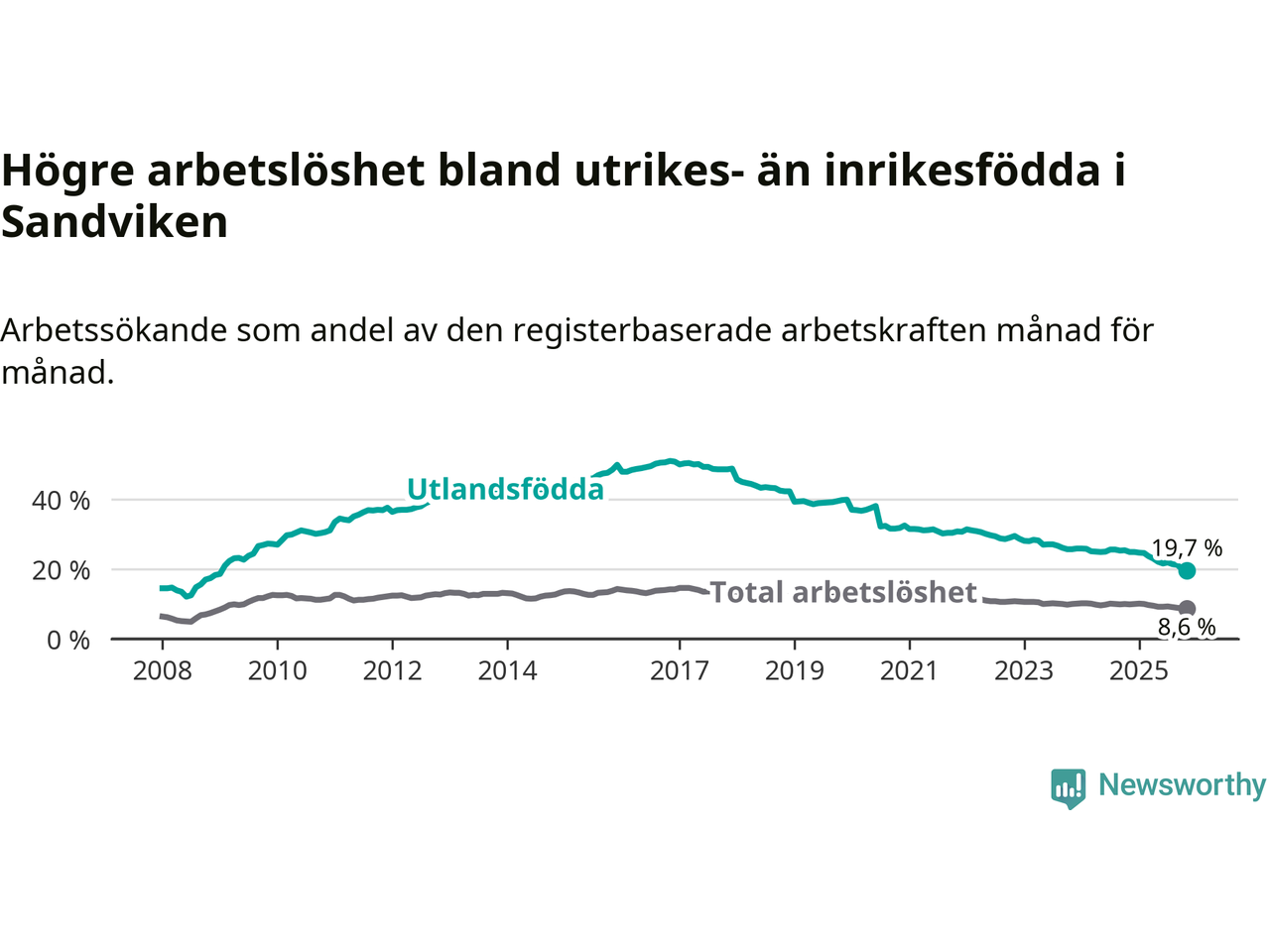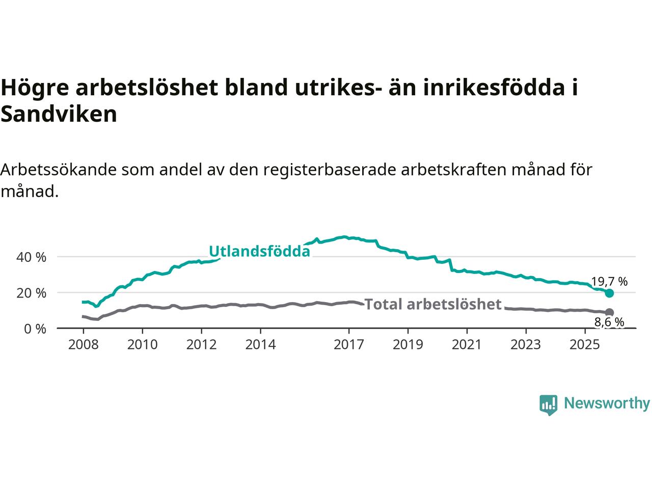 Arbetslösheten bland utlandsfödda var 19,7 procent i Sandviken under november månad, motsvarande 803 av 4 076 personer. Det är 5,2 procentenheter färre än vid samma tidpunkt i fjol (−203 om man räknar personer). Därmed har de utlandsföddas arbetslöshet varit lägre än vid samma tidpunkt i fjol i över åtta år i sträck. Sedan juni 2017 har arbetslösheten bland utlandsfödda minskat från 49,3 till 19,7 procent. Den nuvarande arbetslöshetsnivån är den lägsta sedan januari 2009.