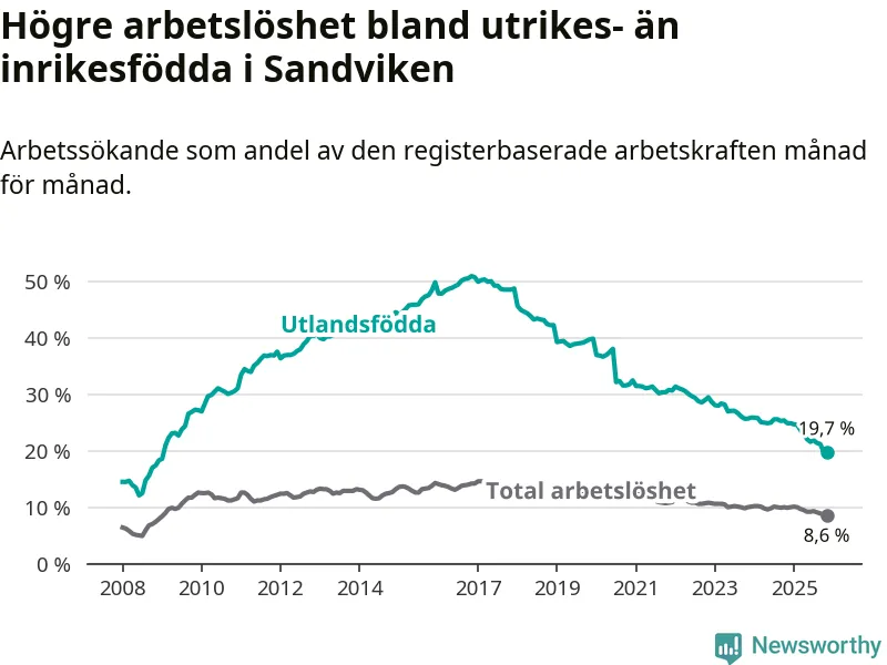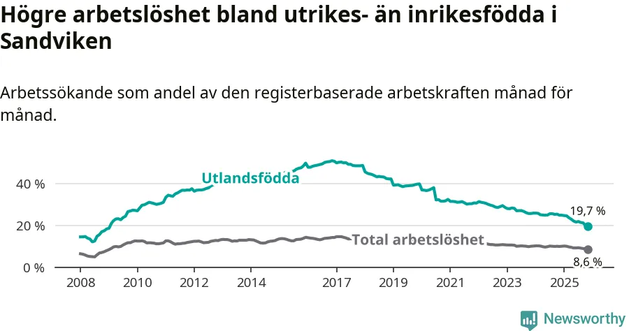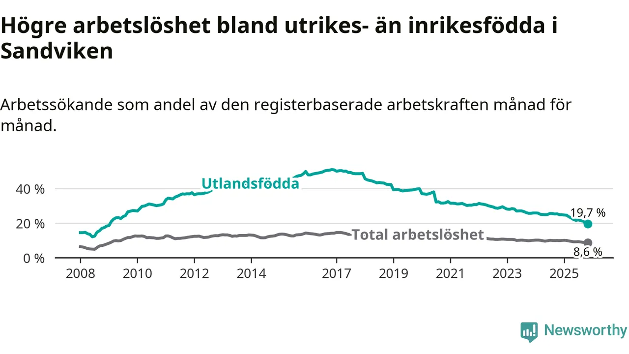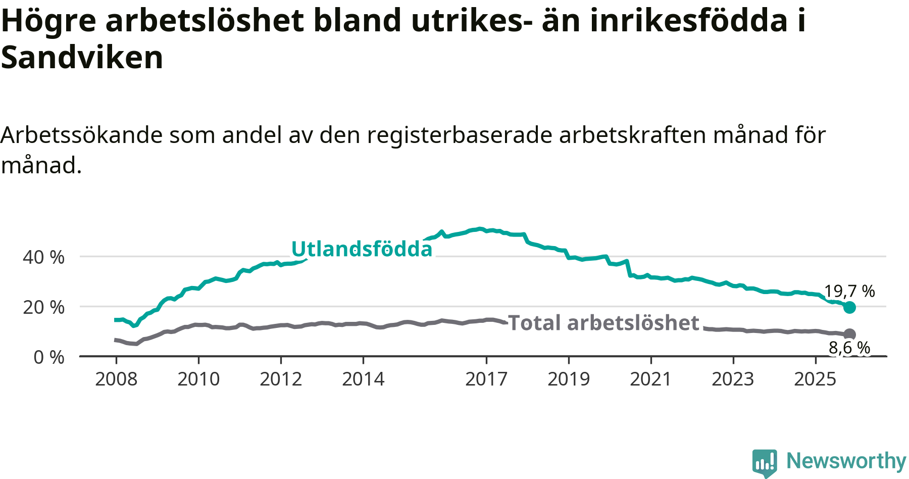 Arbetslösheten bland utlandsfödda var 19,7 procent i Sandviken under november månad, motsvarande 803 av 4 076 personer. Det är 5,2 procentenheter färre än vid samma tidpunkt i fjol (−203 om man räknar personer). Därmed har de utlandsföddas arbetslöshet varit lägre än vid samma tidpunkt i fjol i över åtta år i sträck. Sedan juni 2017 har arbetslösheten bland utlandsfödda minskat från 49,3 till 19,7 procent. Den nuvarande arbetslöshetsnivån är den lägsta sedan januari 2009.