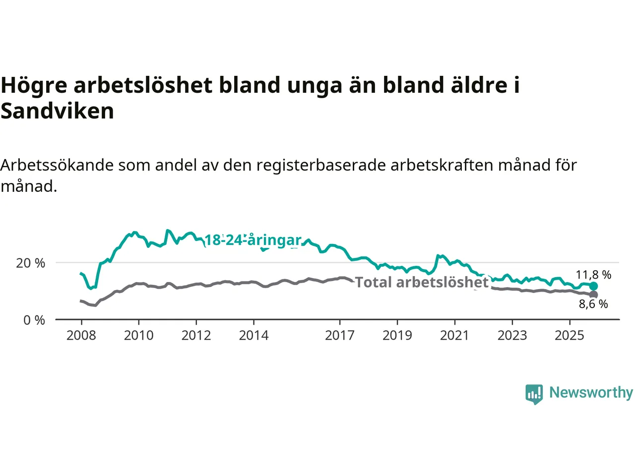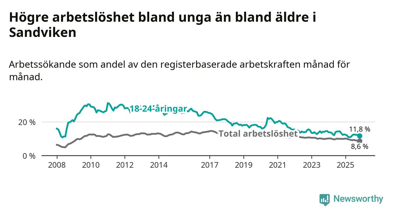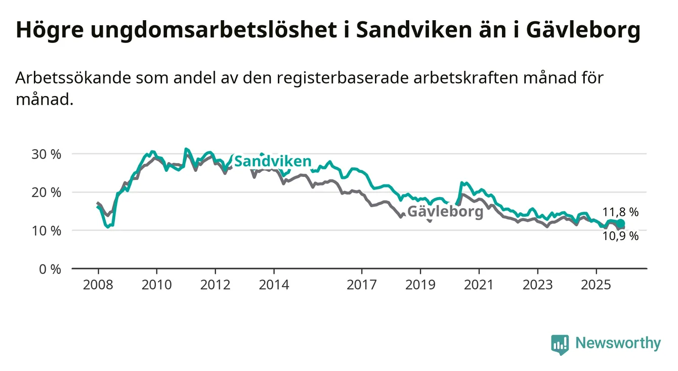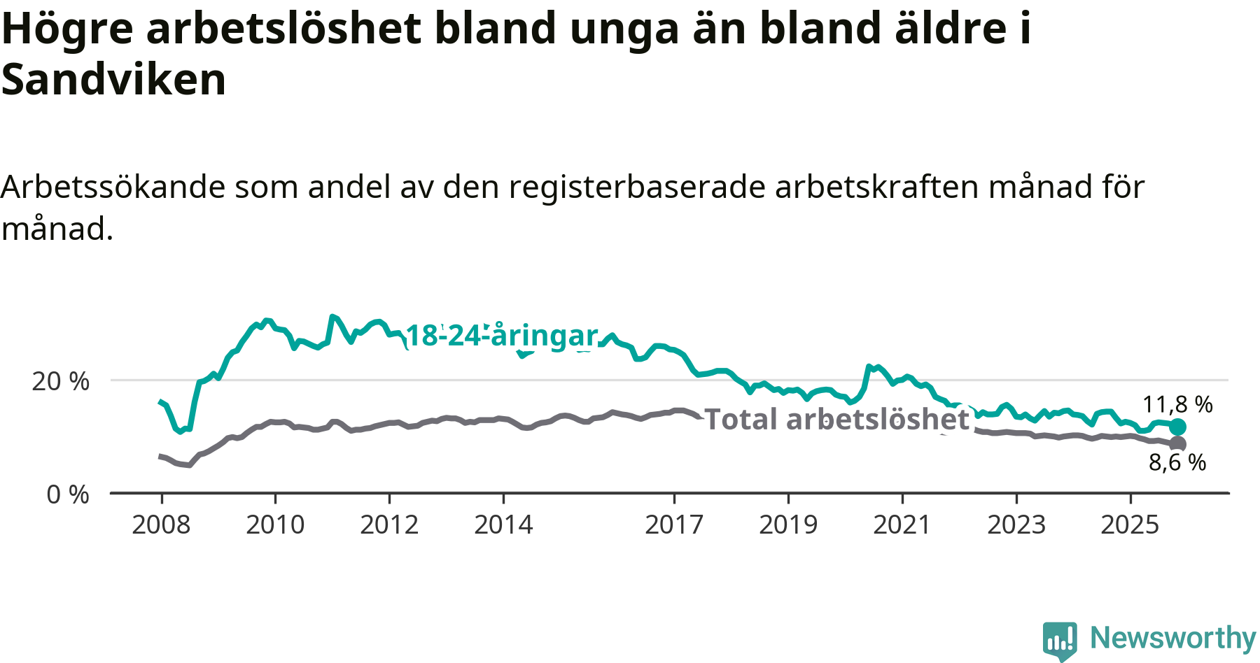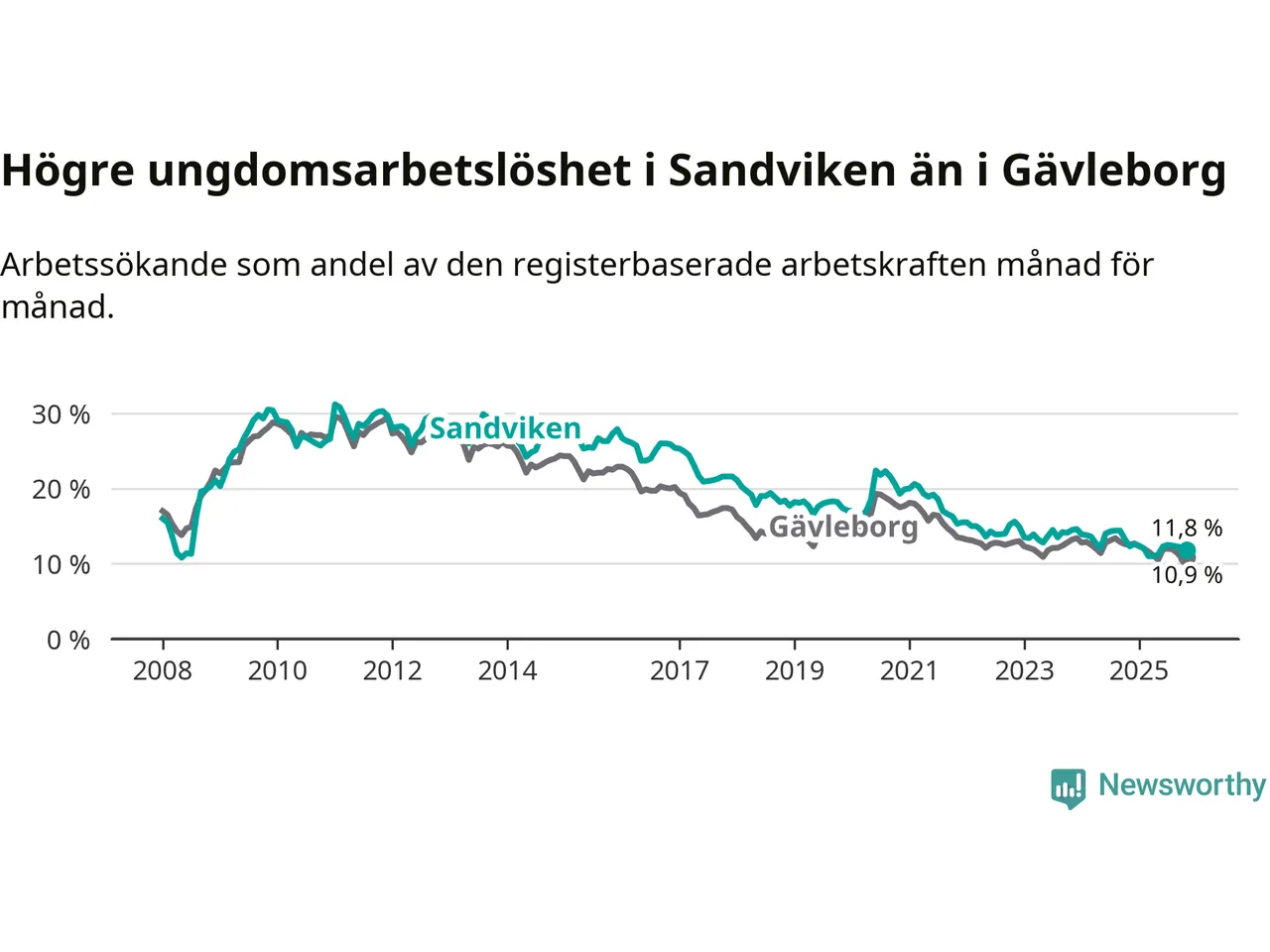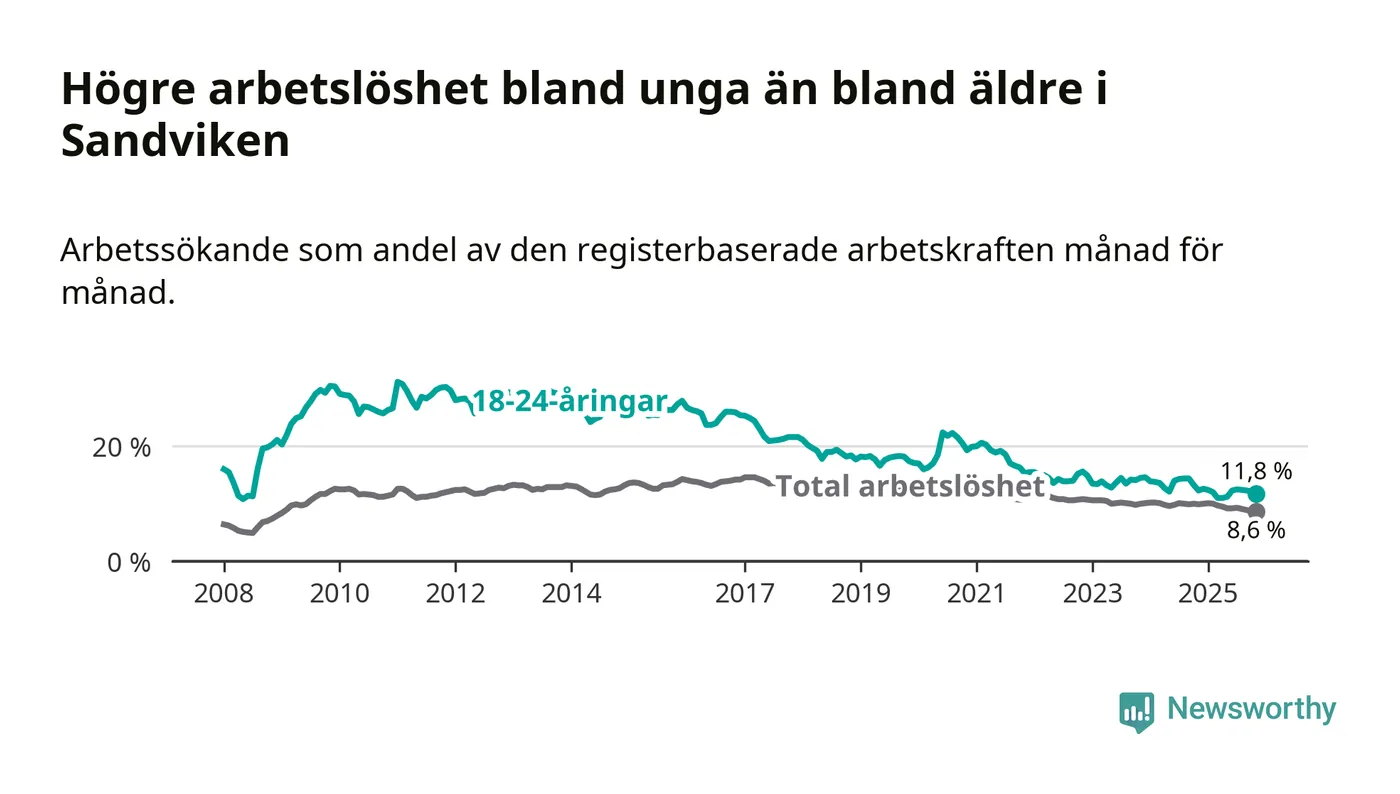 I och med den senaste månadens nedgång har de ungas arbetslöshet i Sandviken sjunkit 14 månader i följd (ner från 14,4 procent i september 2024 till 11,8 procent nu).
