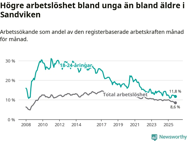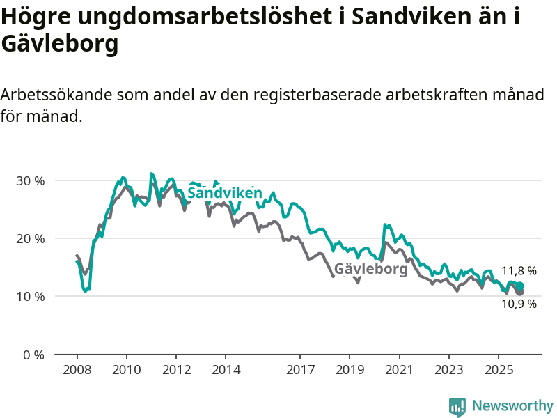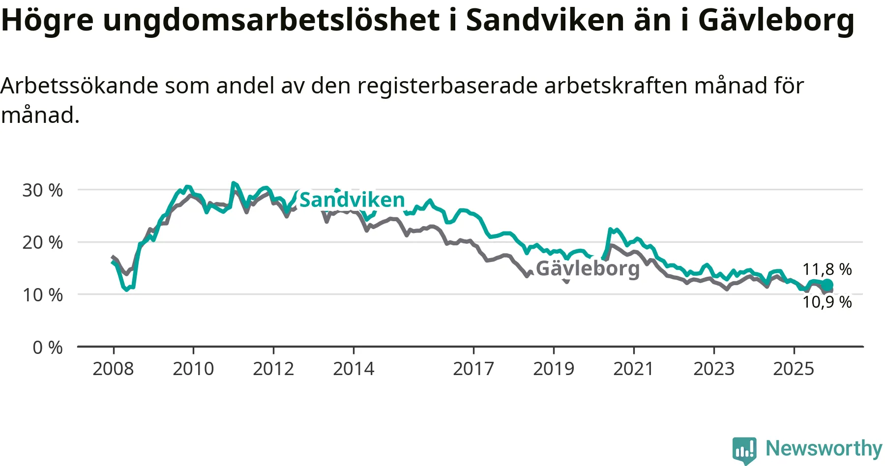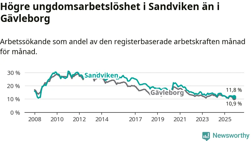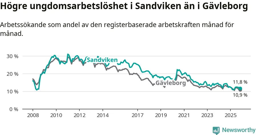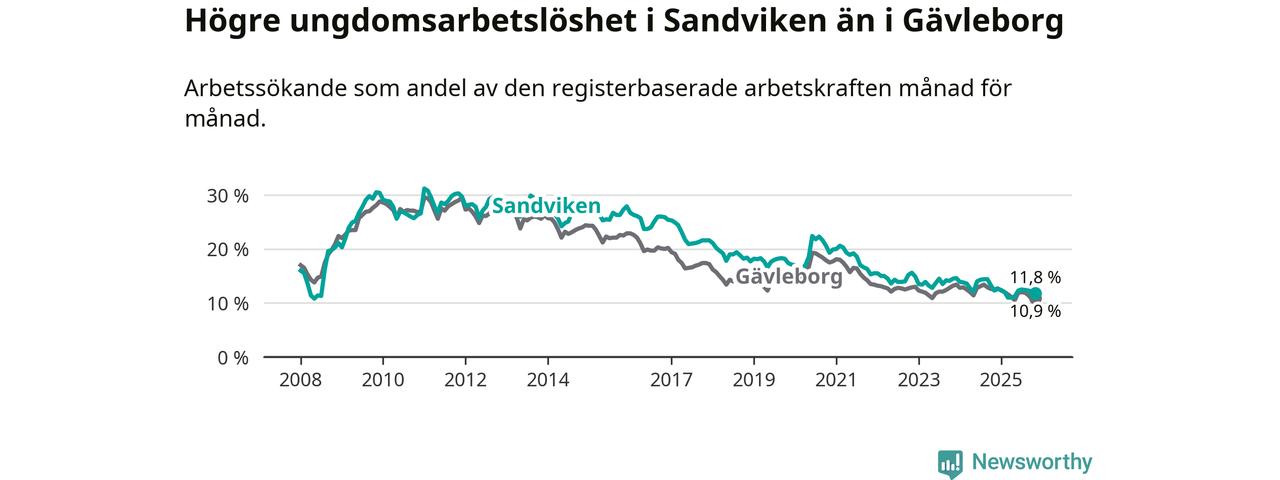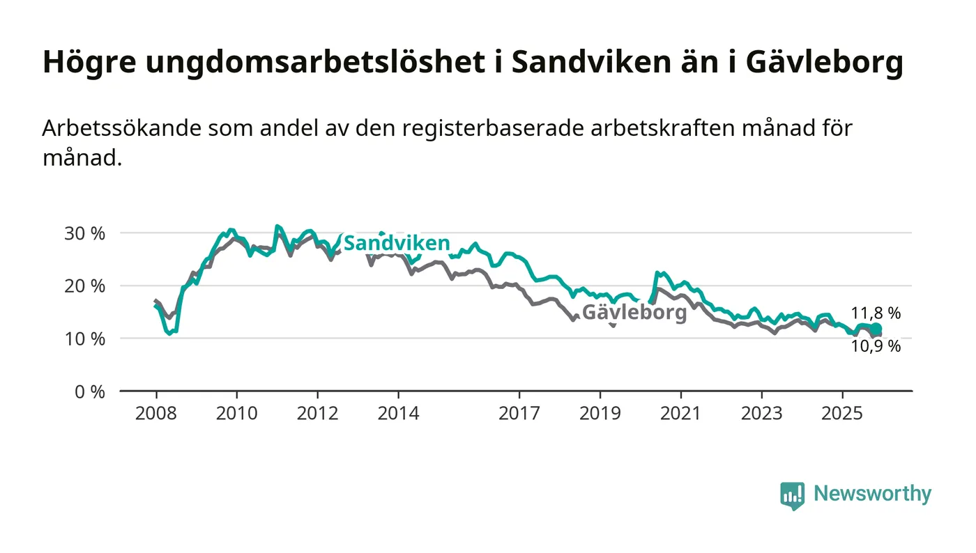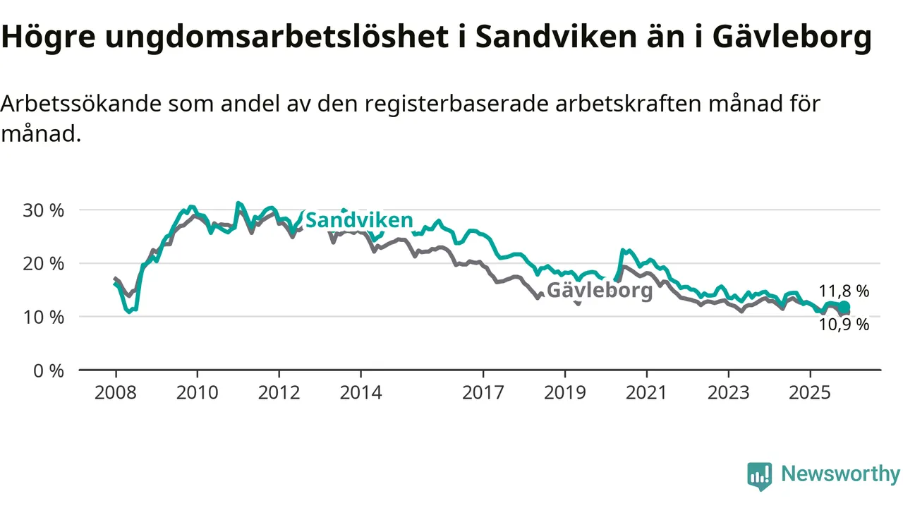 I och med den senaste månadens nedgång har de ungas arbetslöshet i Sandviken sjunkit 14 månader i följd (ner från 14,4 procent i september 2024 till 11,8 procent nu).