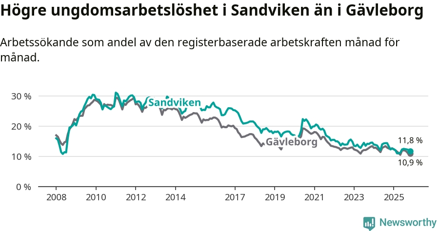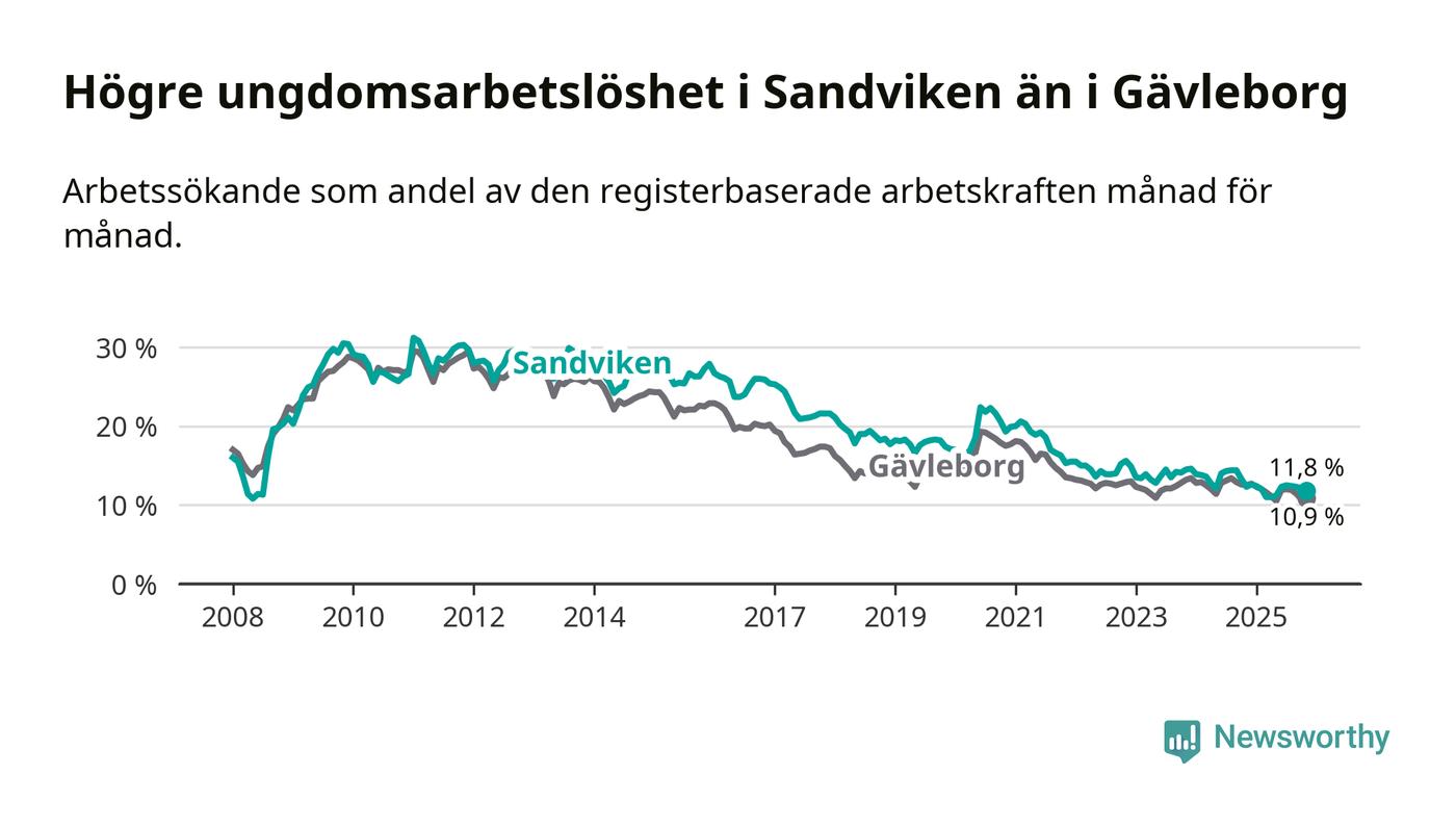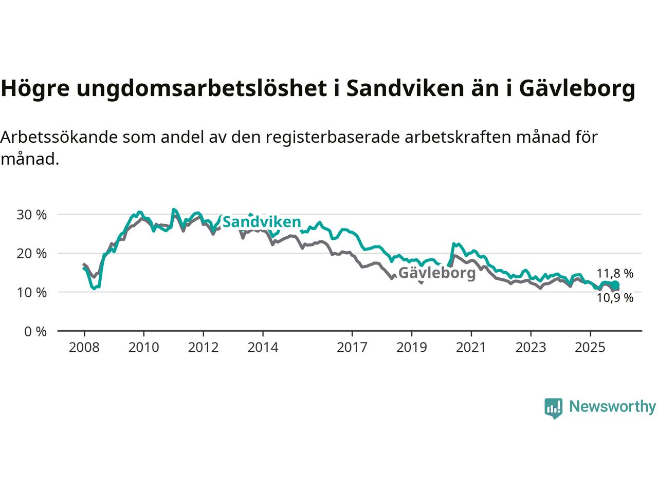 Precis som den totala arbetslösheten ligger ungdomsarbetslösheten i Sandviken högre än i Gävleborg som helhet. Skillnaden mellan kommunen och länet är 0,9 procentenheter.