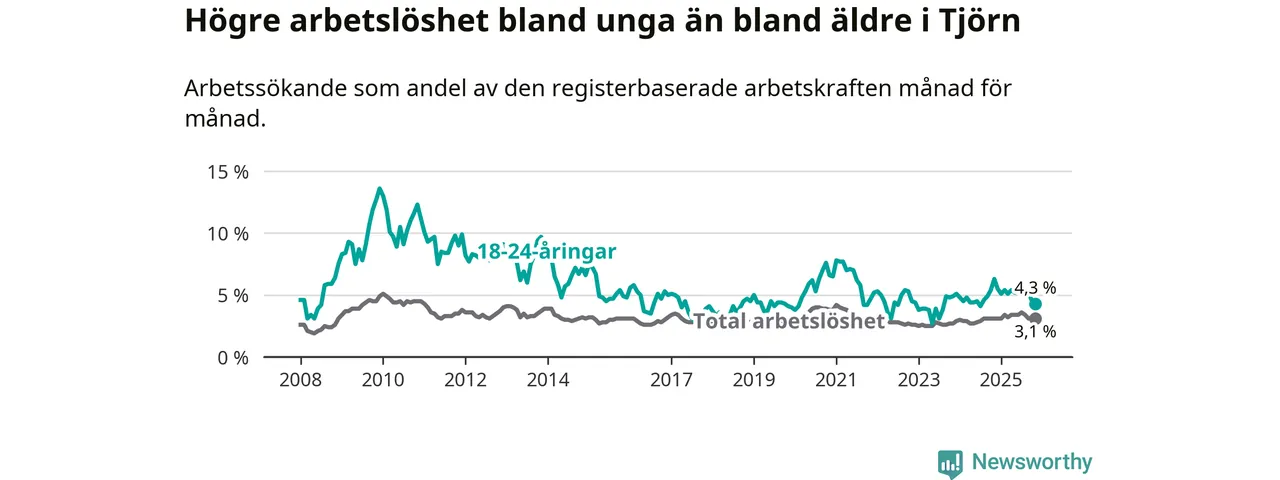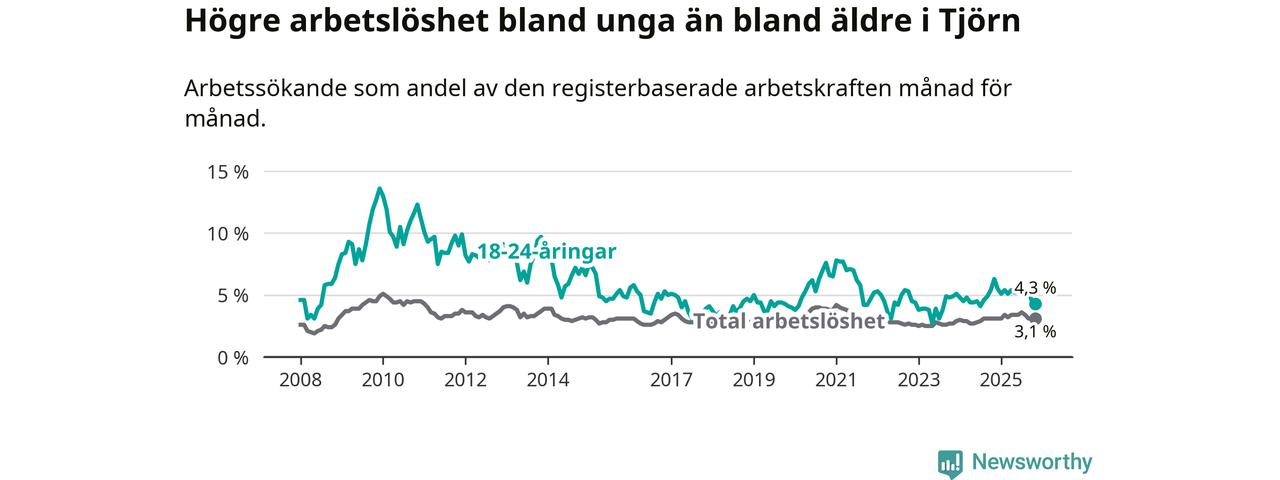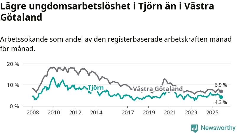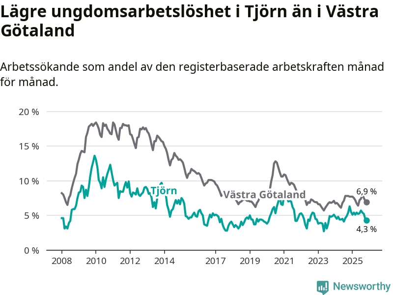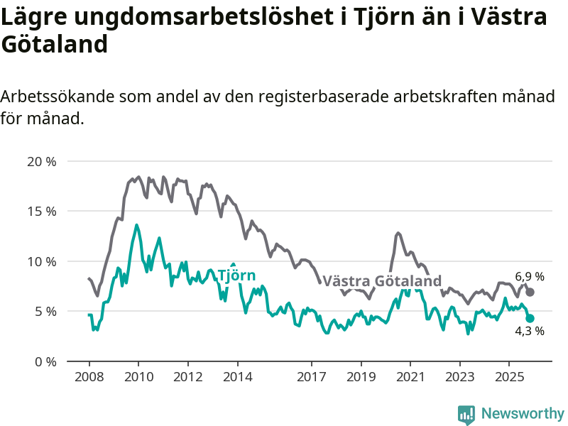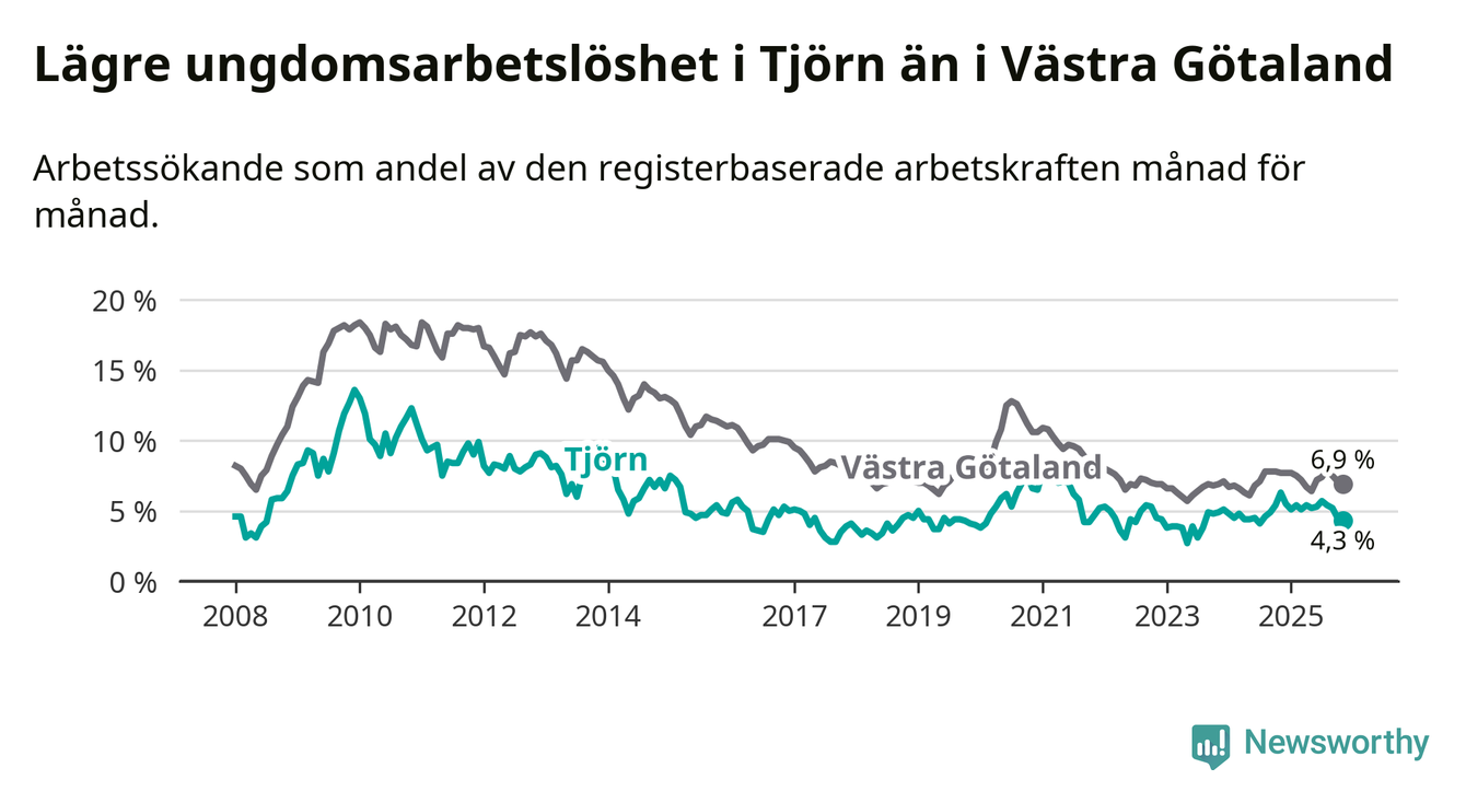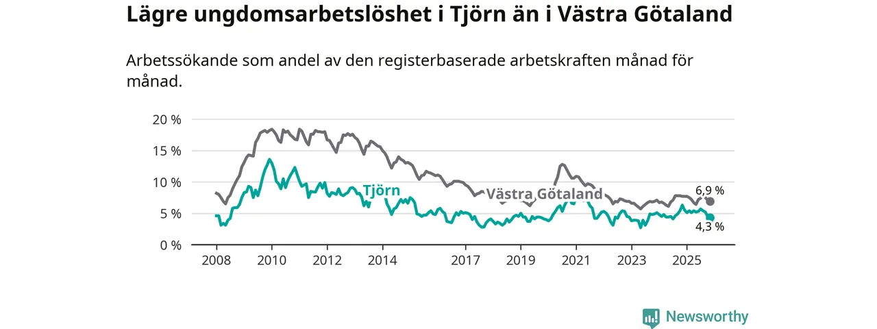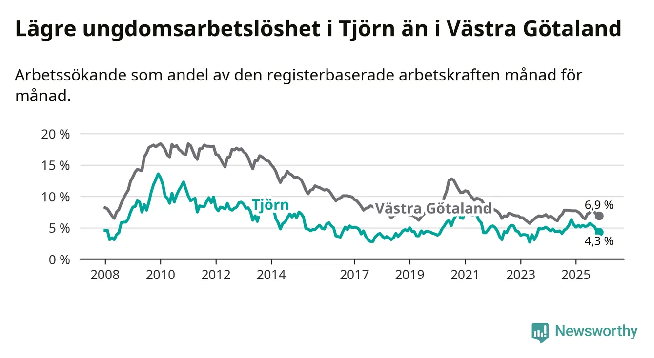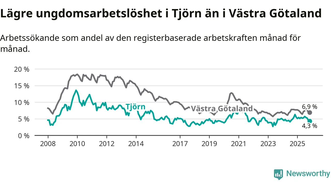 Graf: Arbetslöshet bland unga i Tjörns kommun och Västra Götalands län