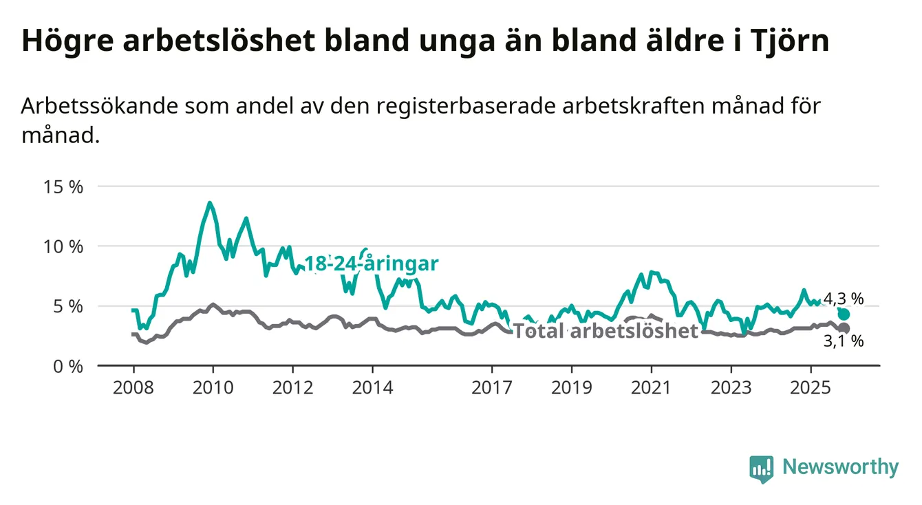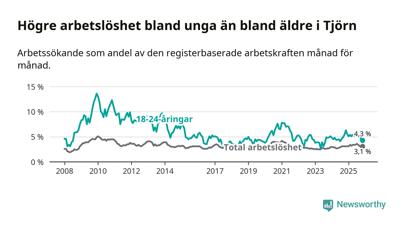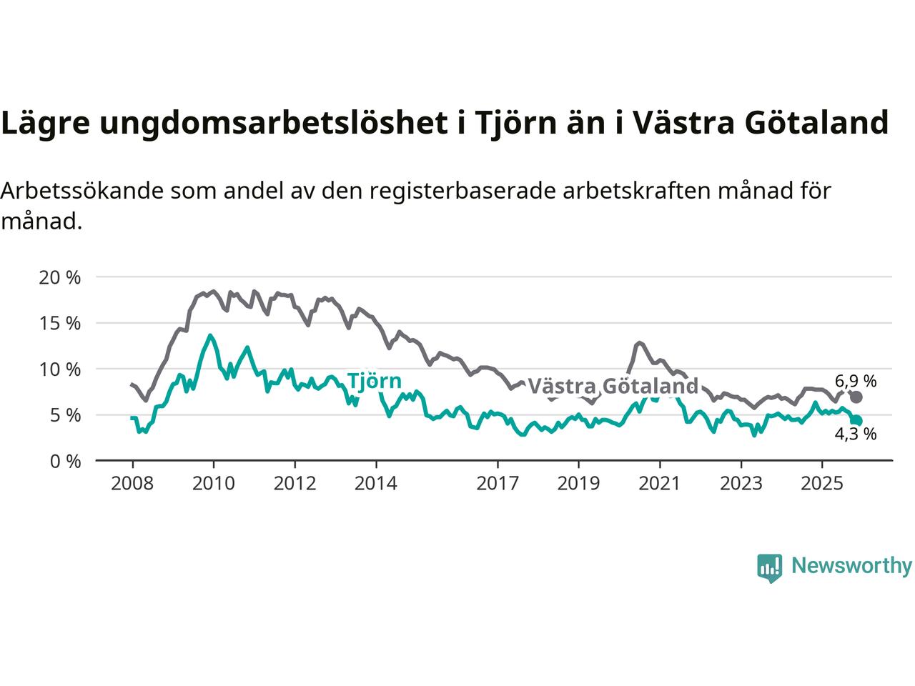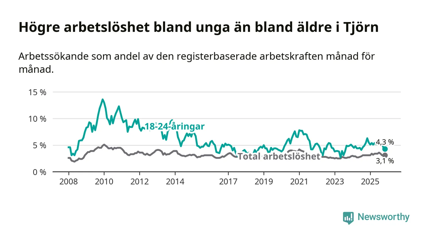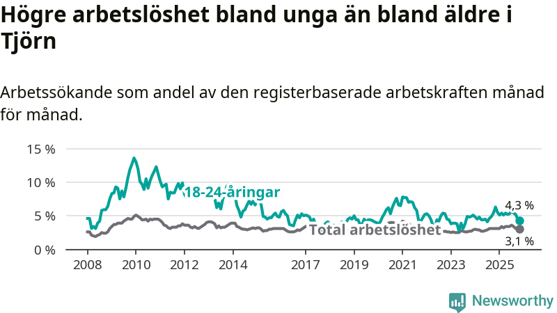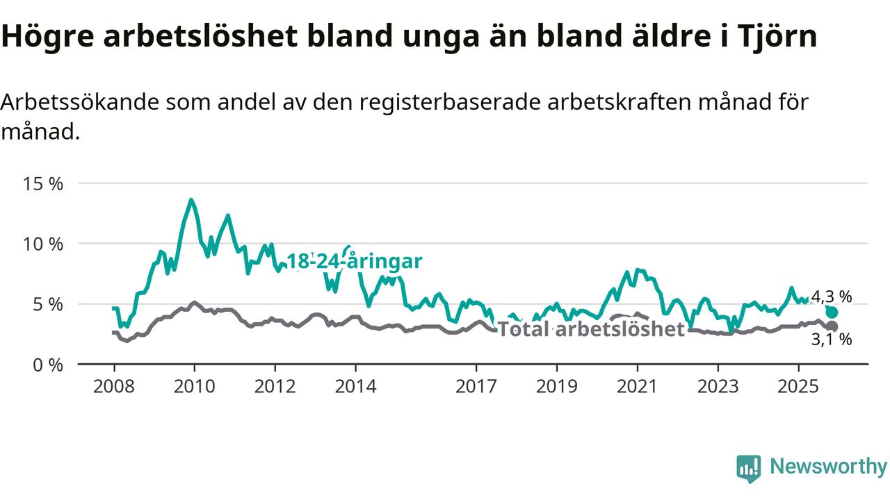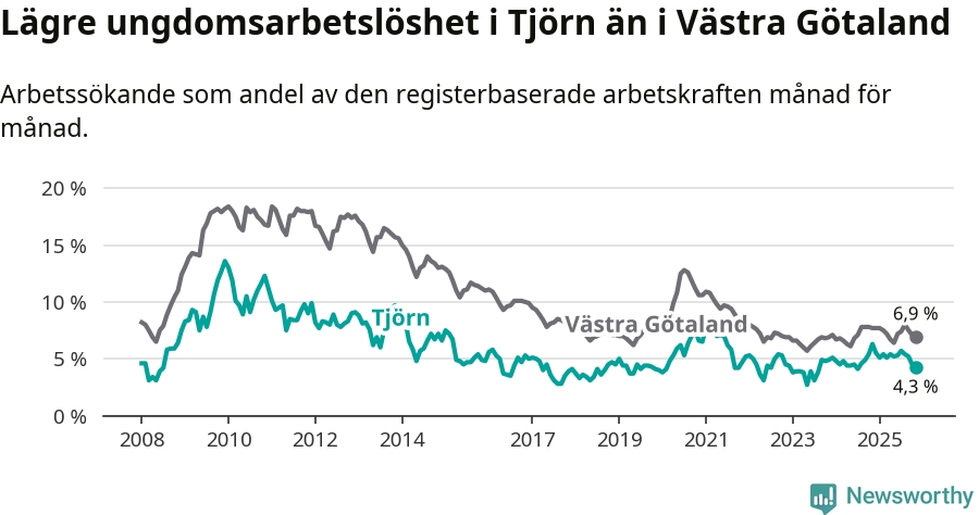 Graf: Arbetslöshet bland unga i Tjörns kommun och Västra Götalands län
