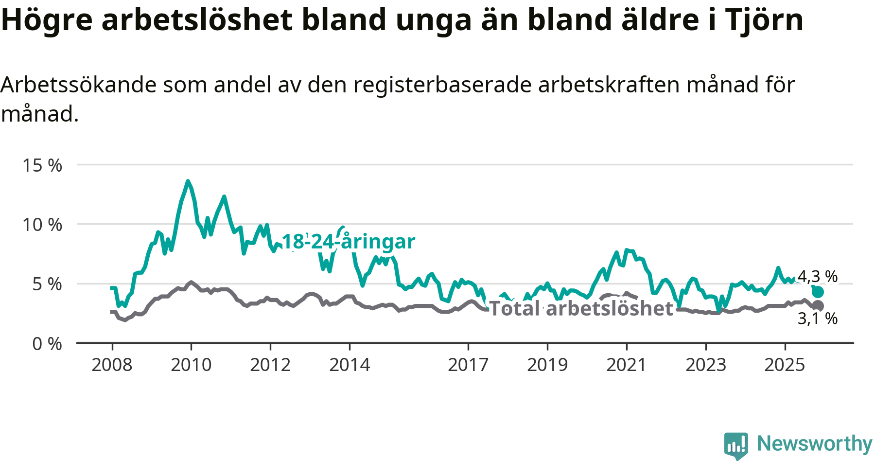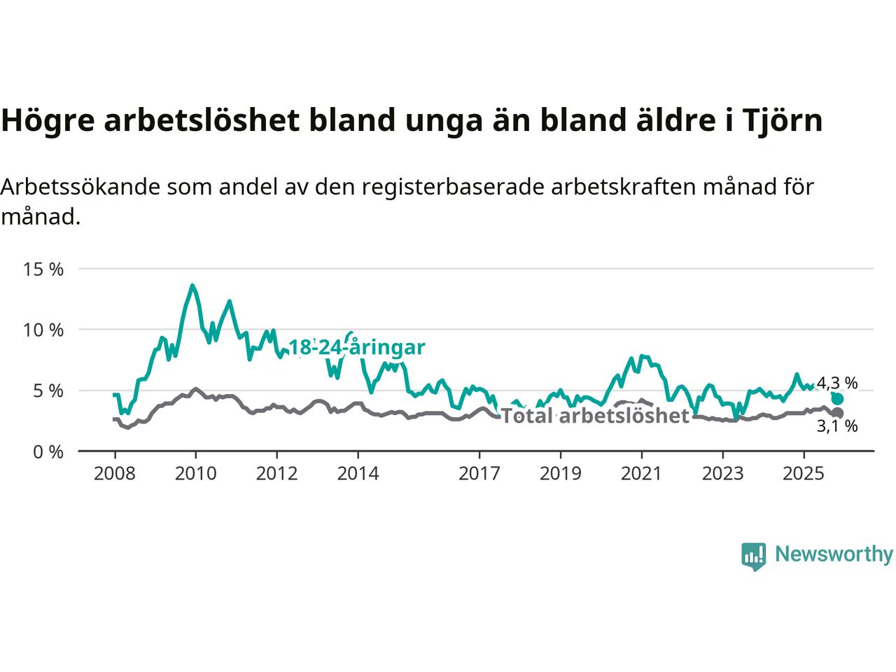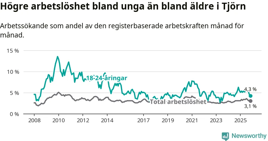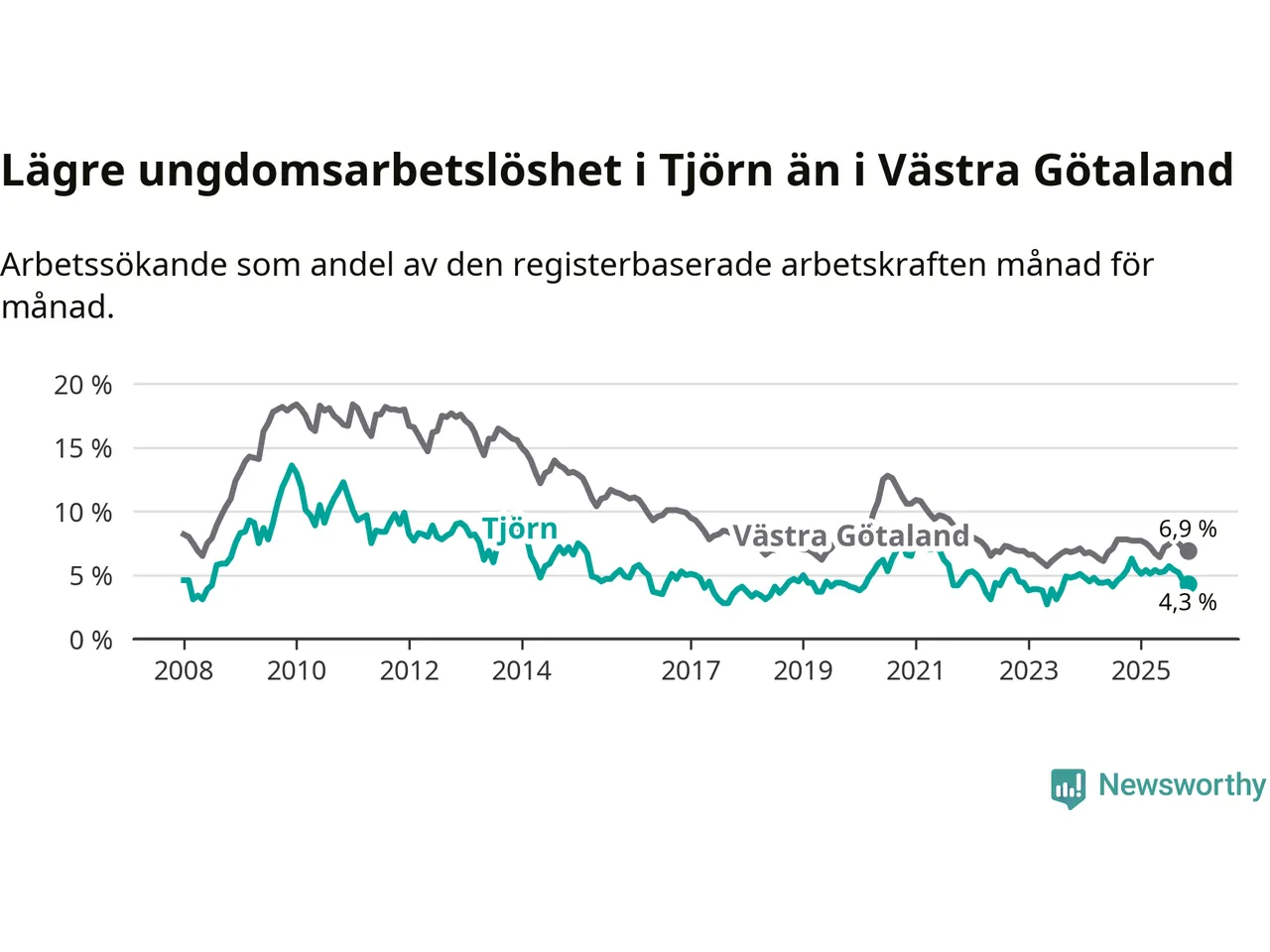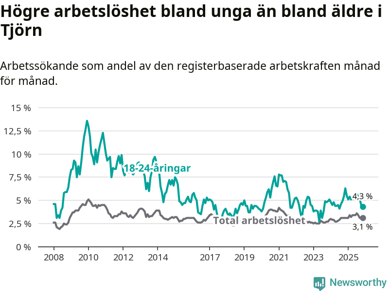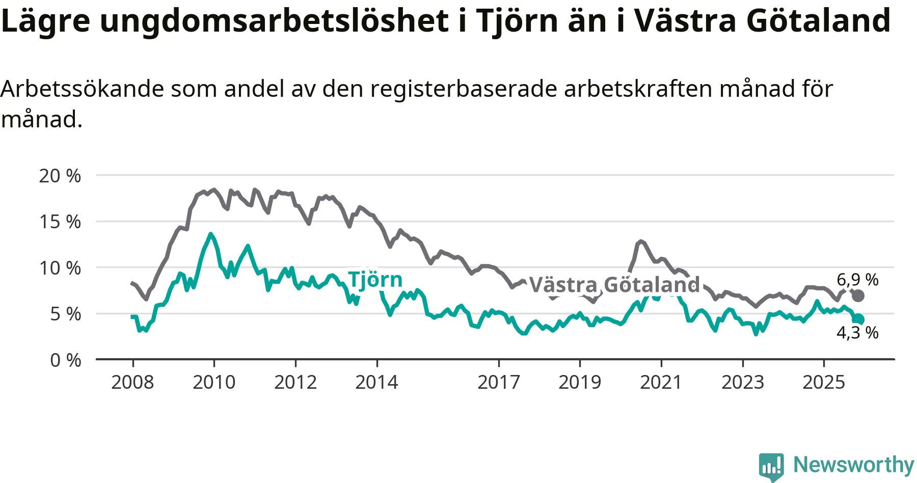 Graf: Arbetslöshet bland unga i Tjörns kommun och Västra Götalands län