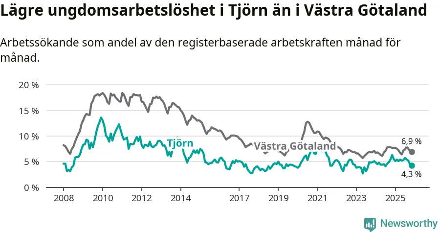 Precis som den totala arbetslösheten ligger ungdomsarbetslösheten på Tjörn lägre än i Västra Götaland som helhet. Skillnaden mellan kommunen och länet är 2,6 procentenheter.