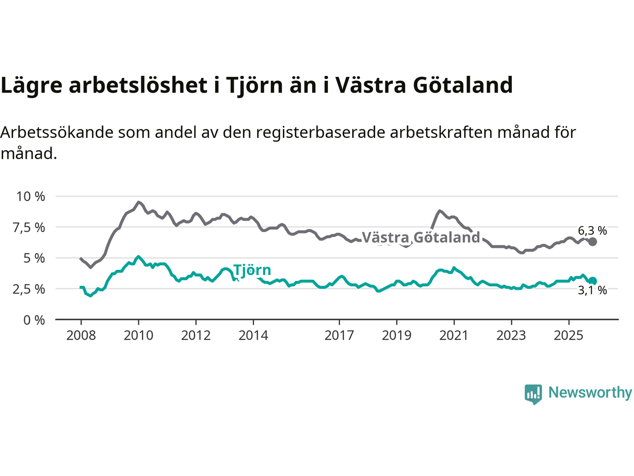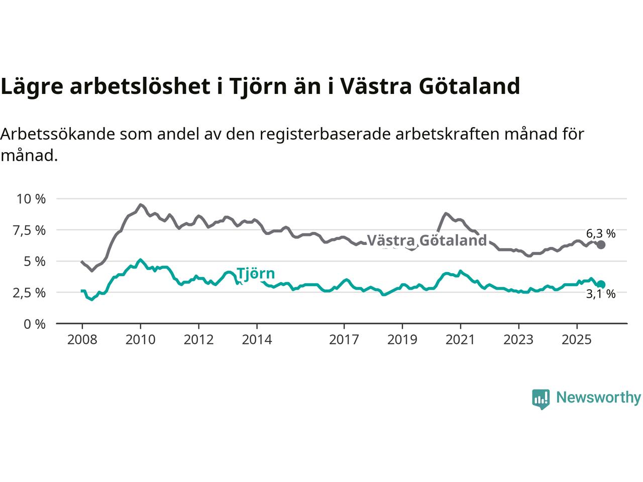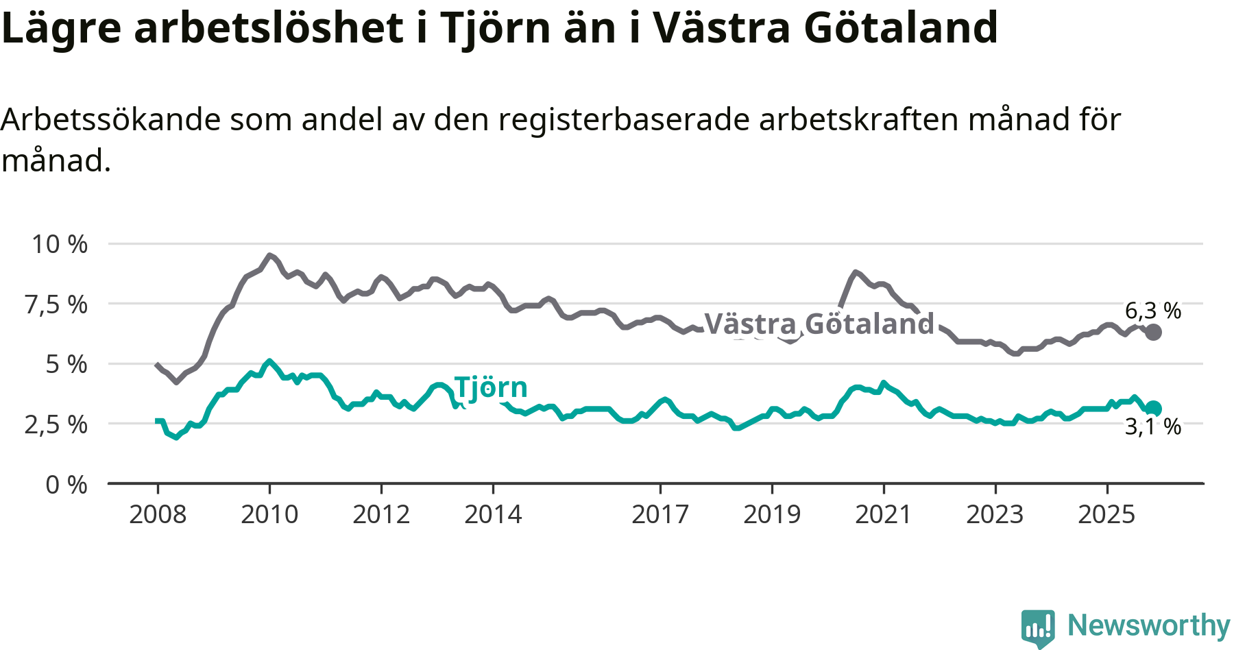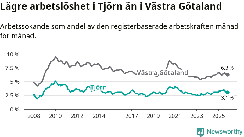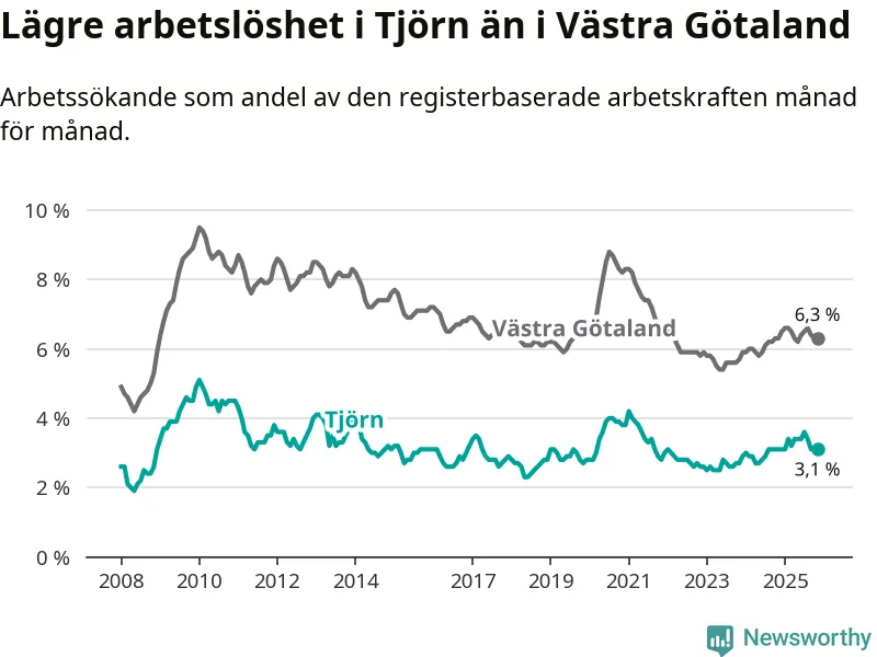 Graf: Arbetslöshet i Tjörns kommun och Västra Götalands län