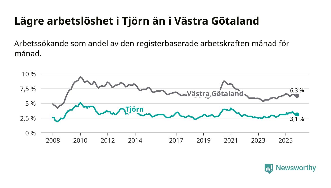Arbetslösheten på Tjörn ligger under nivån i hela Västra Götalands län (3,1 procent i kommunen, jämfört med 6,3 procent i hela länet). Öckerö har den lägsta arbetslösheten i länet (2,9 procent), medan Gullspång har den högsta (8,6 procent). För att Tjörn skulle komma ner i samma arbetslöshetsnivå som Öckerö skulle 15 personer behöva sysselsättas.