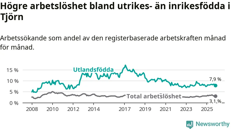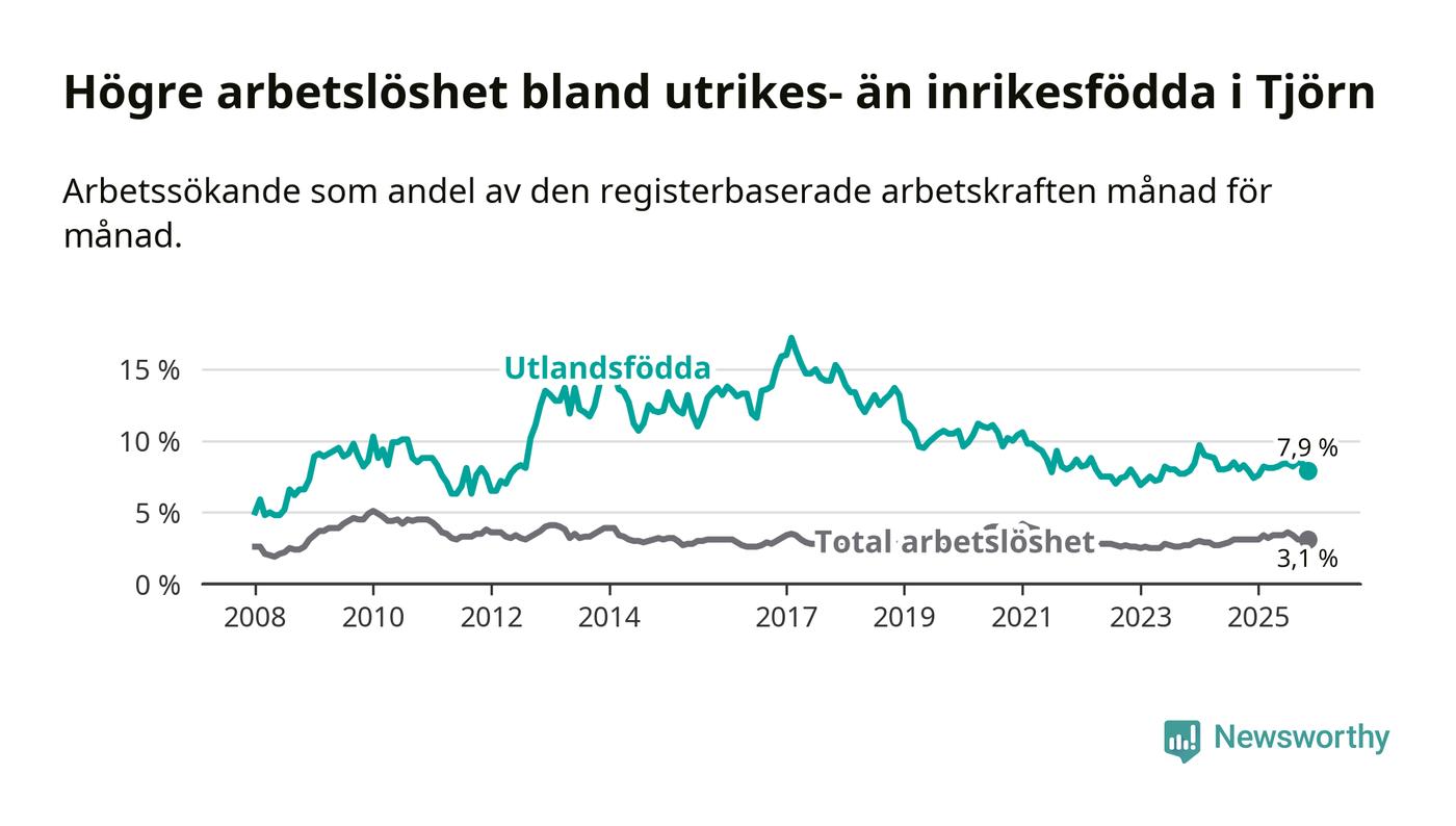 Den här skillnaden i arbetslöshet mellan inrikes- och utrikesfödda är förhållandevis stor på Tjörn om man jämför med andra kommuner i Västra Götaland. Lilla Edet har, relativt sett, den minsta skillnaden i arbetslöshet mellan inrikes- och utrikes födda i länet. Karlsborg har den största.
