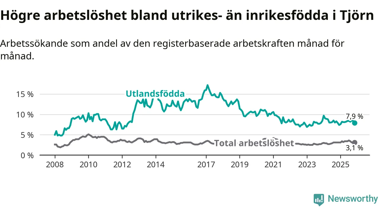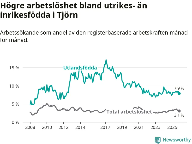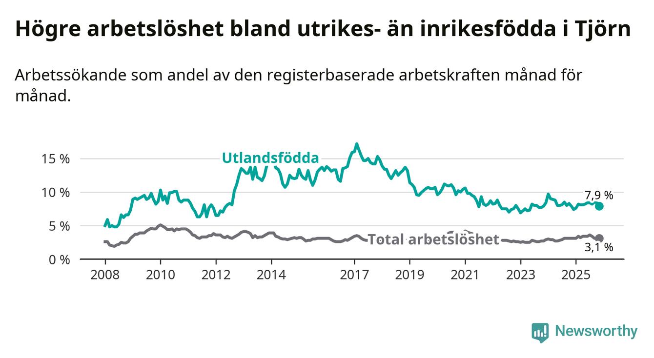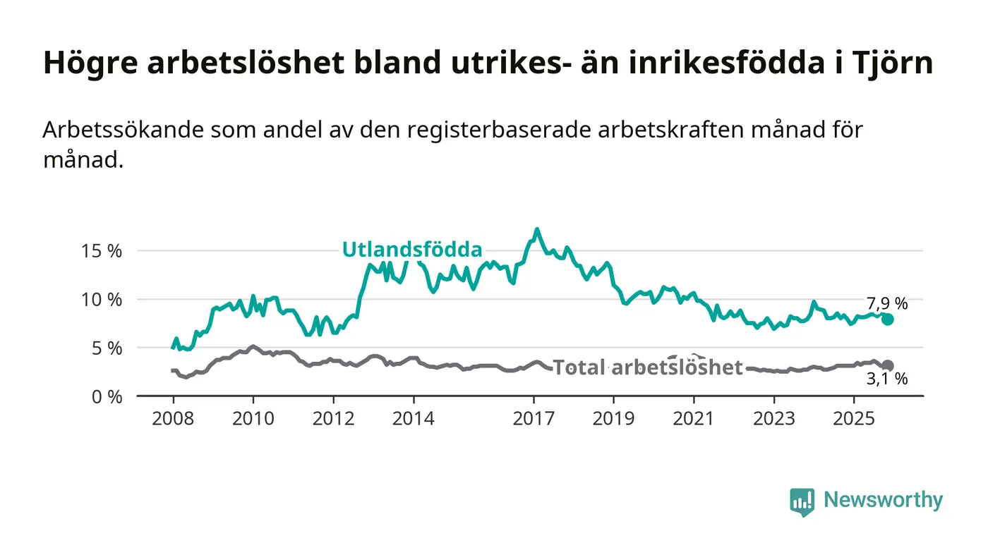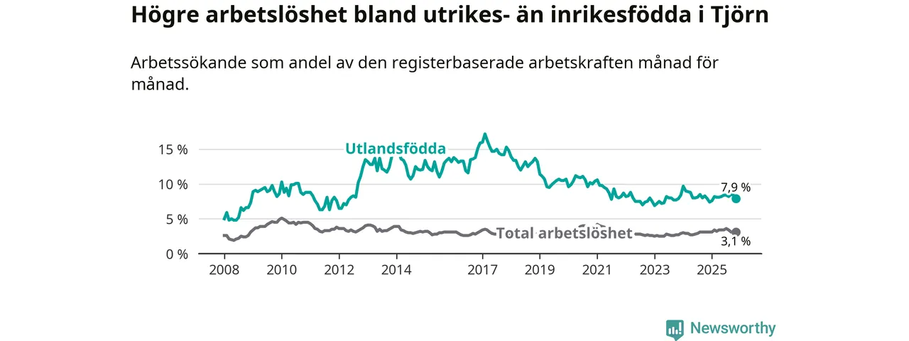 Arbetslösheten bland utlandsfödda var 7,9 procent på Tjörn under november månad, motsvarande 64 av 810 personer. Det är i stort sett lika stor andel som i fjol.