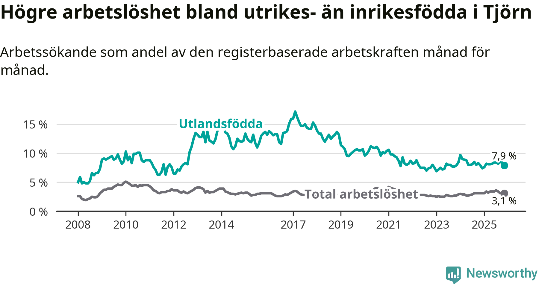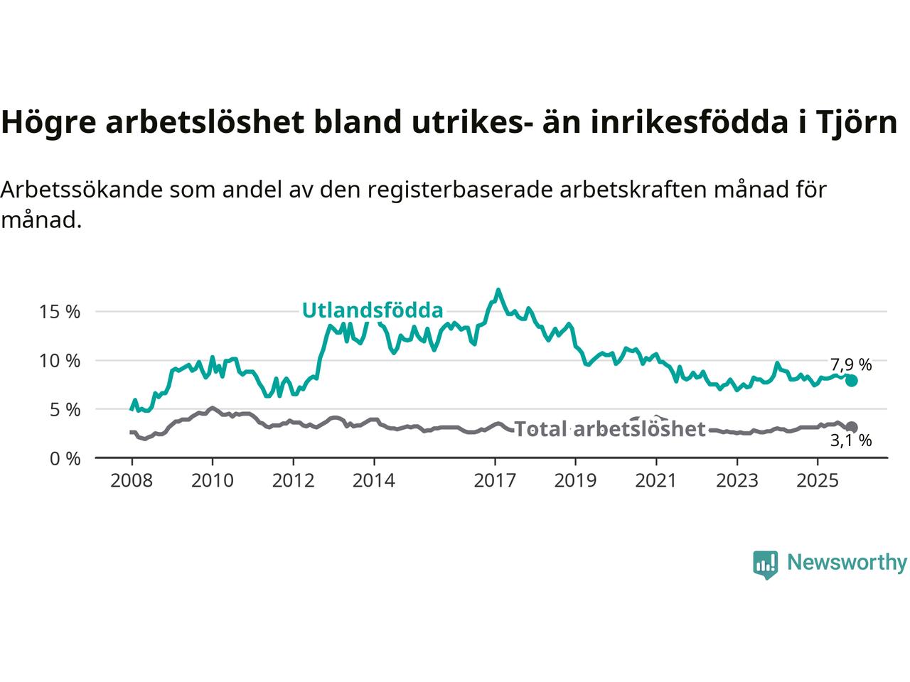 Graf: Skillnad i arbetslöshet mellan utrikesfödda och hela befolkningen i Tjörns kommun