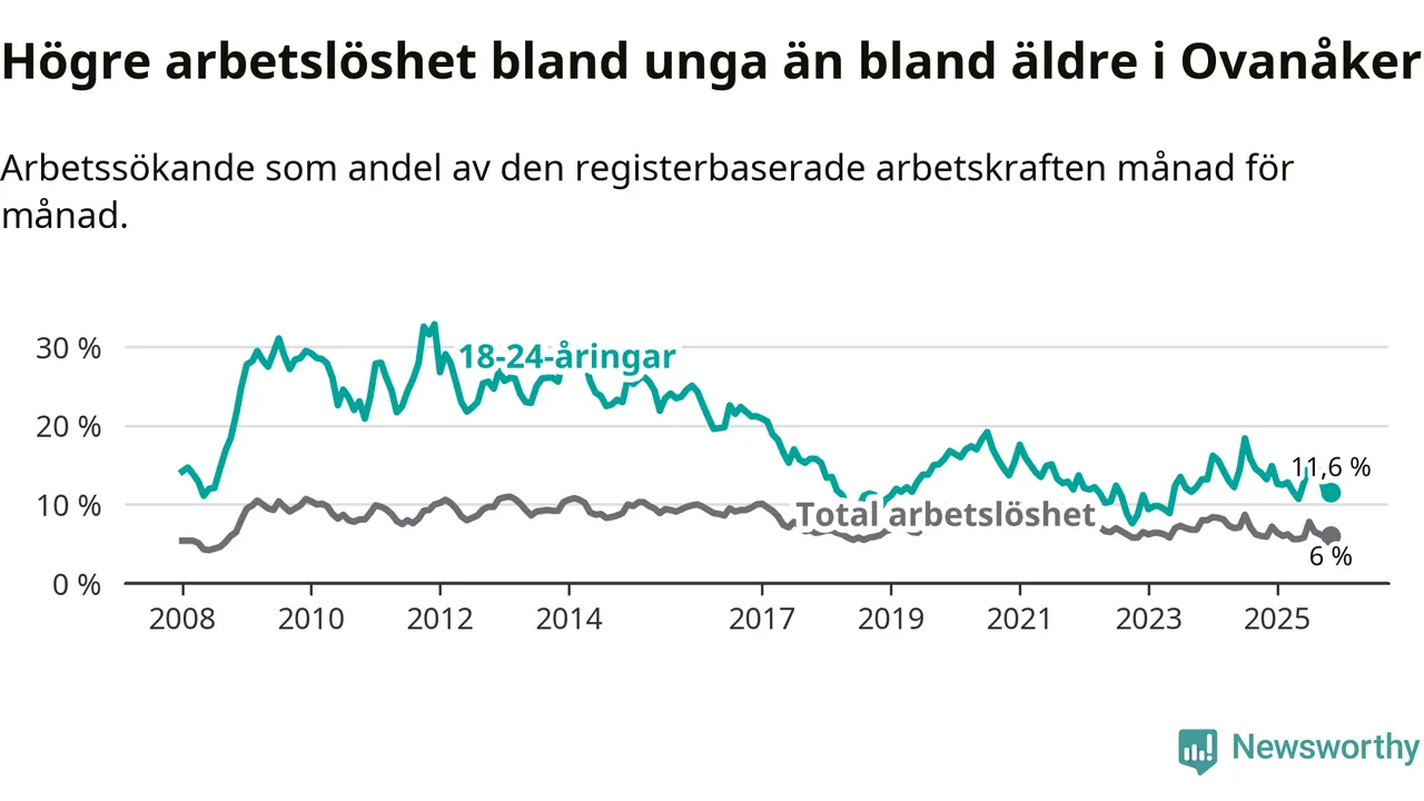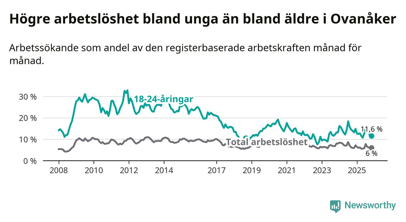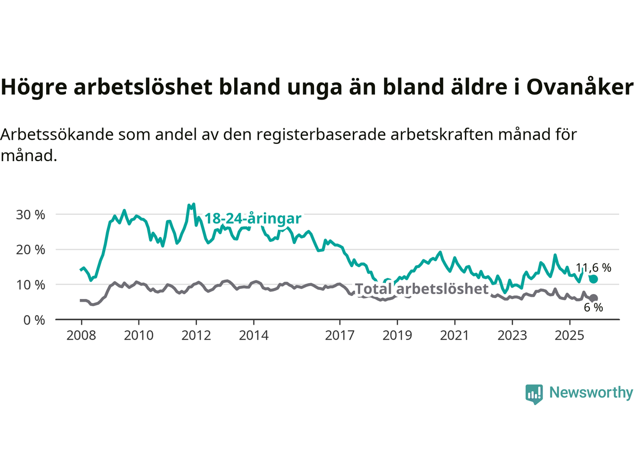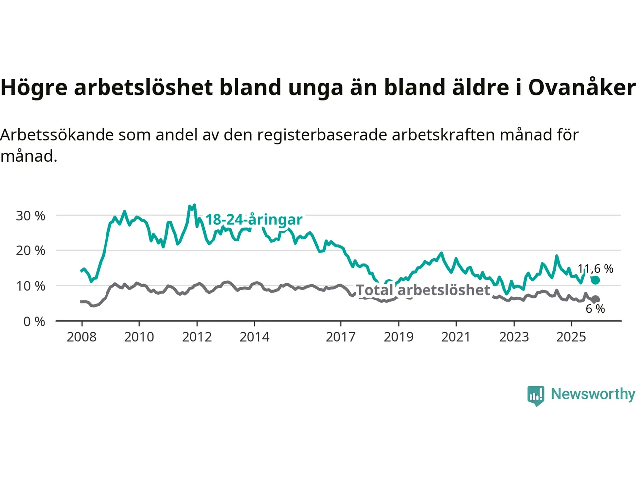I och med den senaste månadens nedgång har de ungas arbetslöshet i Ovanåker sjunkit elva månader i följd (ner från 14,9 procent i december 2024 till 11,6 procent nu).
