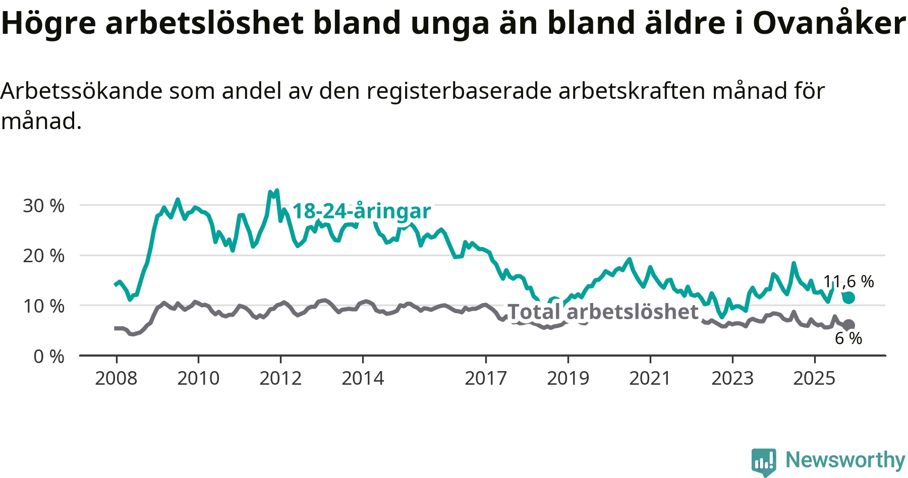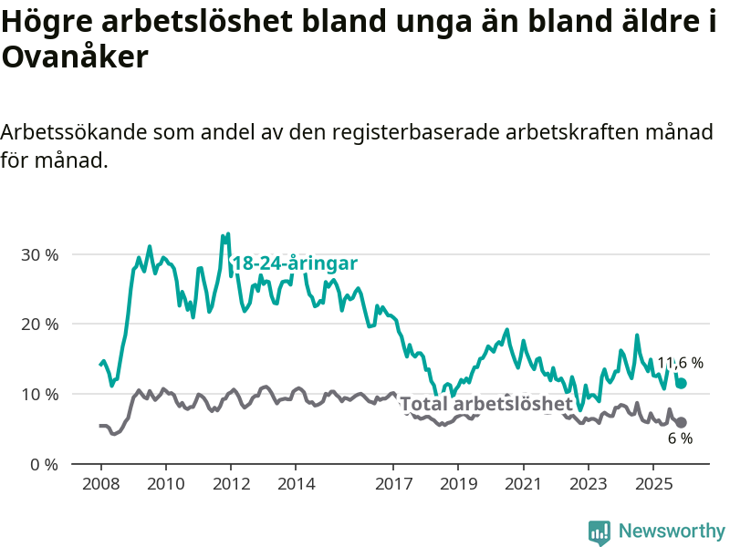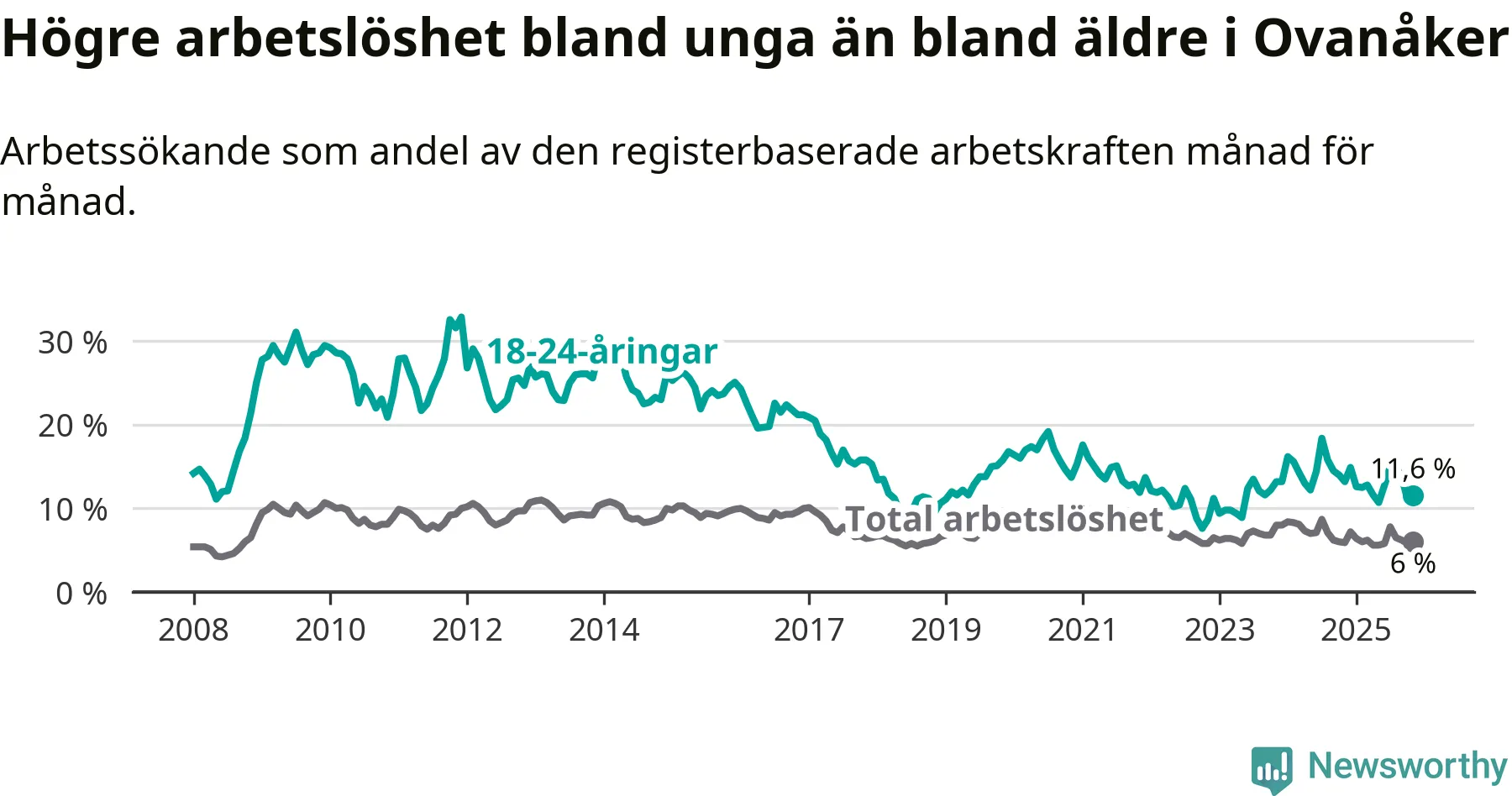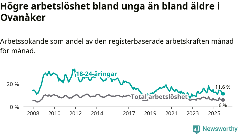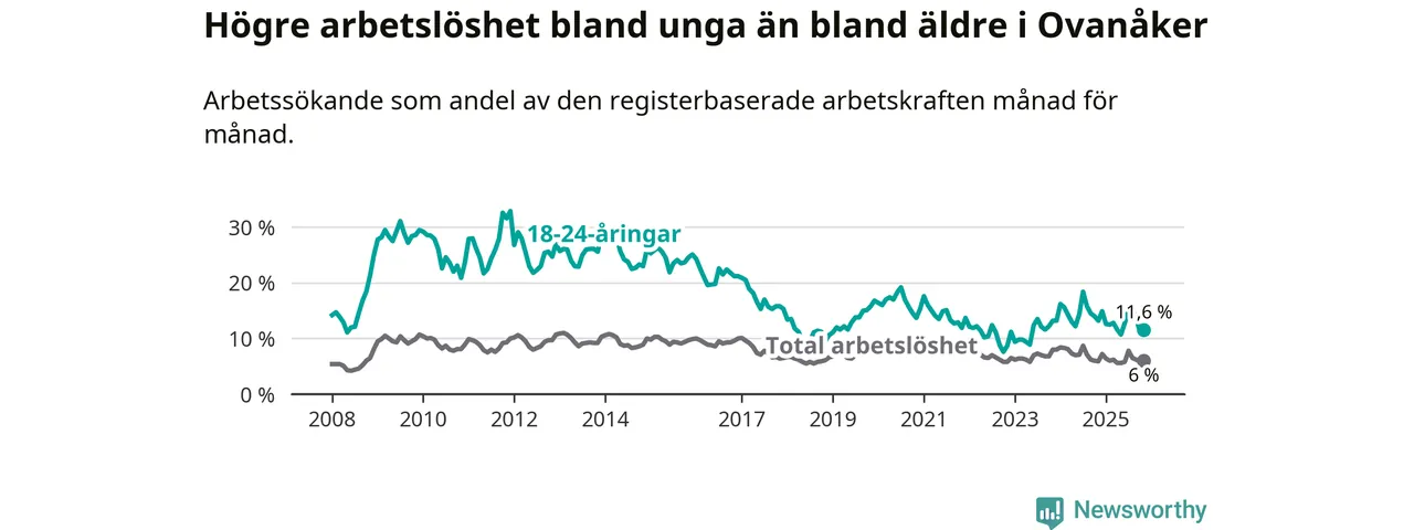 I och med den senaste månadens nedgång har de ungas arbetslöshet i Ovanåker sjunkit elva månader i följd (ner från 14,9 procent i december 2024 till 11,6 procent nu).