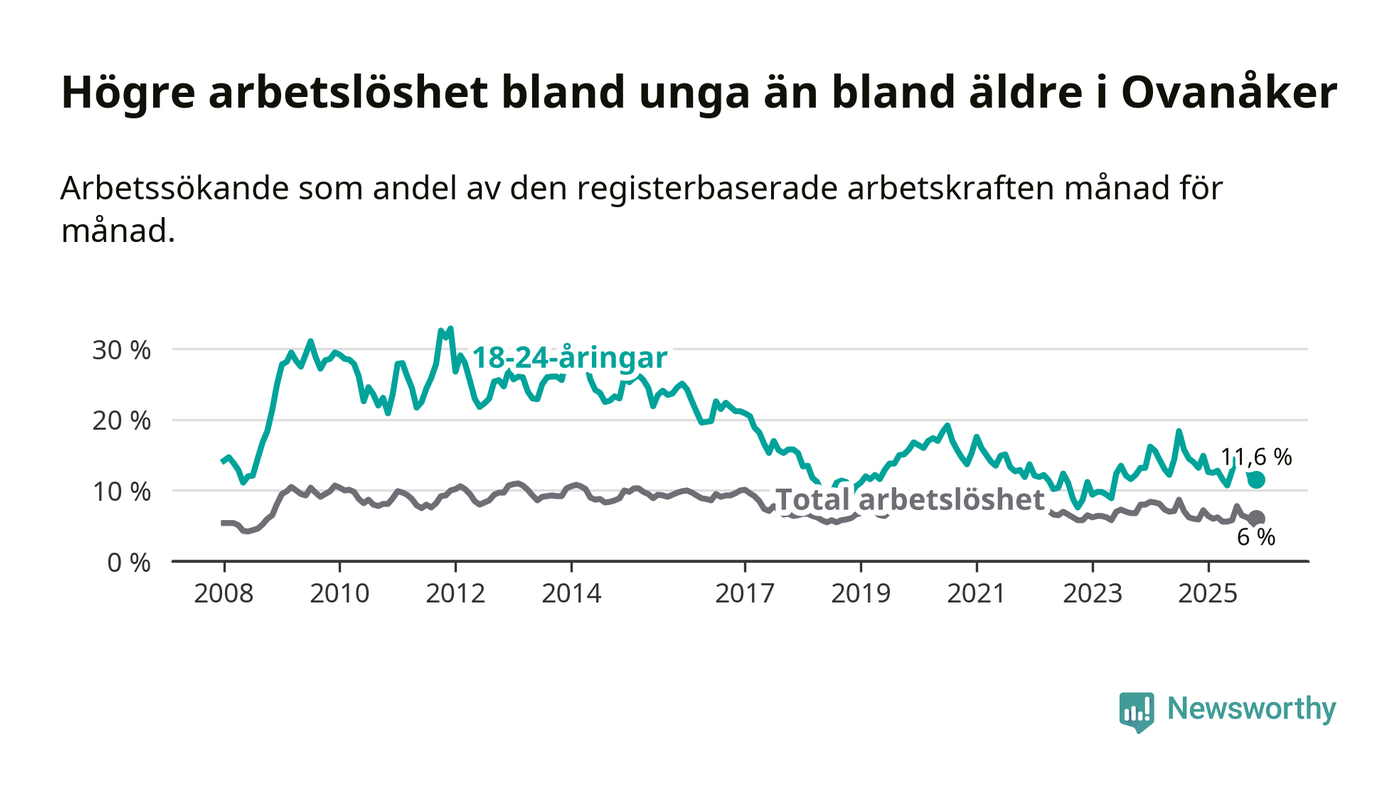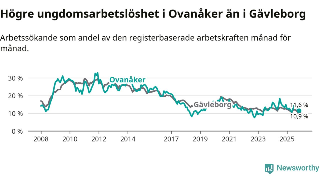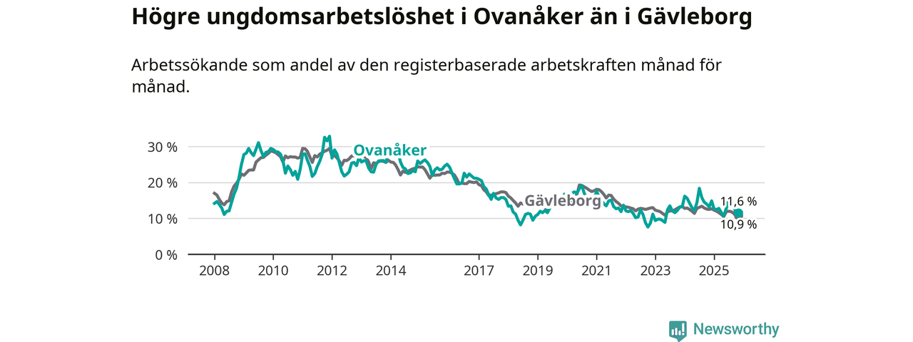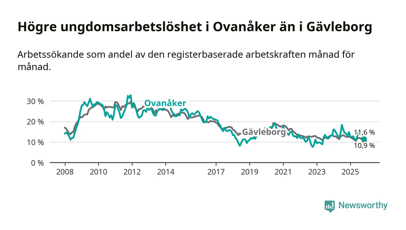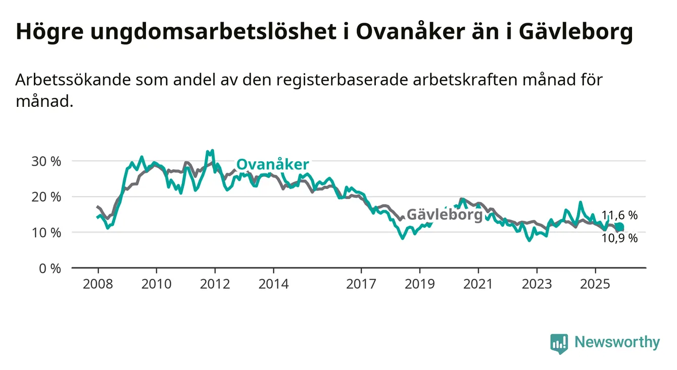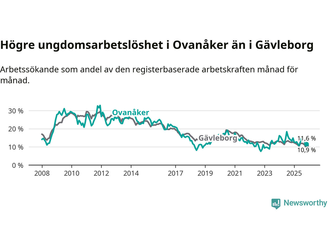 Medan Ovanåker har lägre total arbetslöshet än Gävleborg, ligger ungdomsarbetslösheten 0,7 procentenheter högre i Ovanåker.