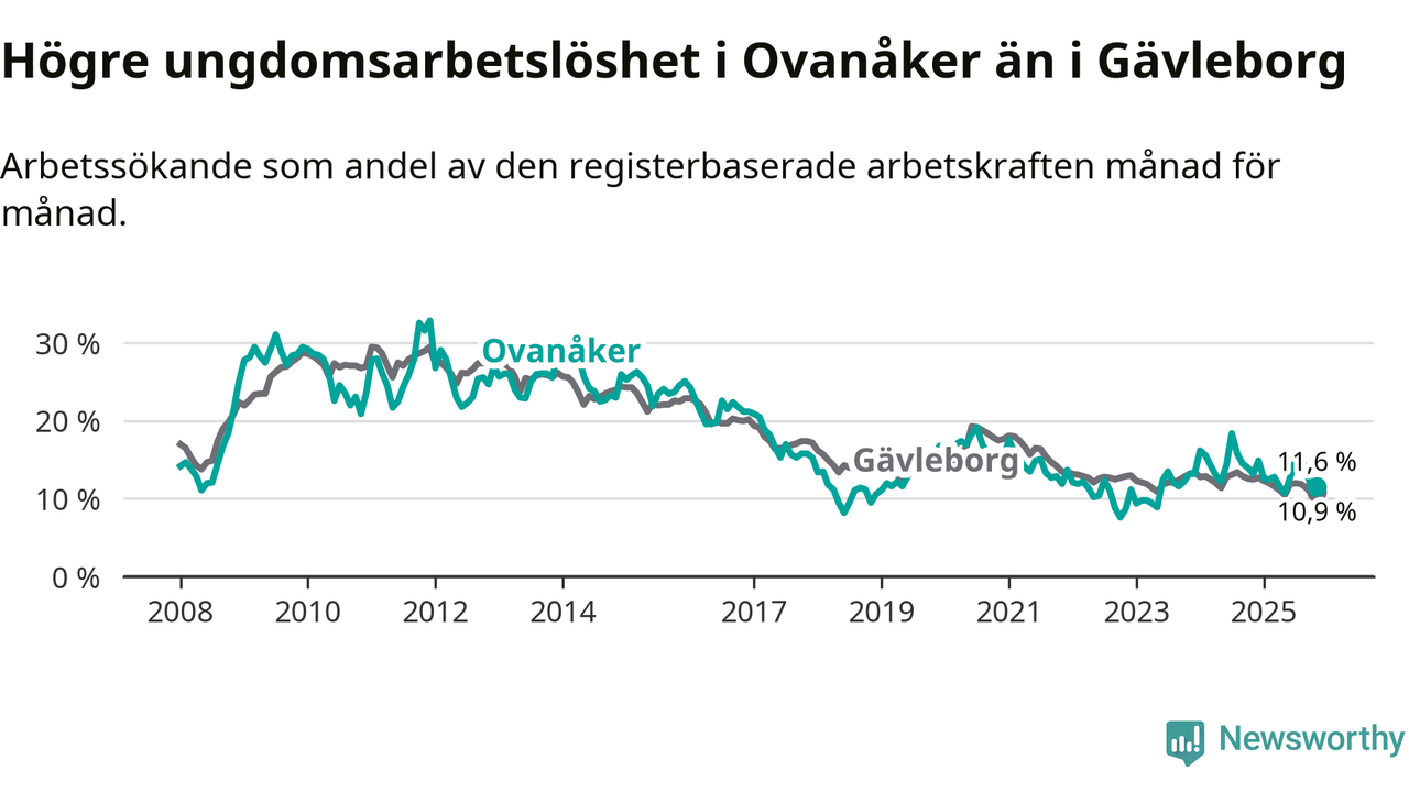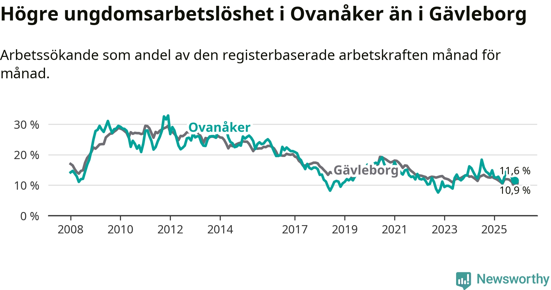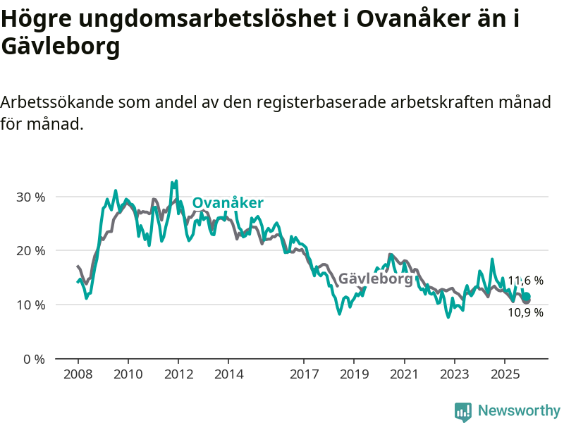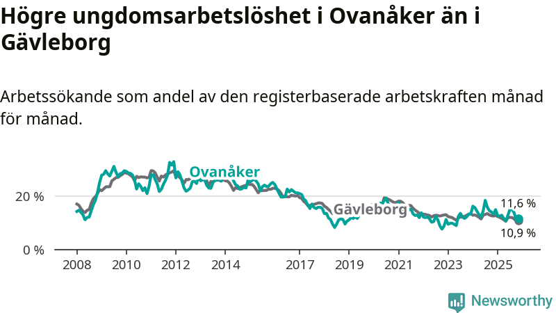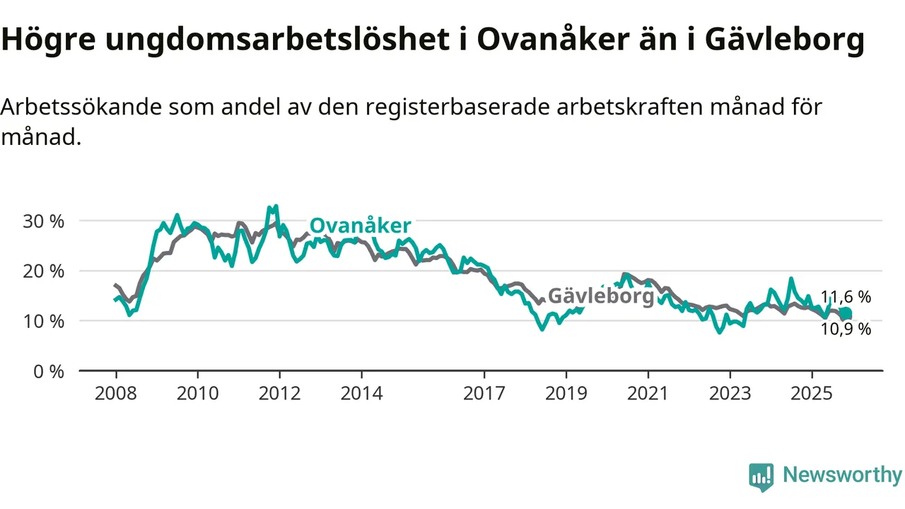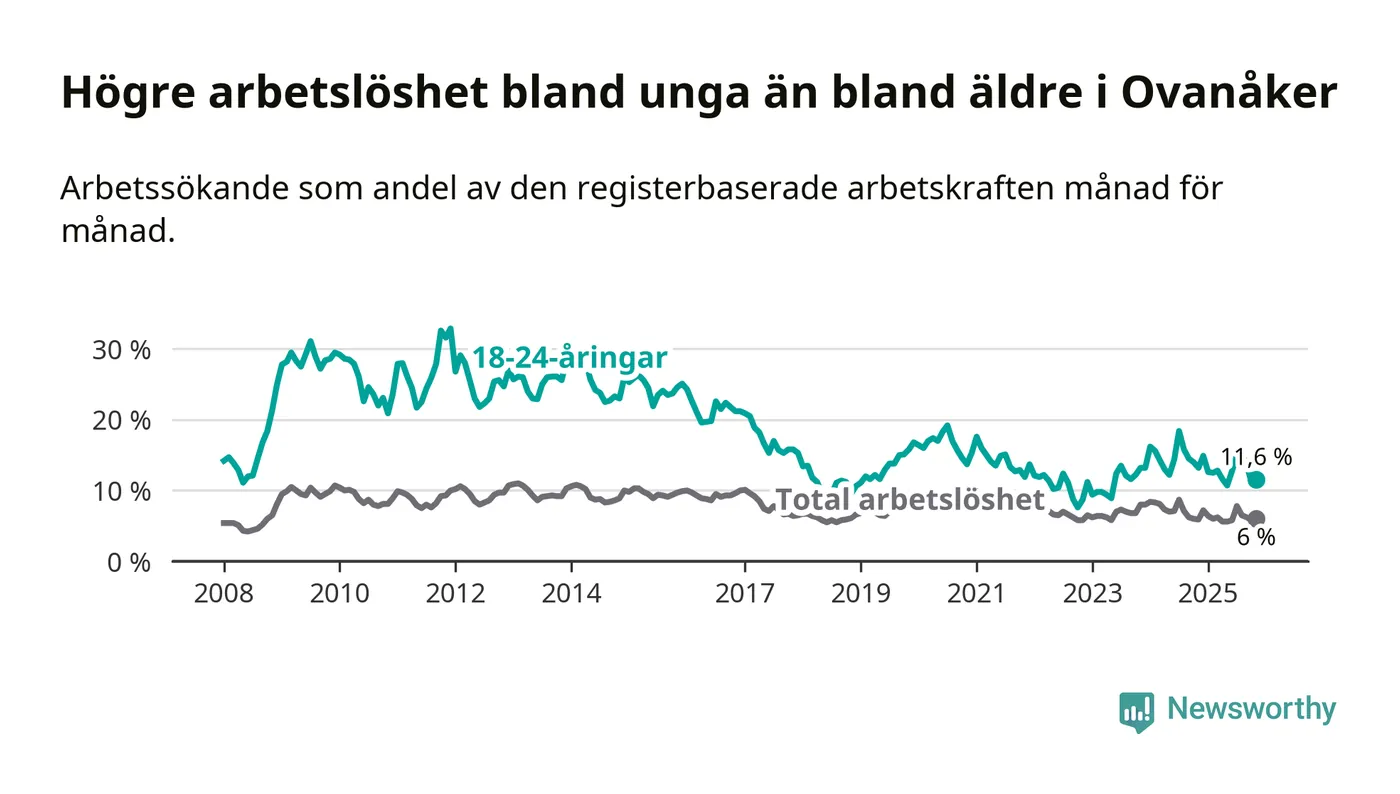 Medan Ovanåker har lägre total arbetslöshet än Gävleborg, ligger ungdomsarbetslösheten 0,7 procentenheter högre i Ovanåker.