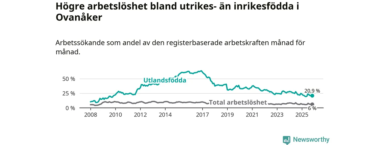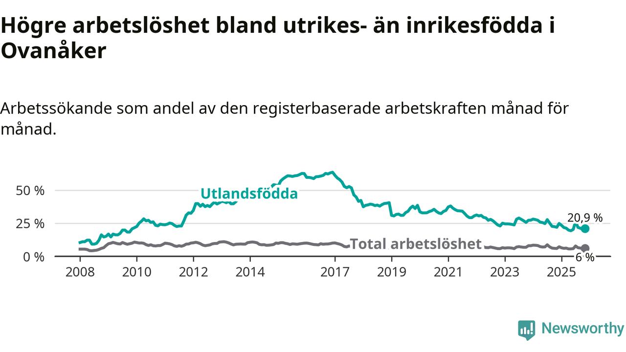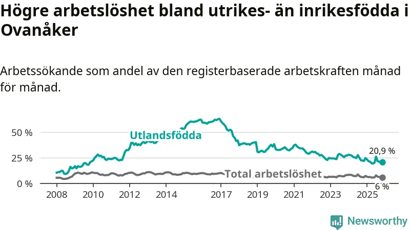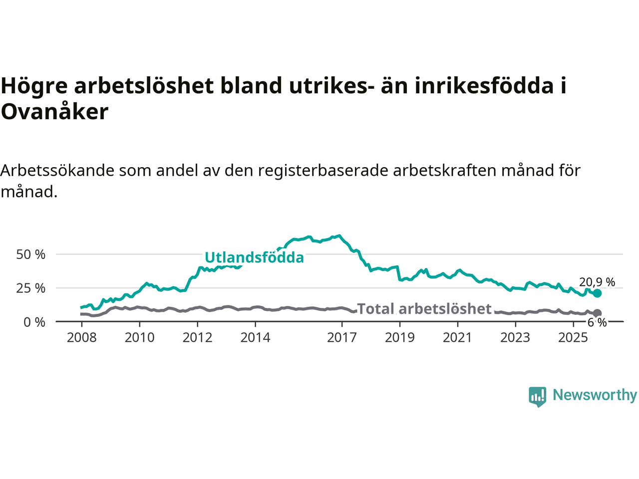 Arbetslösheten bland utlandsfödda var 20,9 procent i Ovanåker under november månad, motsvarande 112 av 536 personer. Det är 1,0 procentenheter färre än vid samma tidpunkt i fjol (−12 om man räknar personer). Därmed är de utlandsföddas arbetslöshet lägre än vid samma tidpunkt i fjol för 18:e månaden i följd. Sedan maj 2024 har arbetslösheten bland utlandsfödda minskat från 25,5 till 20,9 procent.