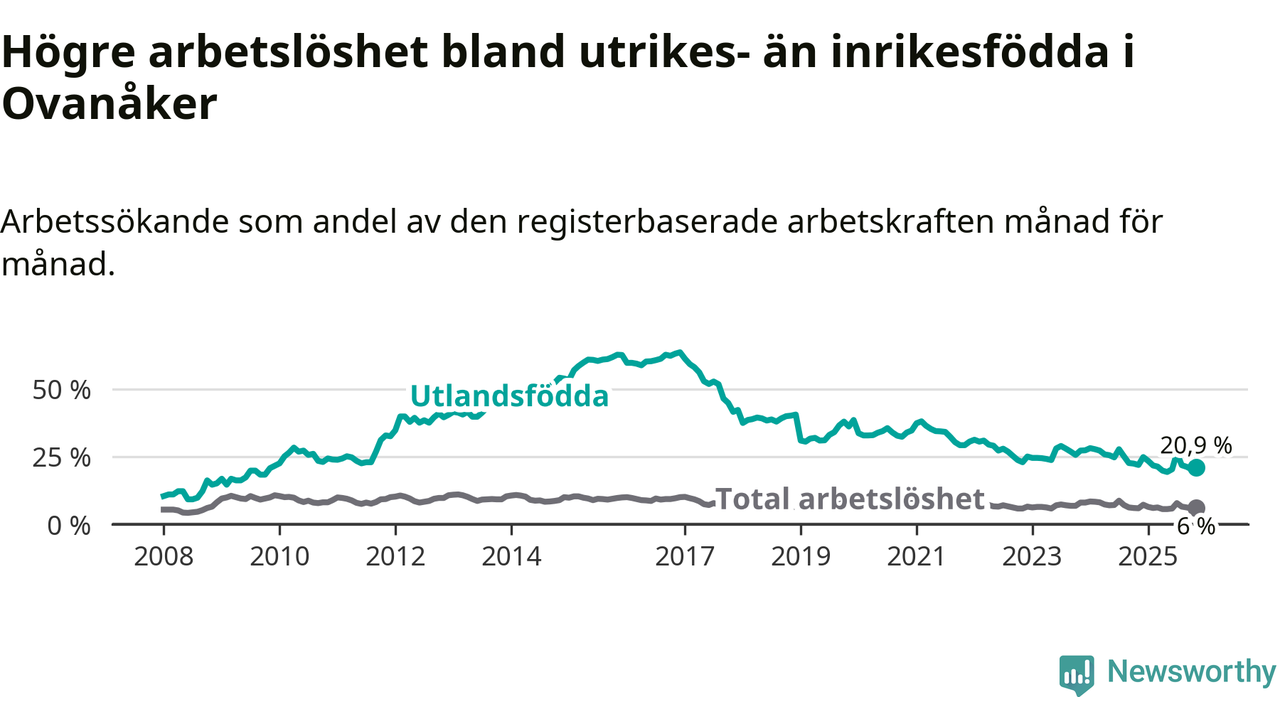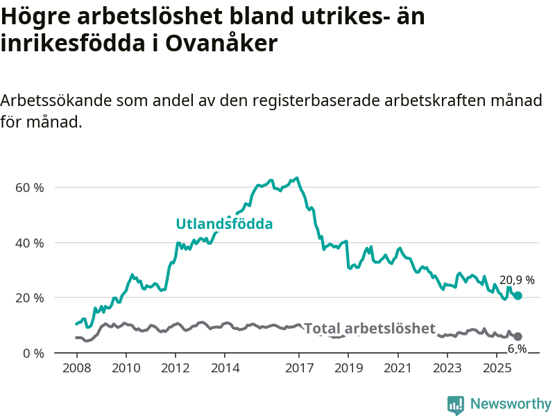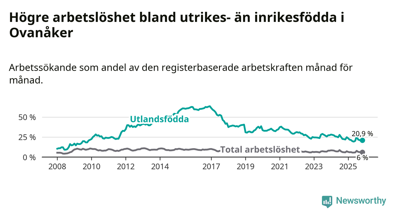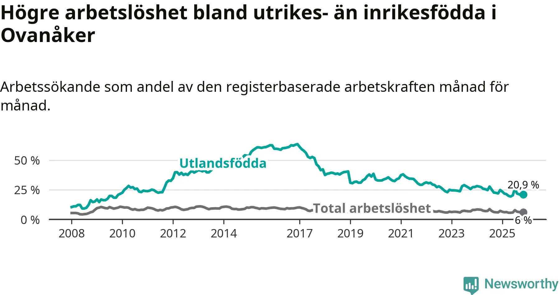 Arbetslösheten bland utlandsfödda var 20,9 procent i Ovanåker under november månad, motsvarande 112 av 536 personer. Det är 1,0 procentenheter färre än vid samma tidpunkt i fjol (−12 om man räknar personer). Därmed är de utlandsföddas arbetslöshet lägre än vid samma tidpunkt i fjol för 18:e månaden i följd. Sedan maj 2024 har arbetslösheten bland utlandsfödda minskat från 25,5 till 20,9 procent.