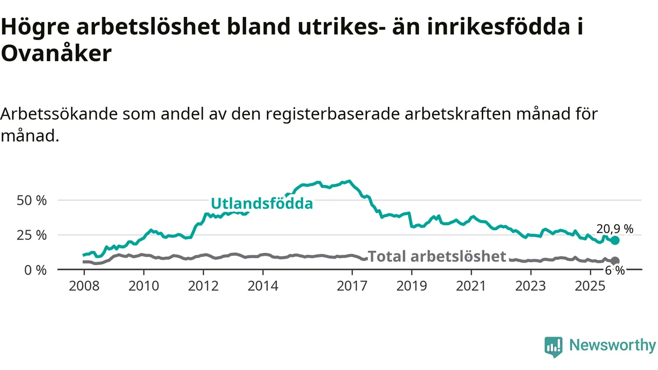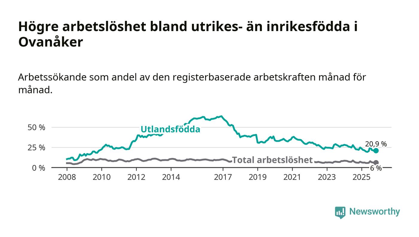 Skillnaden i arbetslöshet mellan utrikesfödda och hela befolkningen är 14,9 procentenheter i Ovanåker. Det är en mindre skillnad än för ett år sedan (−1,1 procentenheter).