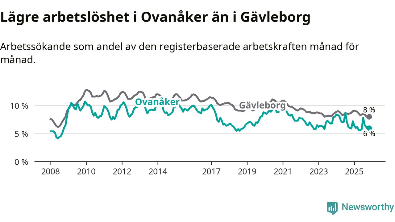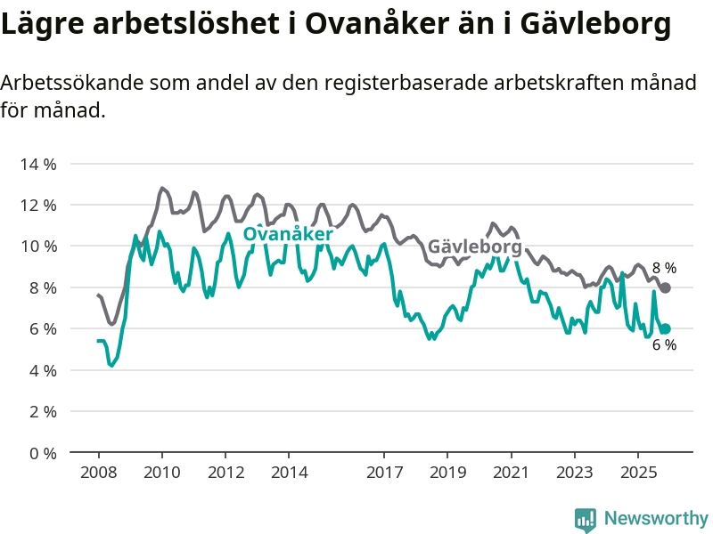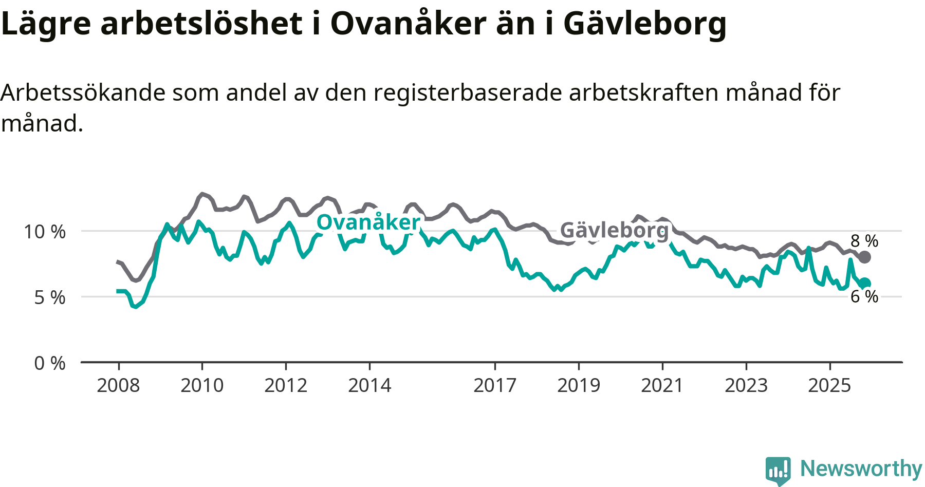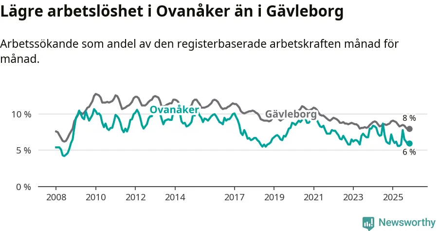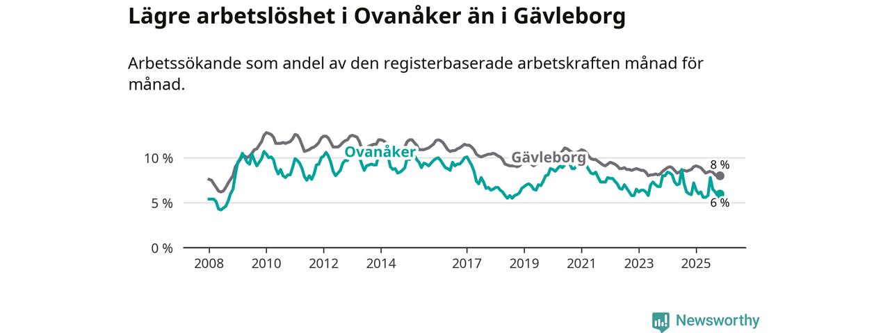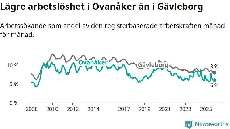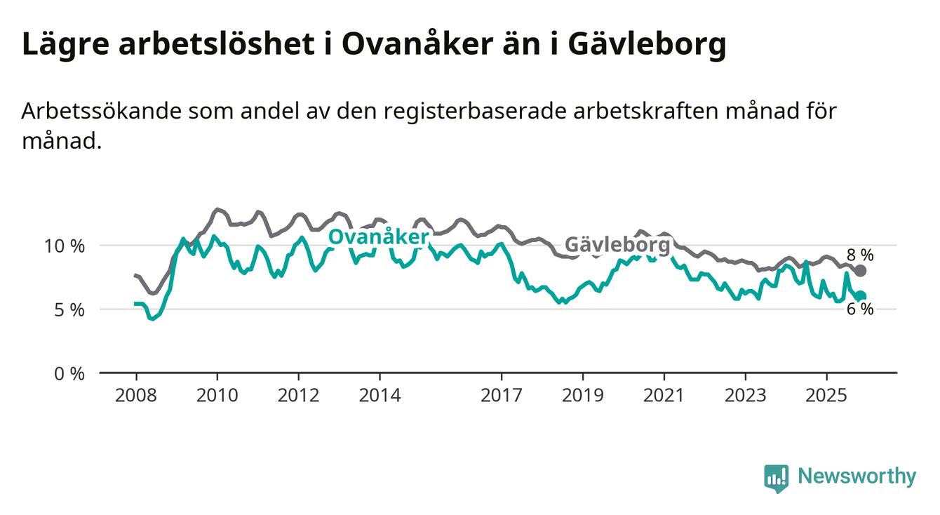 Även om arbetslösheten i Ovanåker alltså ökar, så ligger den fortfarande under snittet i hela Gävleborgs län (6,0 procent i kommunen, jämfört med 8,0 procent i hela länet). Hudiksvall har den lägsta arbetslösheten i länet (5,7 procent), medan Söderhamn har den högsta (9,0 procent). För att Ovanåker skulle komma ner i samma arbetslöshetsnivå som Hudiksvall skulle 15 personer behöva sysselsättas.