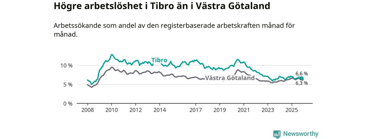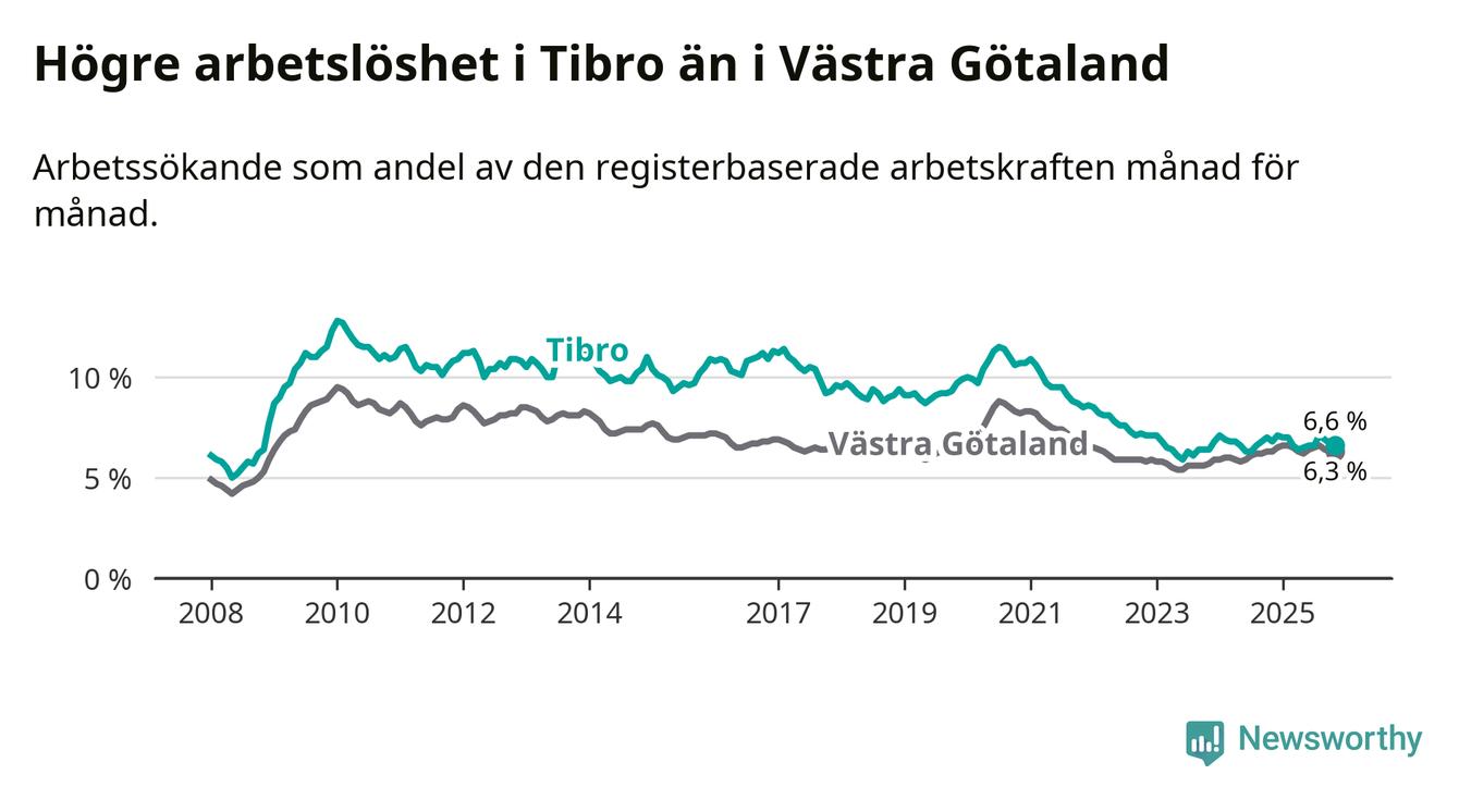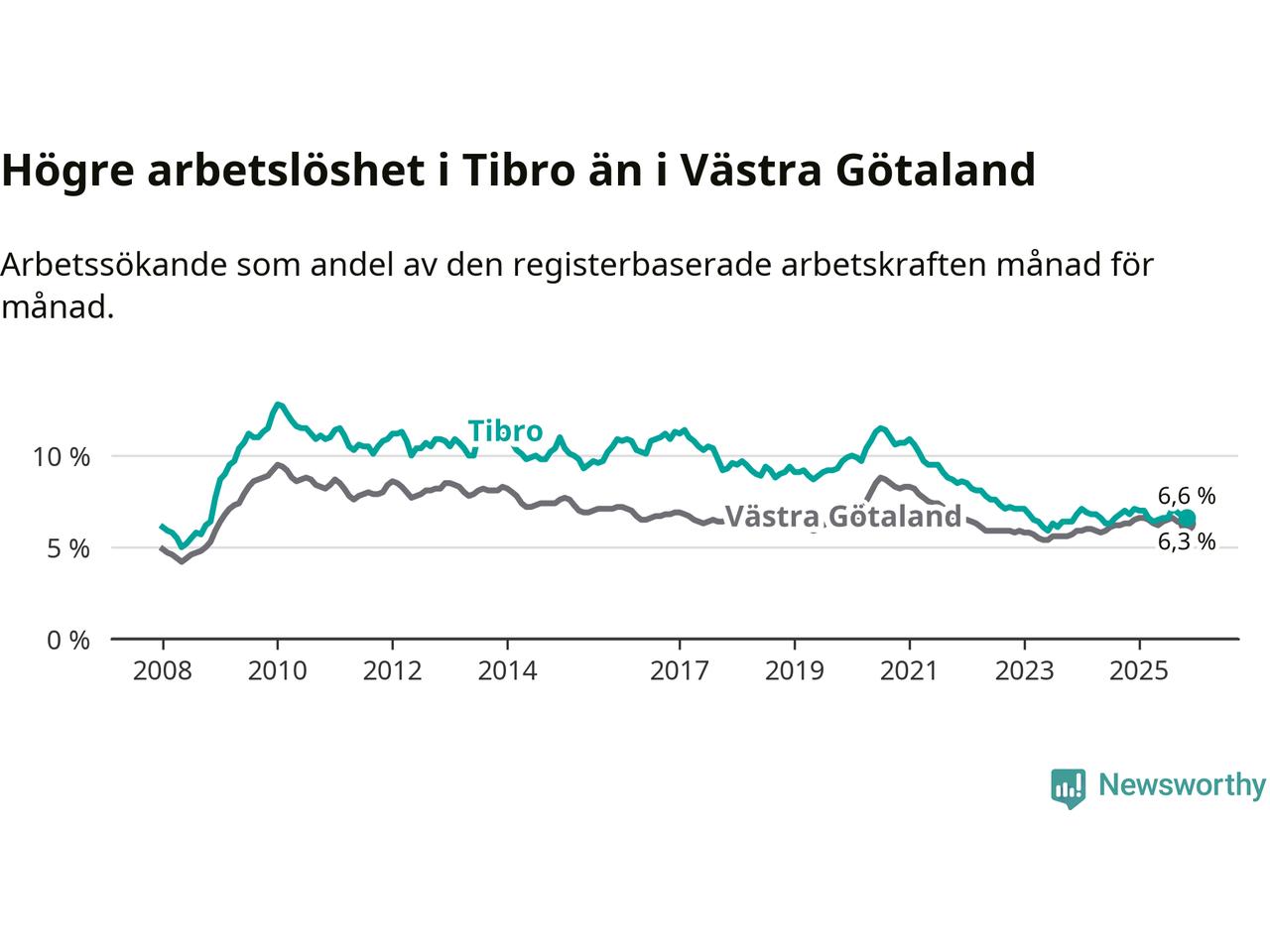 Under november månad rapporterade Tibro kommun en total arbetslöshet på 6,6 procent. Det är en minskning jämfört med samma tidpunkt i fjol (−0,2 procentenheter). I Västra Götalands län däremot står arbetslösheten stilla.