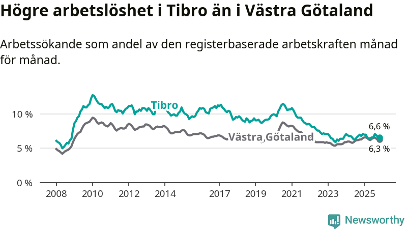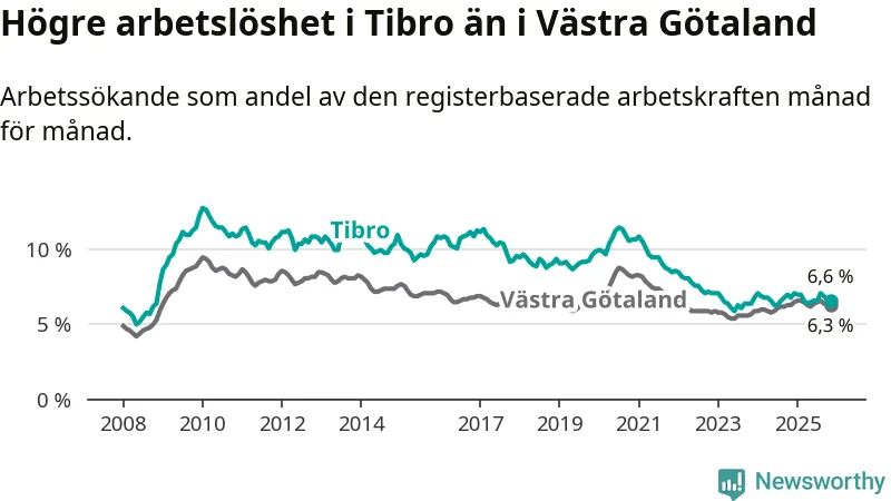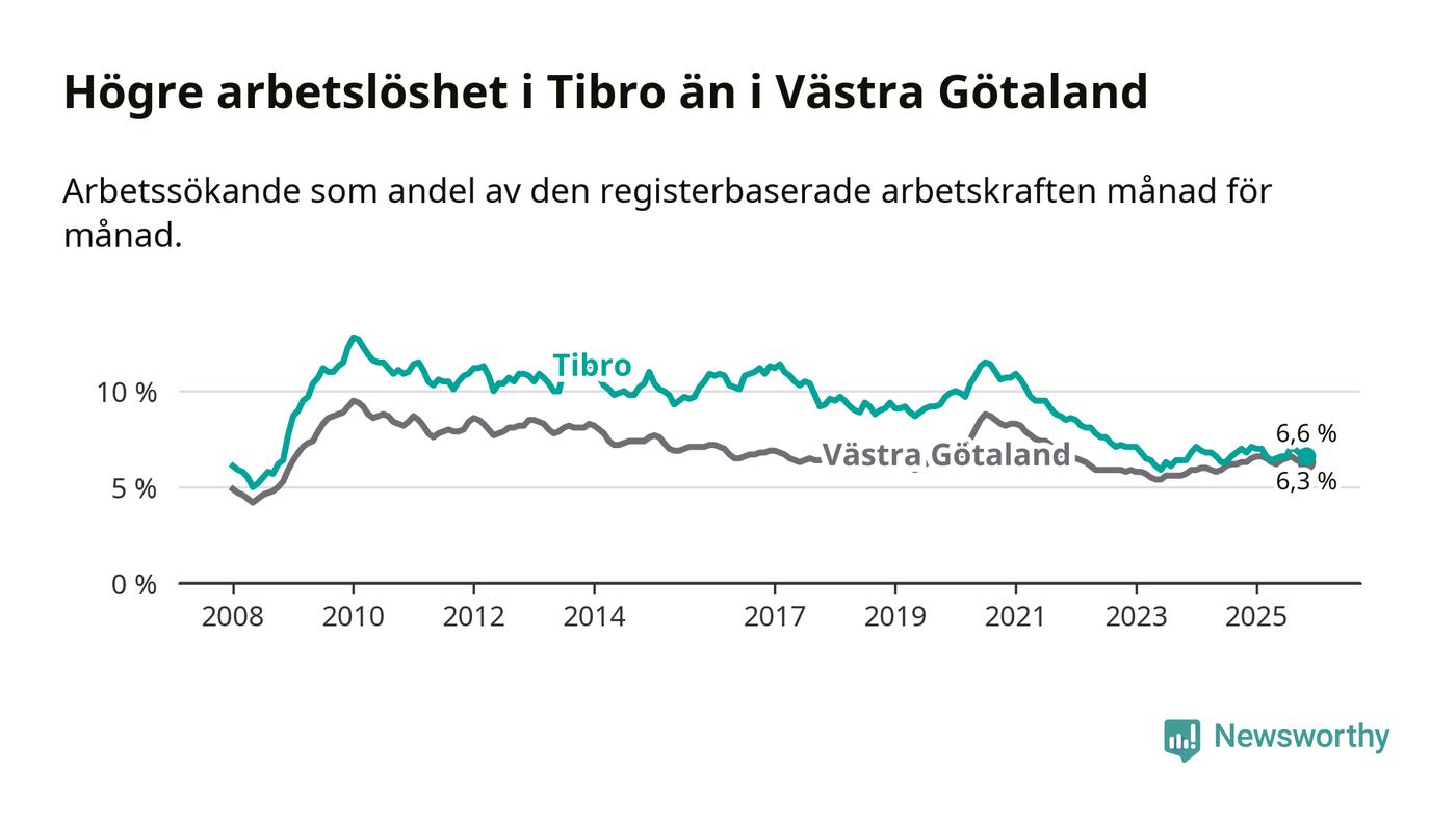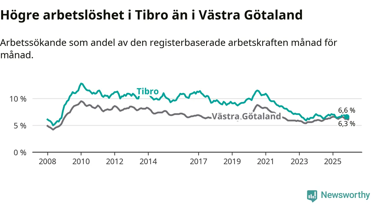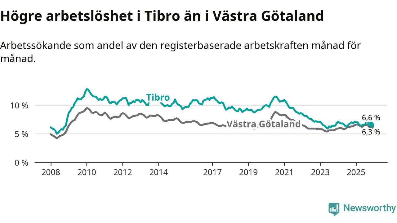 Under november månad rapporterade Tibro kommun en total arbetslöshet på 6,6 procent. Det är en minskning jämfört med samma tidpunkt i fjol (−0,2 procentenheter). I Västra Götalands län däremot står arbetslösheten stilla.