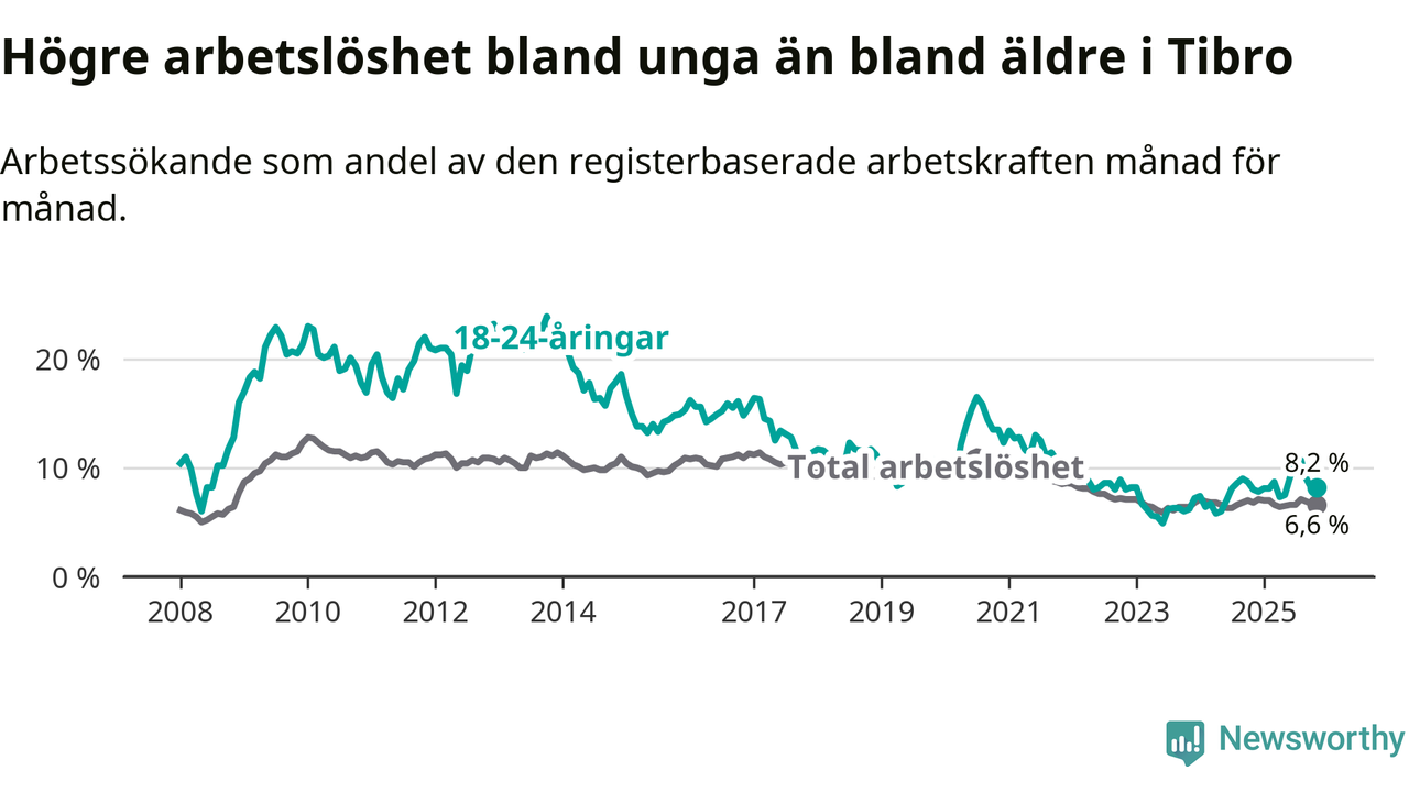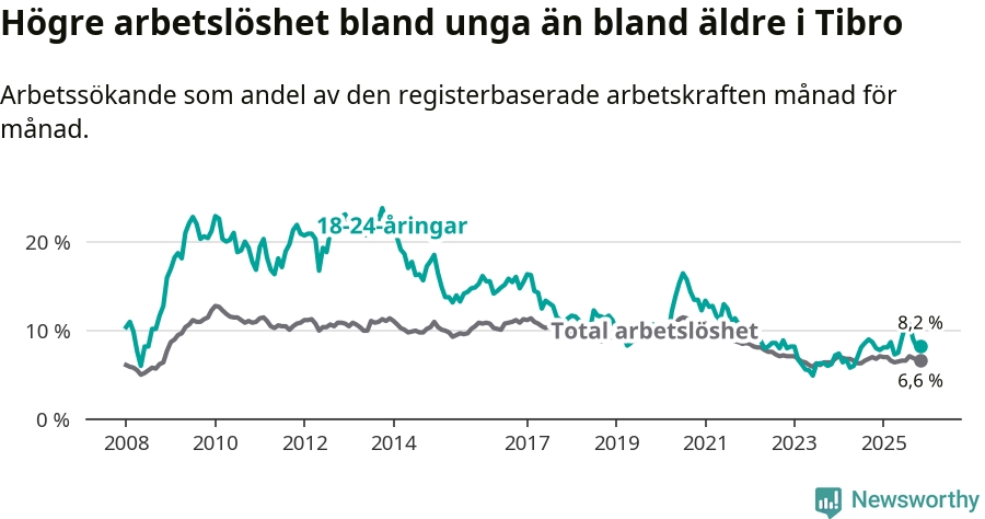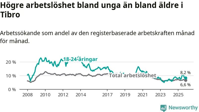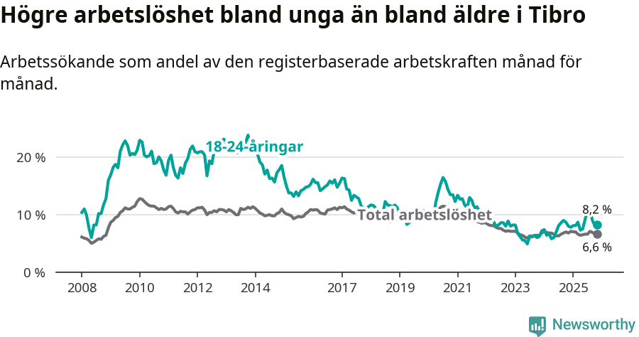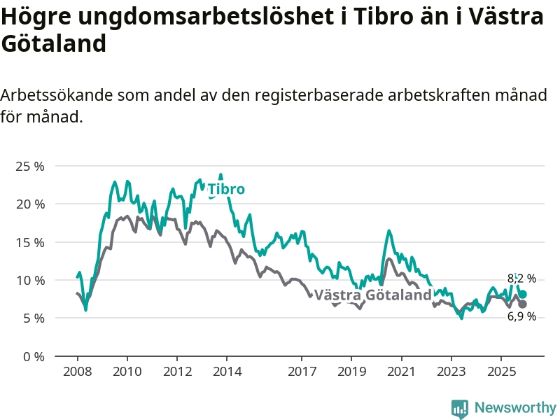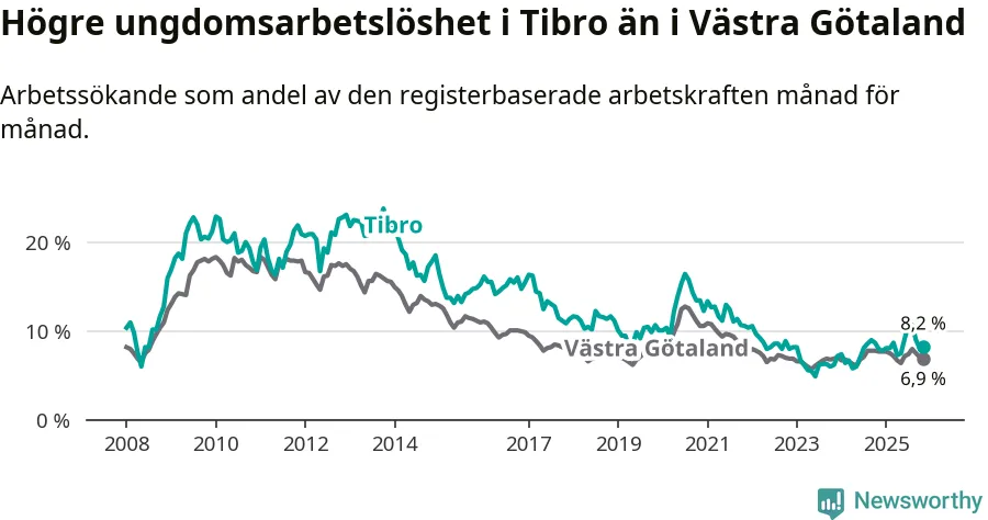 Precis som den totala arbetslösheten ligger ungdomsarbetslösheten i Tibro högre än i Västra Götaland som helhet. Skillnaden mellan kommunen och länet är 1,3 procentenheter.