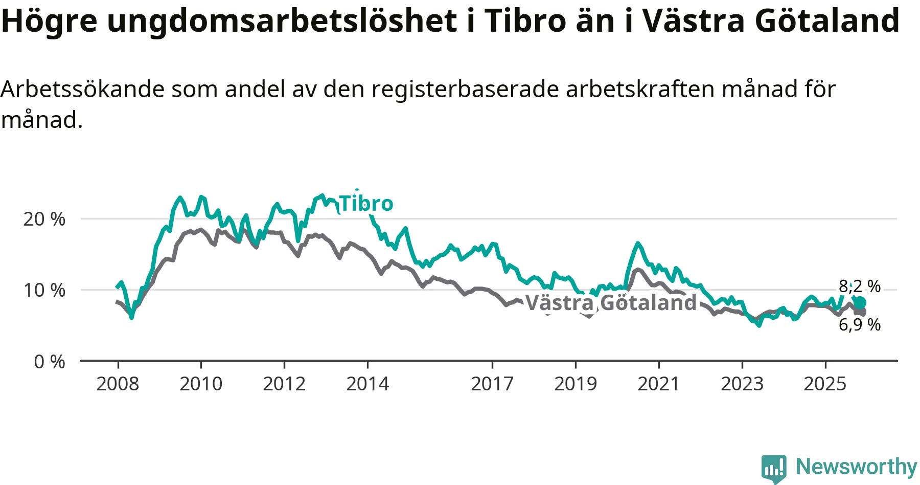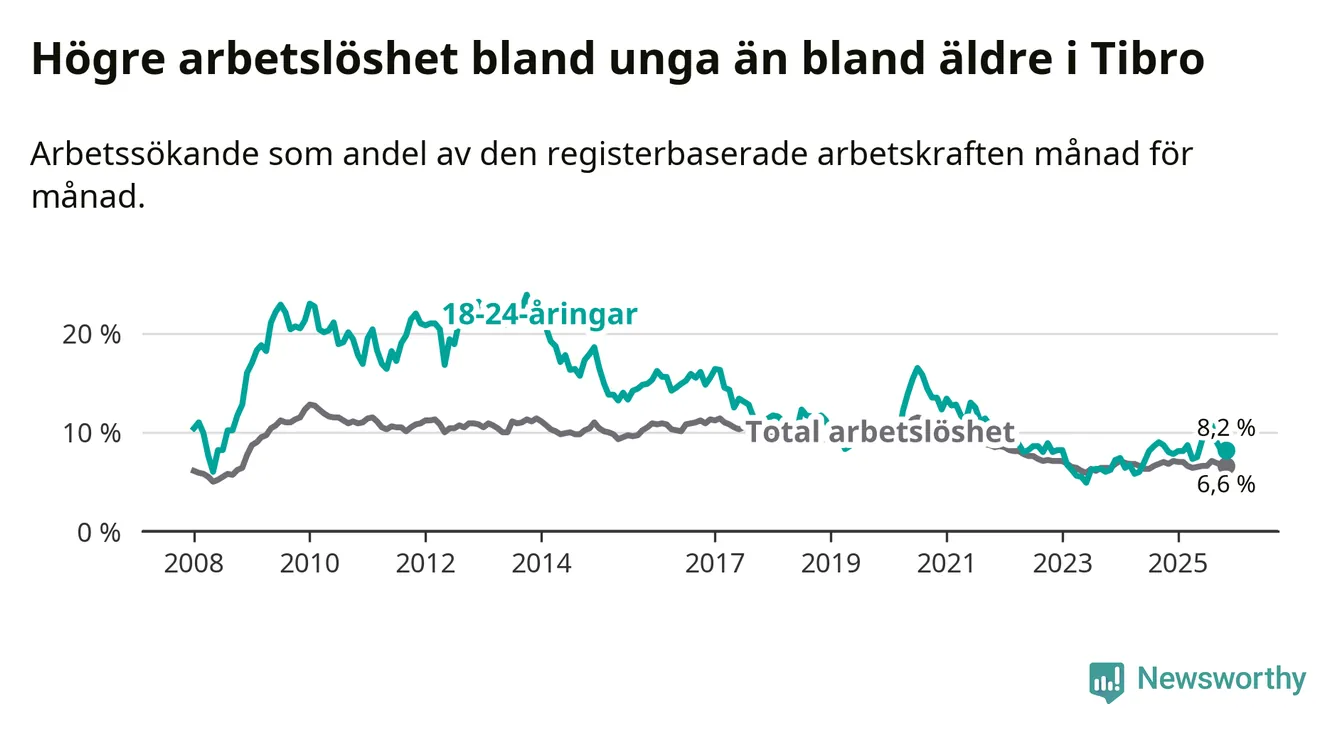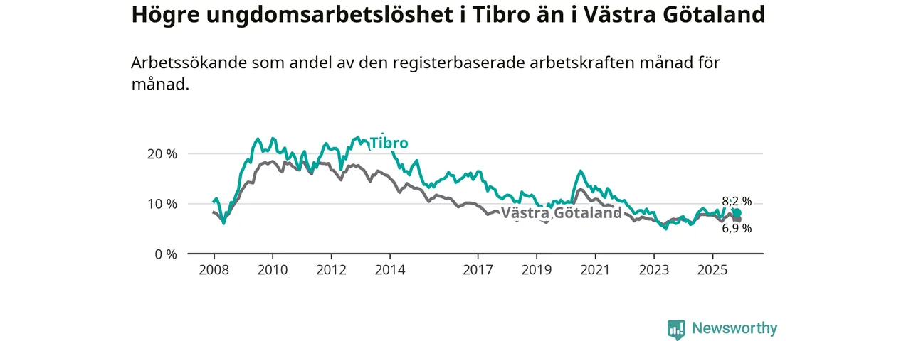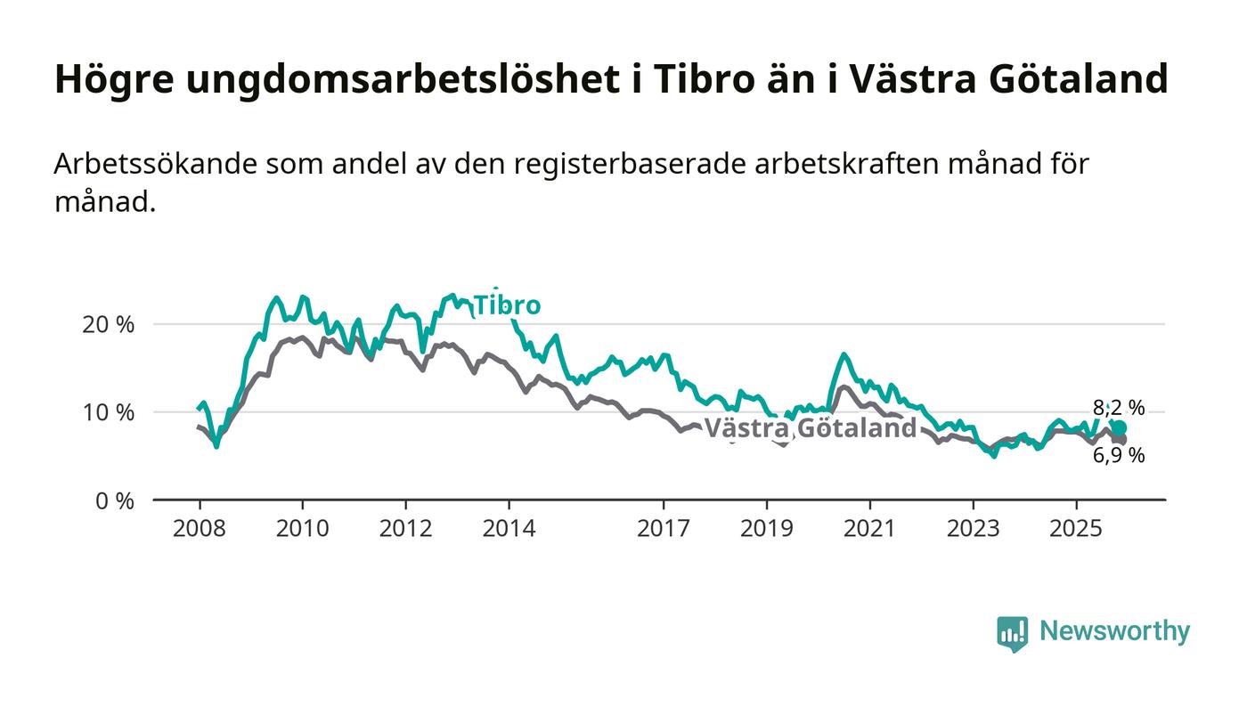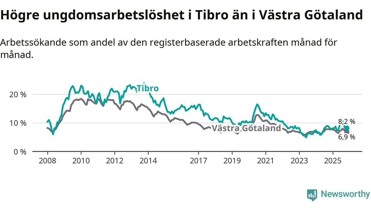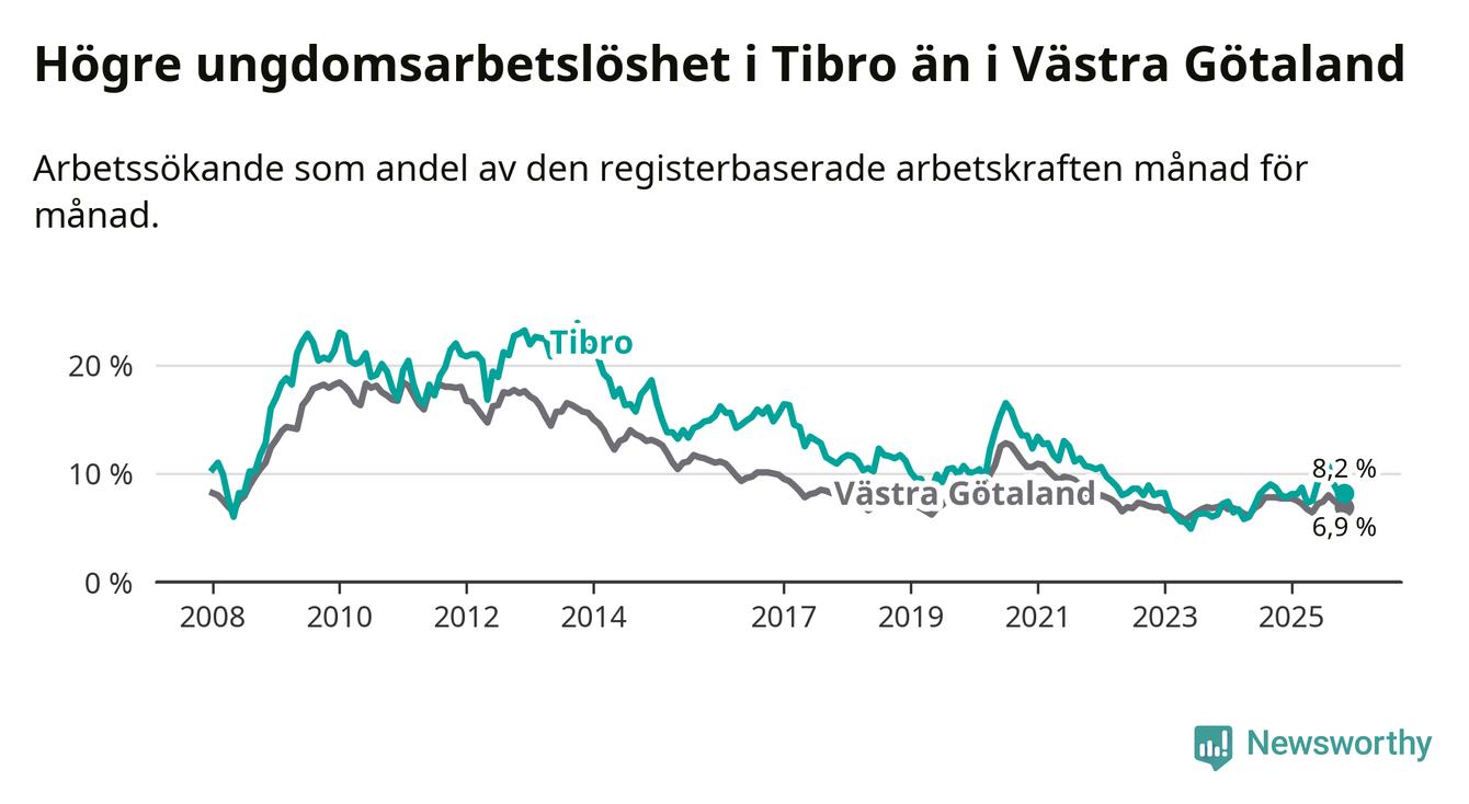 Graf: Arbetslöshet bland unga i Tibro kommun och Västra Götalands län