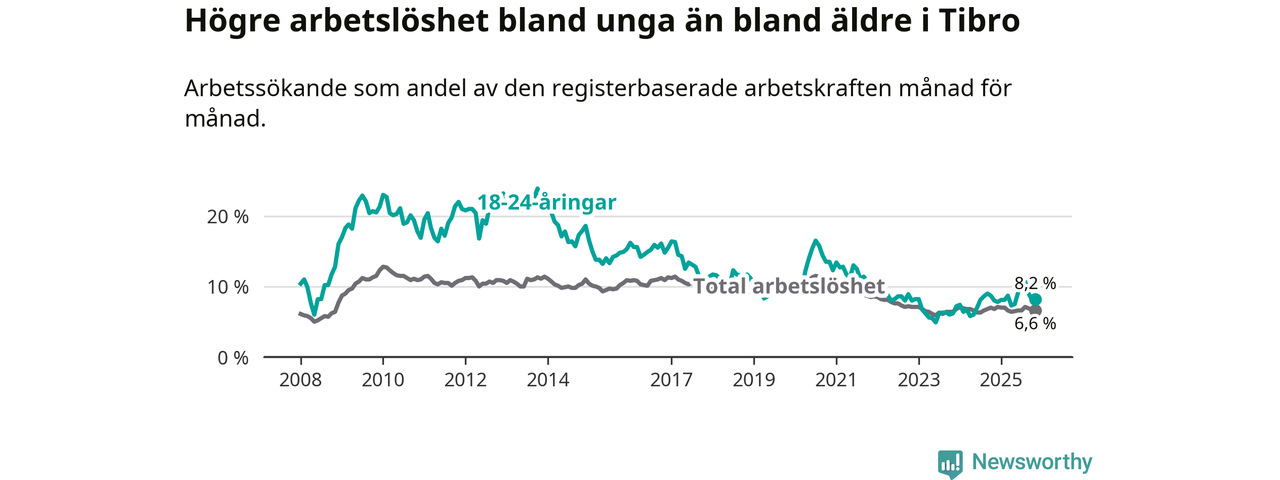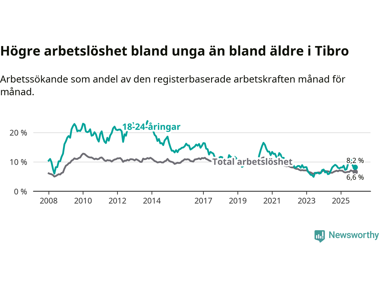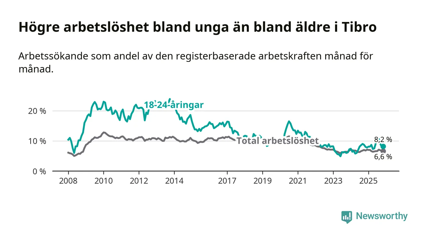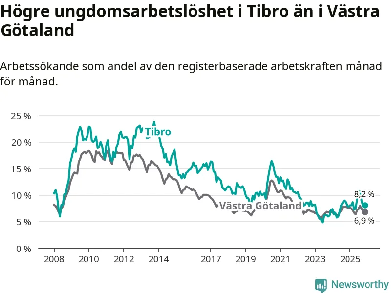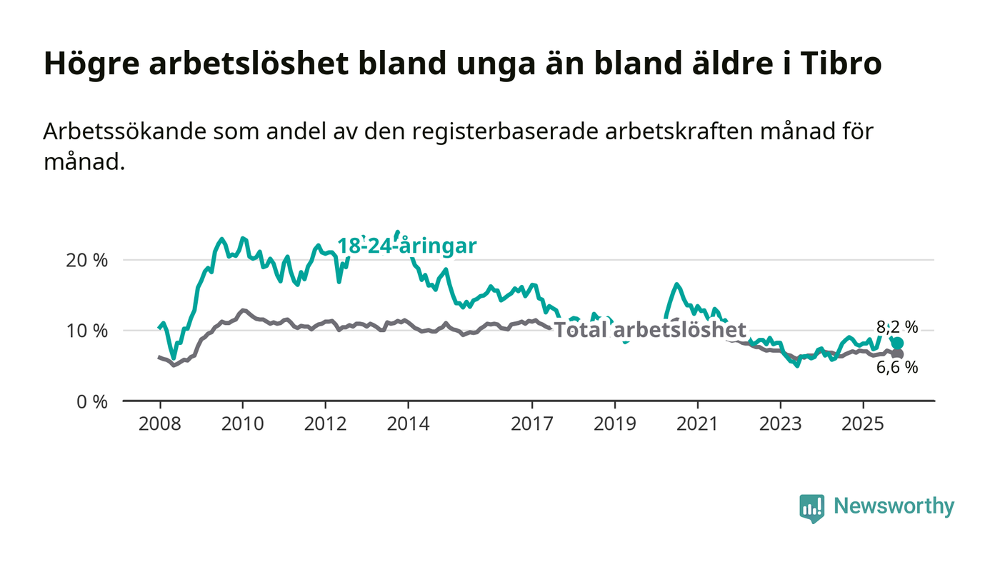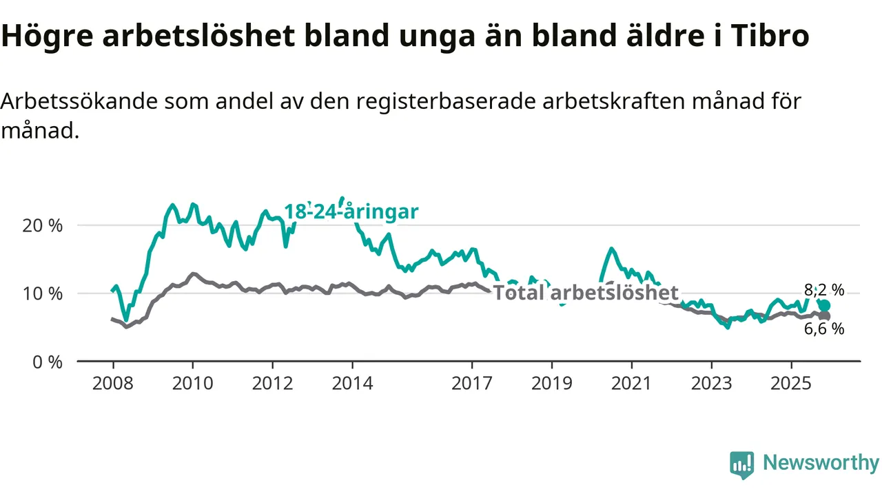 Graf: Arbetslöshet bland unga i Tibro kommun och Västra Götalands län