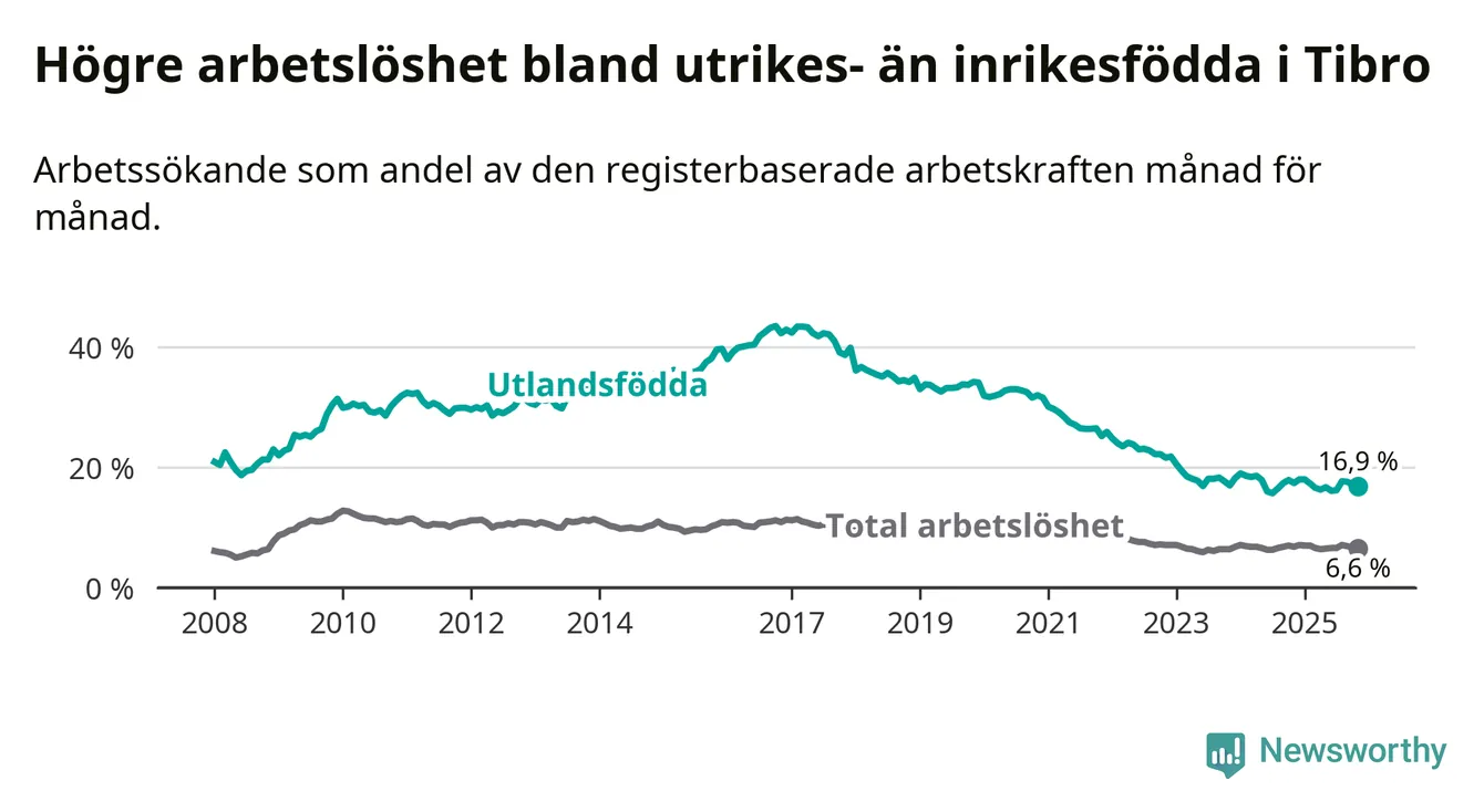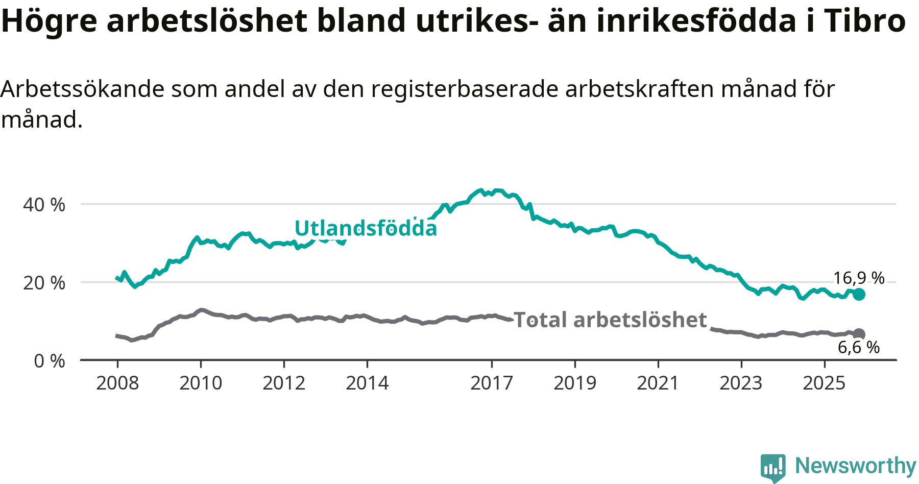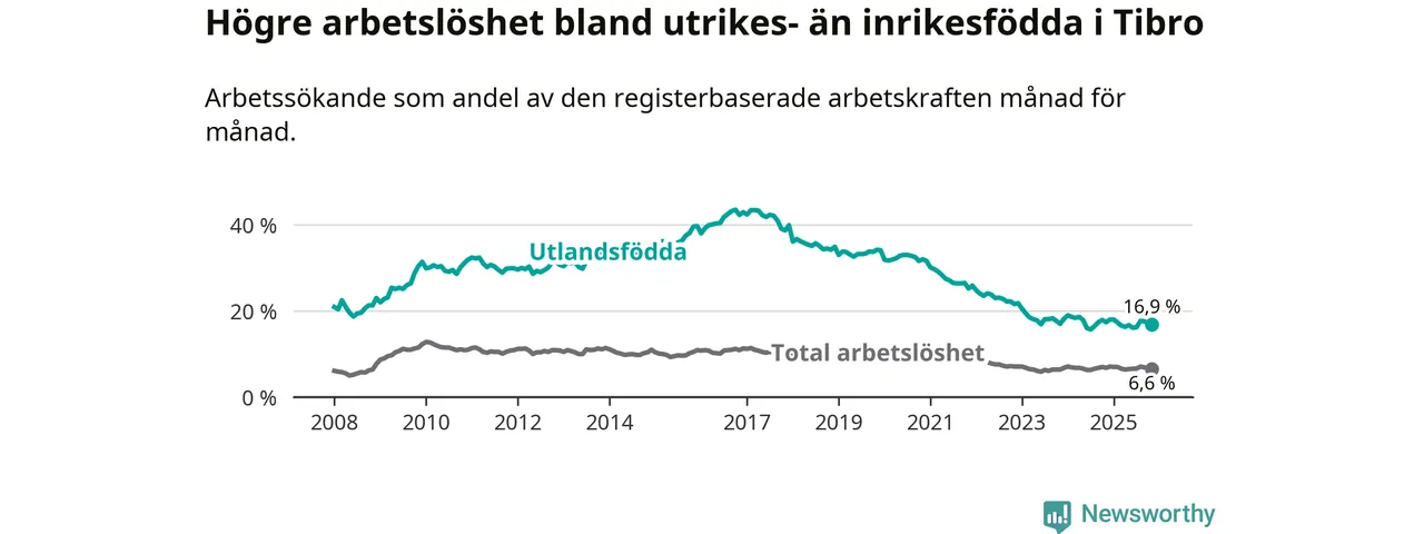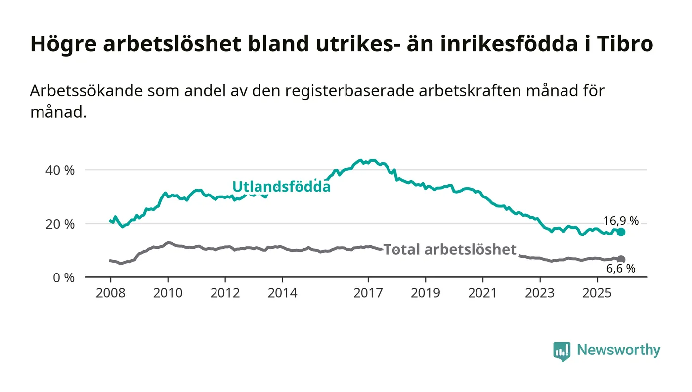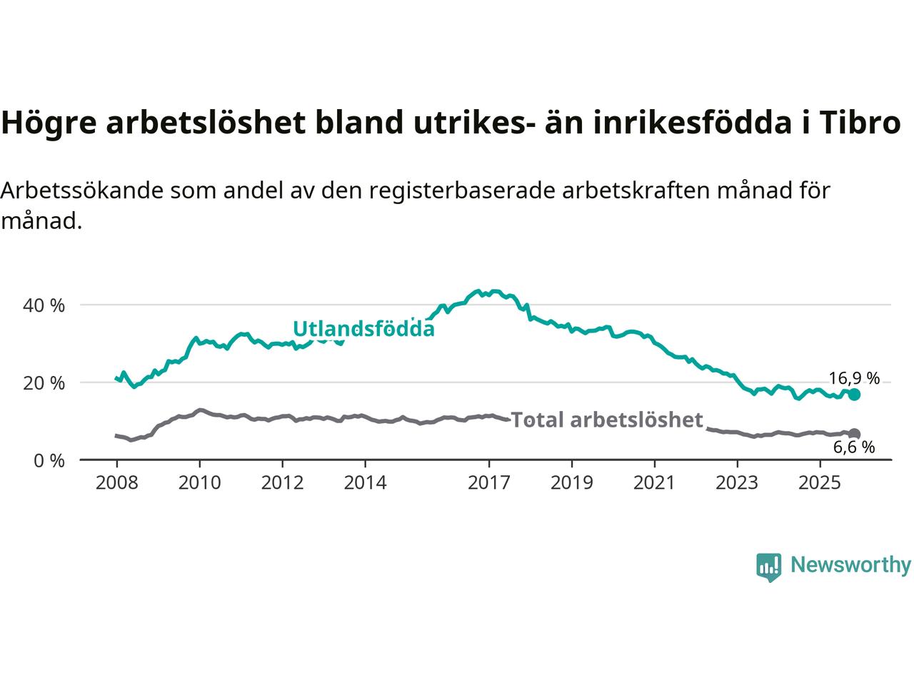Arbetslösheten bland utlandsfödda var 16,9 procent i Tibro under november månad, motsvarande 180 av 1 065 personer. Det är 0,5 procentenheter färre än vid samma tidpunkt i fjol (−9 om man räknar personer).