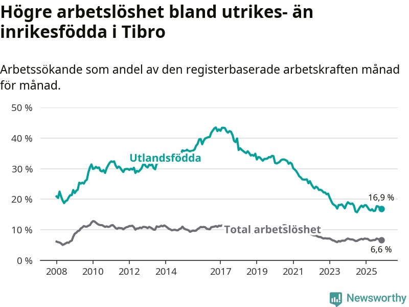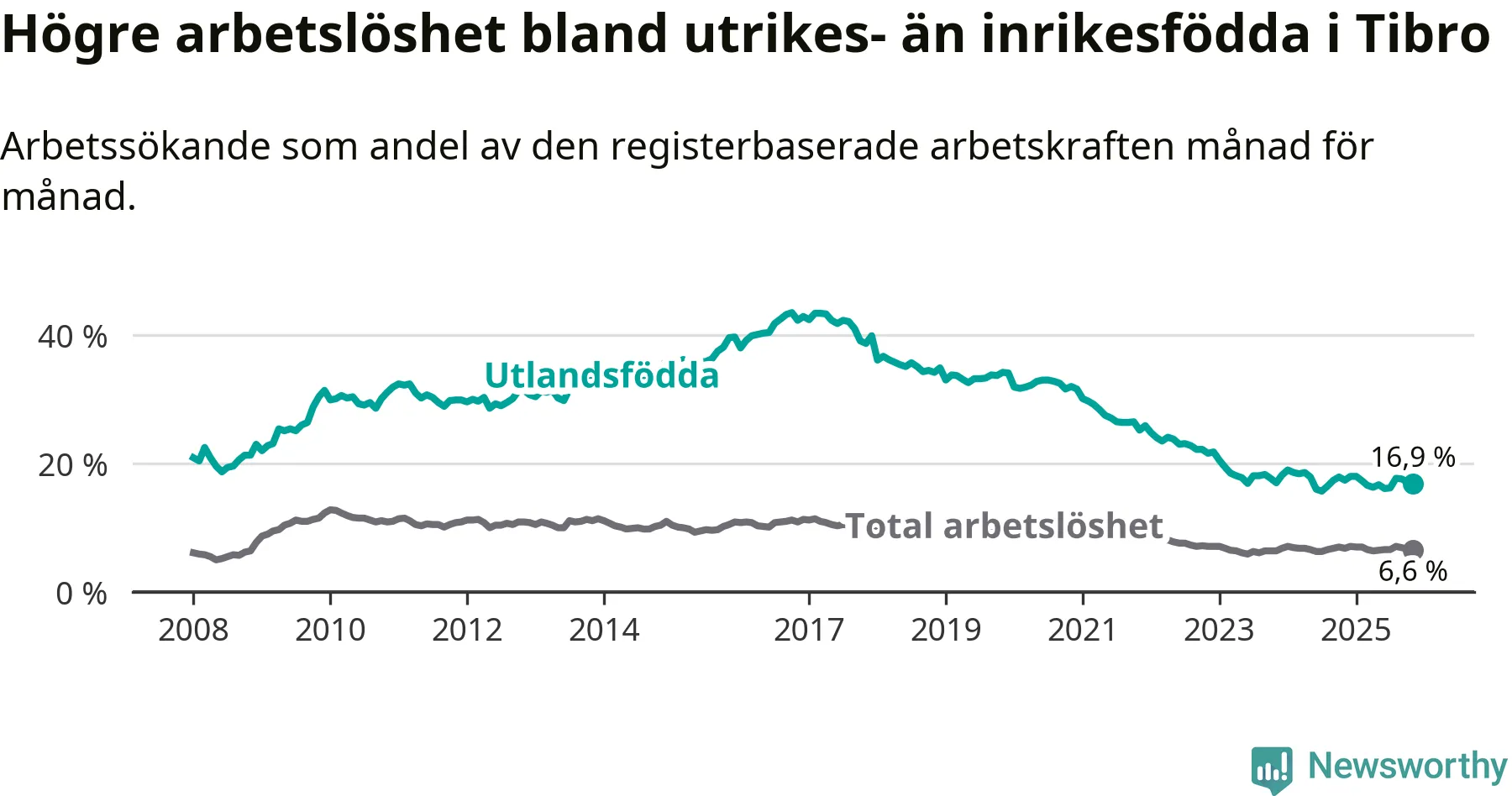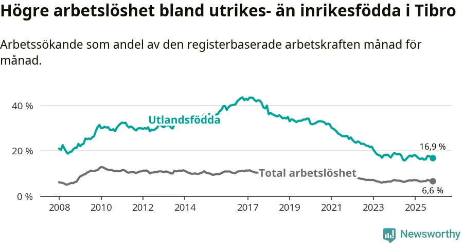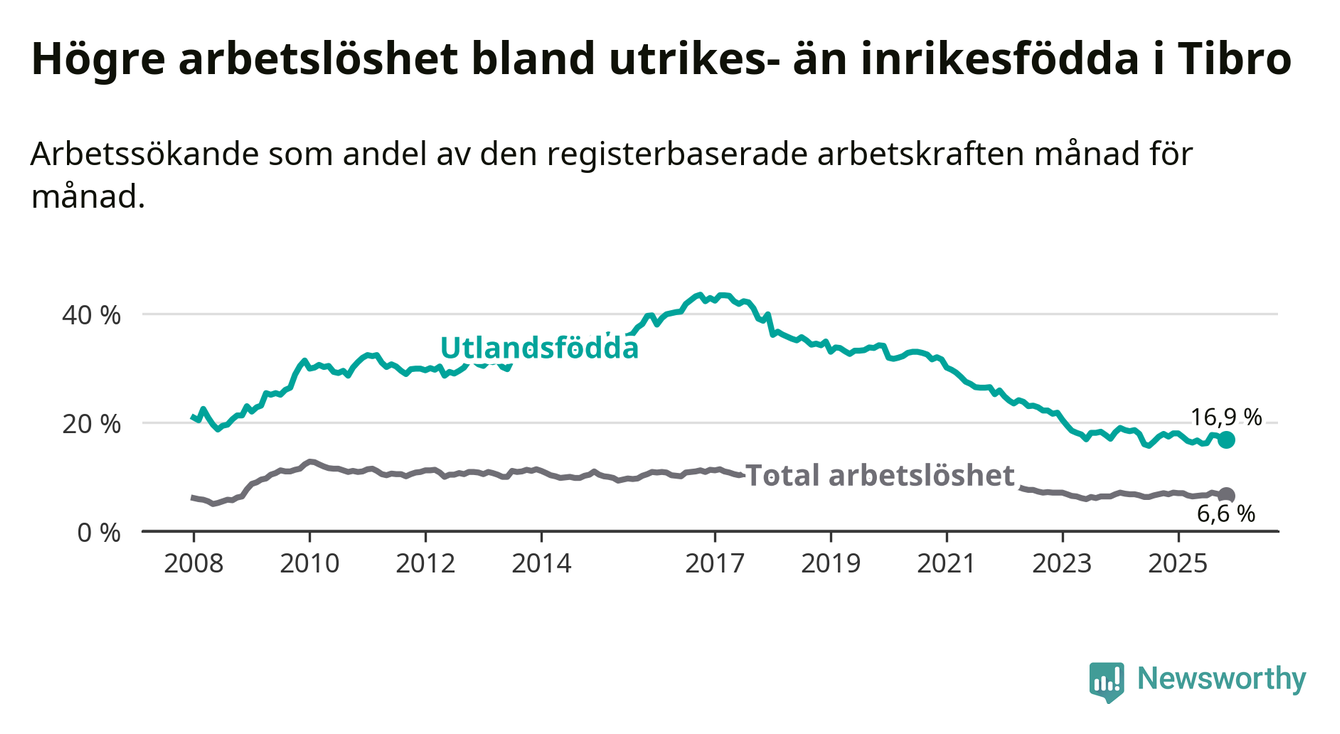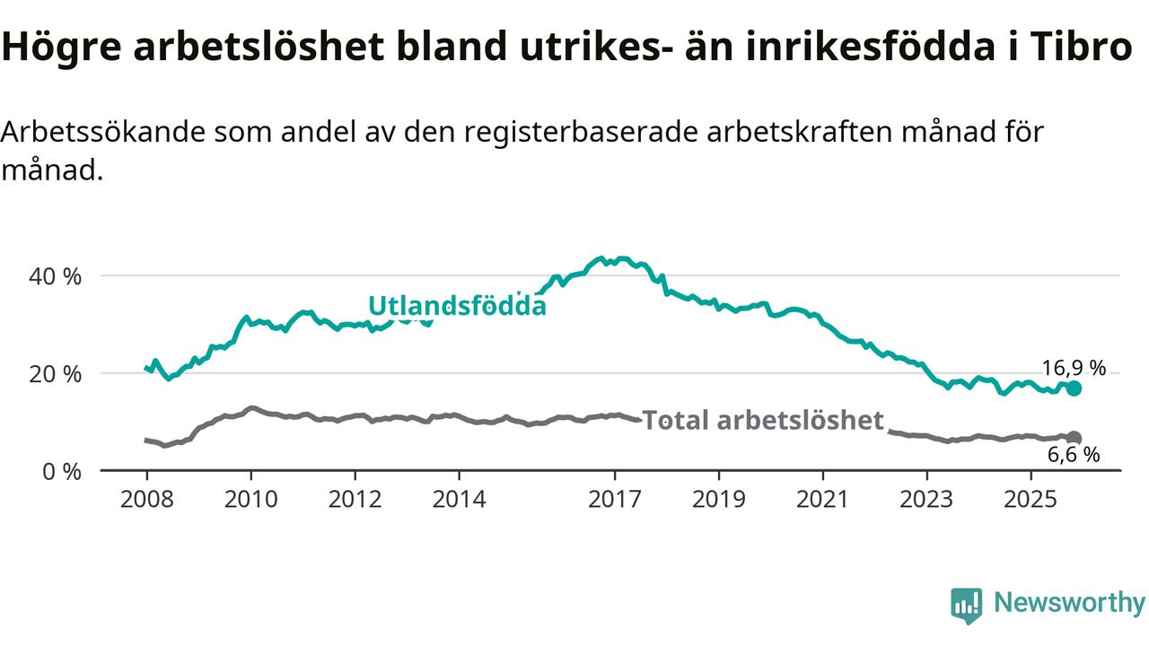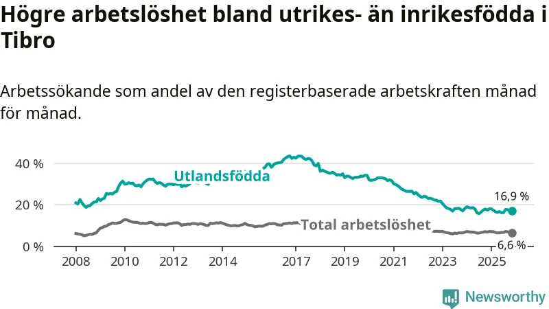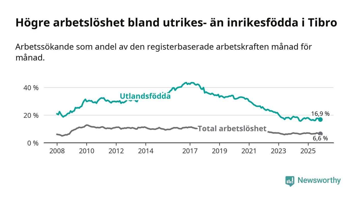 Arbetslösheten bland utlandsfödda var 16,9 procent i Tibro under november månad, motsvarande 180 av 1 065 personer. Det är 0,5 procentenheter färre än vid samma tidpunkt i fjol (−9 om man räknar personer).
