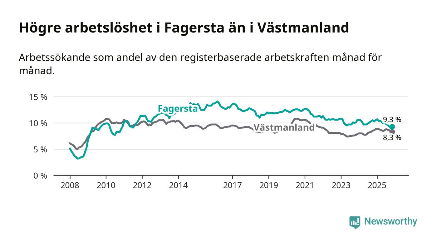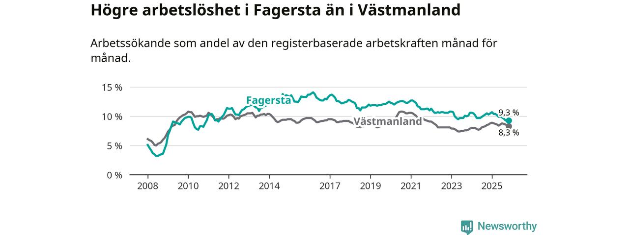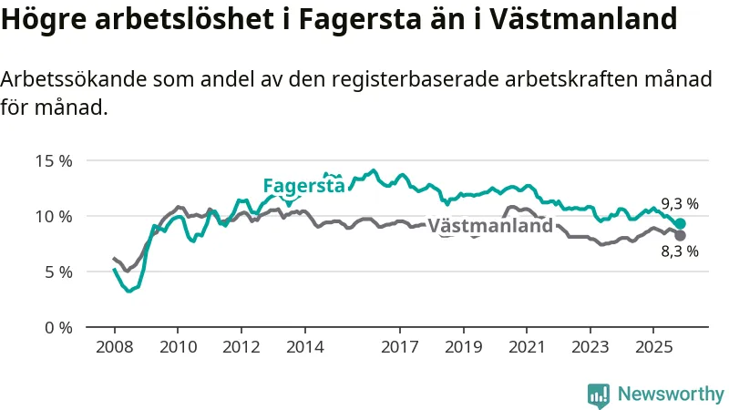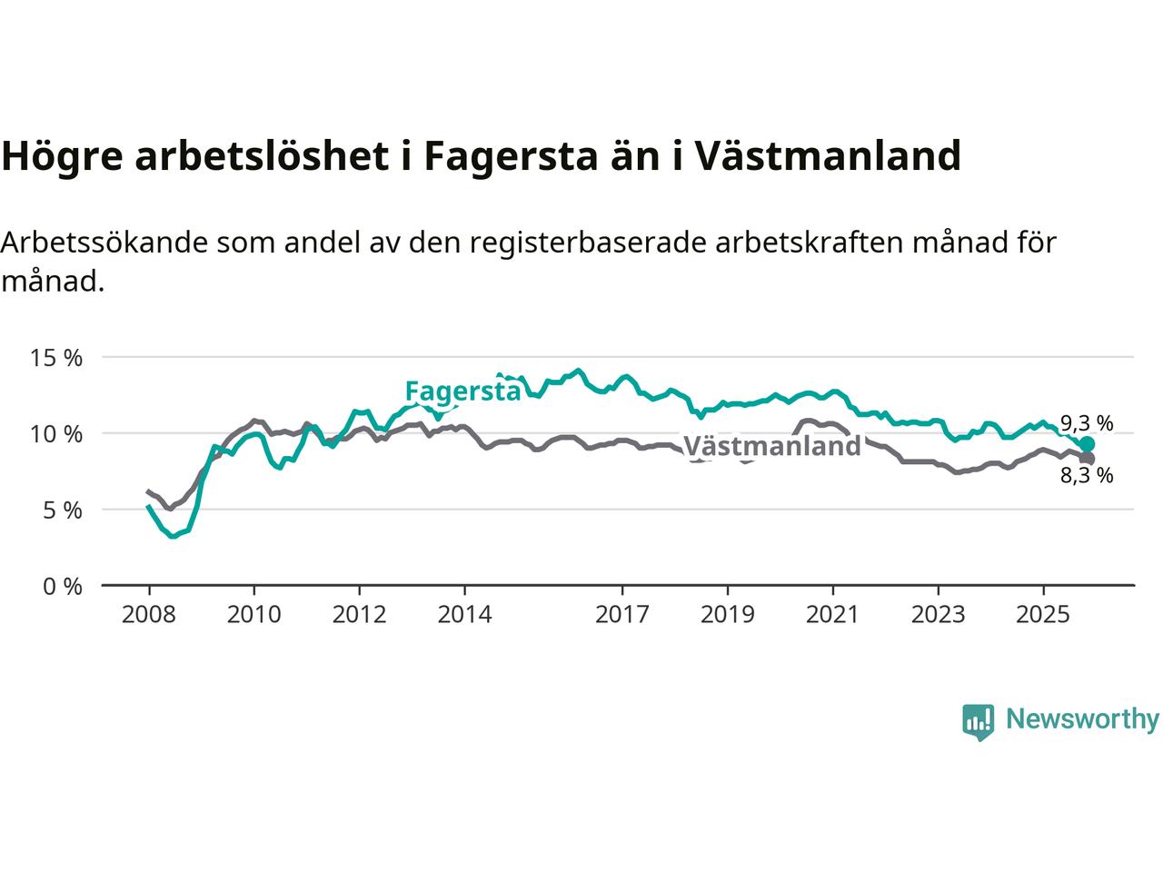 Under november månad rapporterade Fagersta kommun en total arbetslöshet på 9,3 procent. Det är en minskning jämfört med samma tidpunkt i fjol (−1,0 procentenheter). Även i Västmanlands län sjunker arbetslösheten .