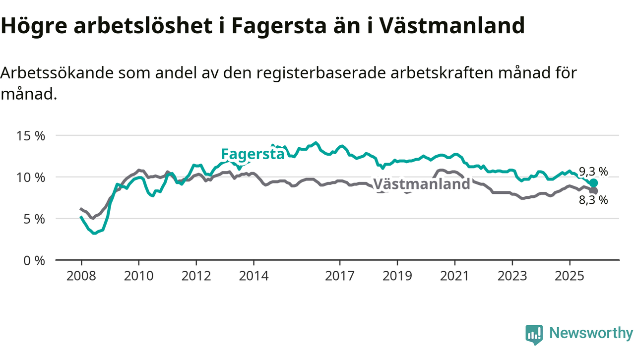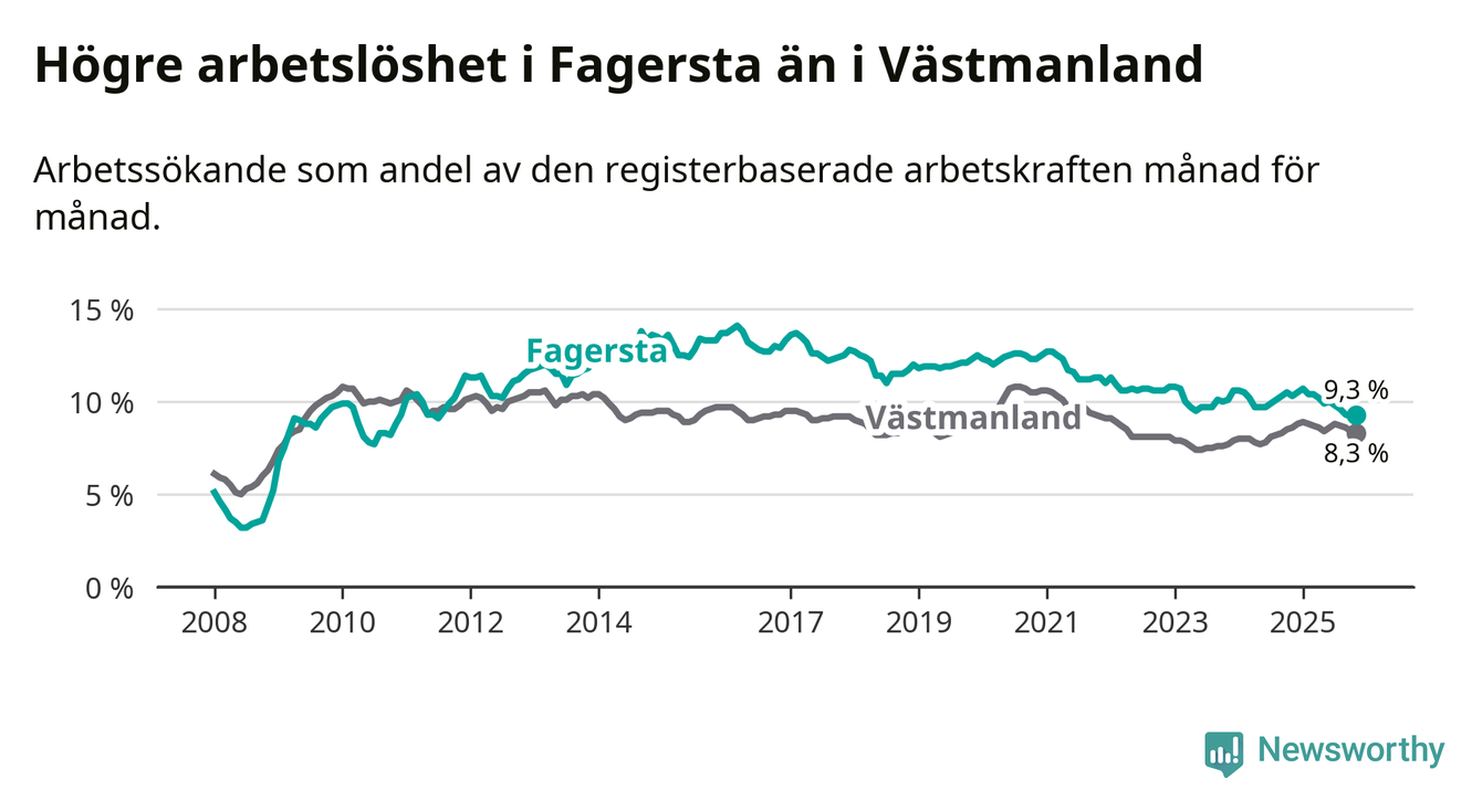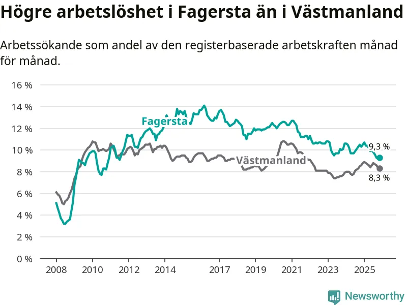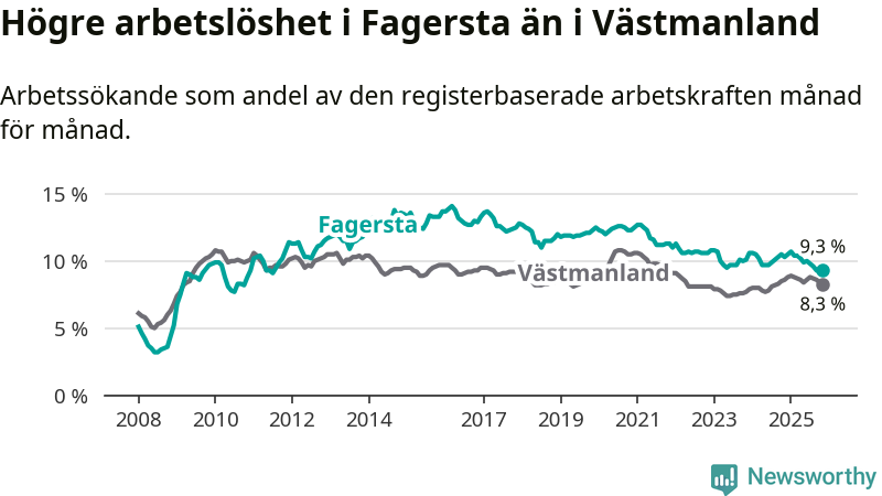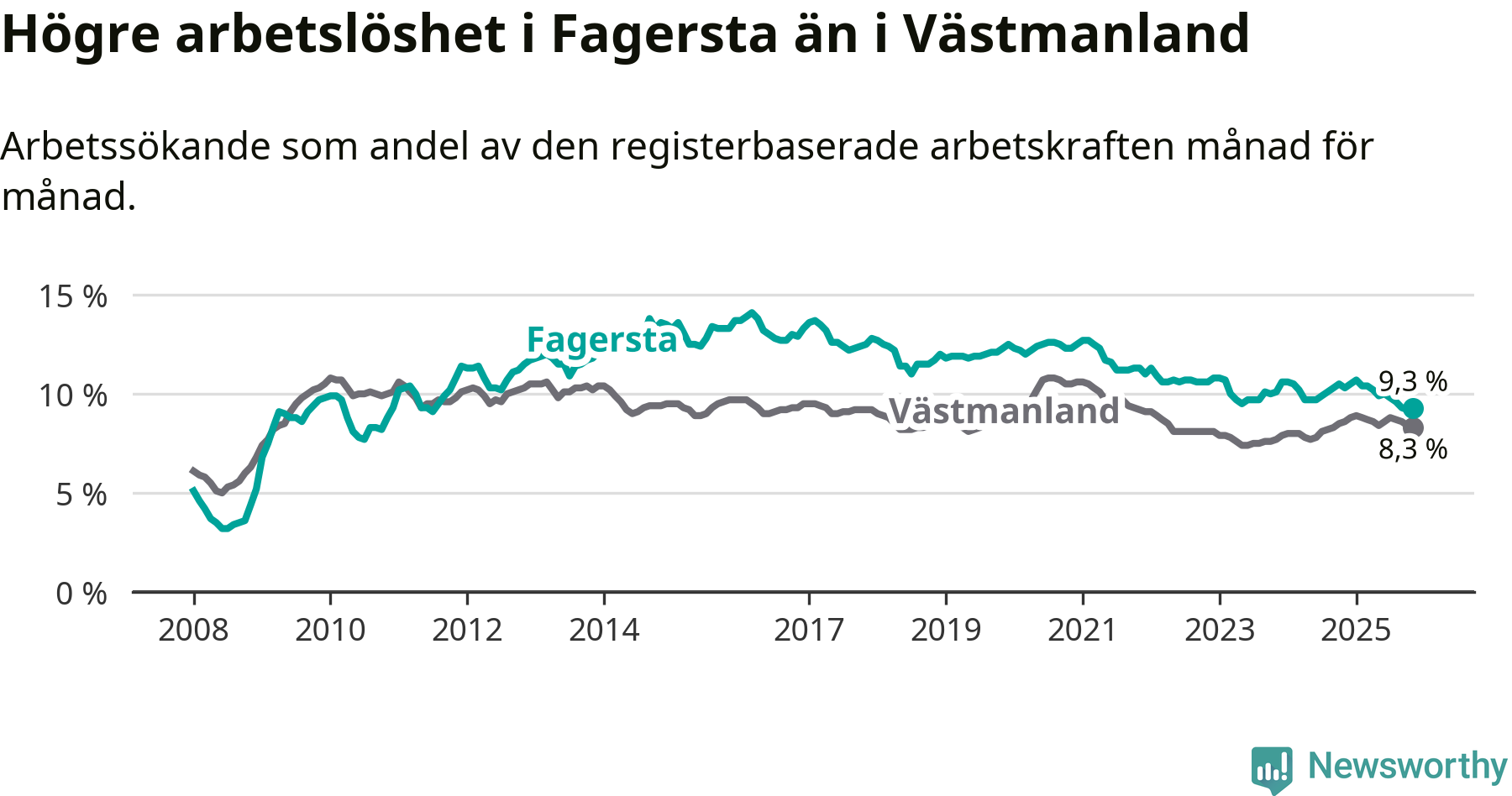 Under november månad rapporterade Fagersta kommun en total arbetslöshet på 9,3 procent. Det är en minskning jämfört med samma tidpunkt i fjol (−1,0 procentenheter). Även i Västmanlands län sjunker arbetslösheten .