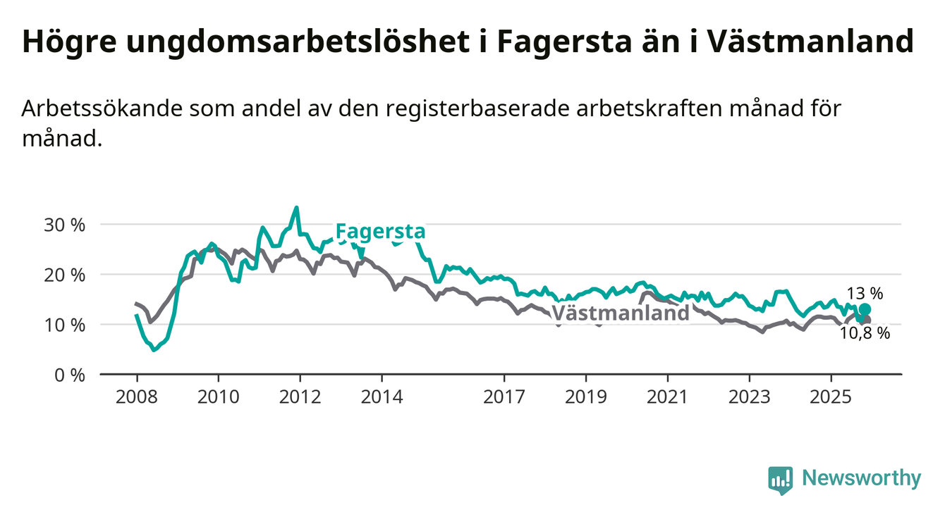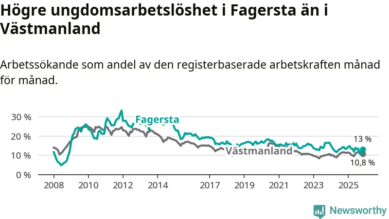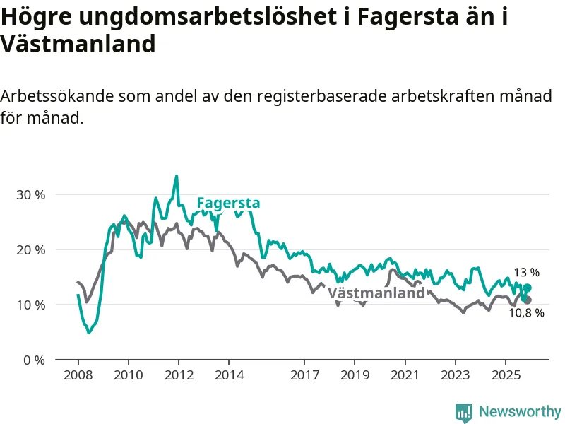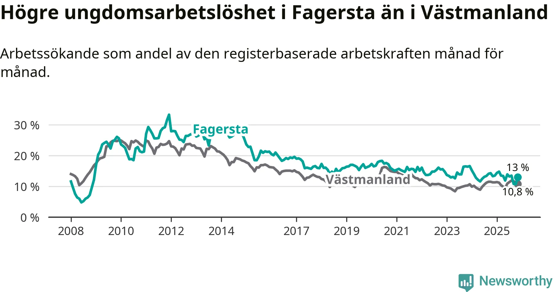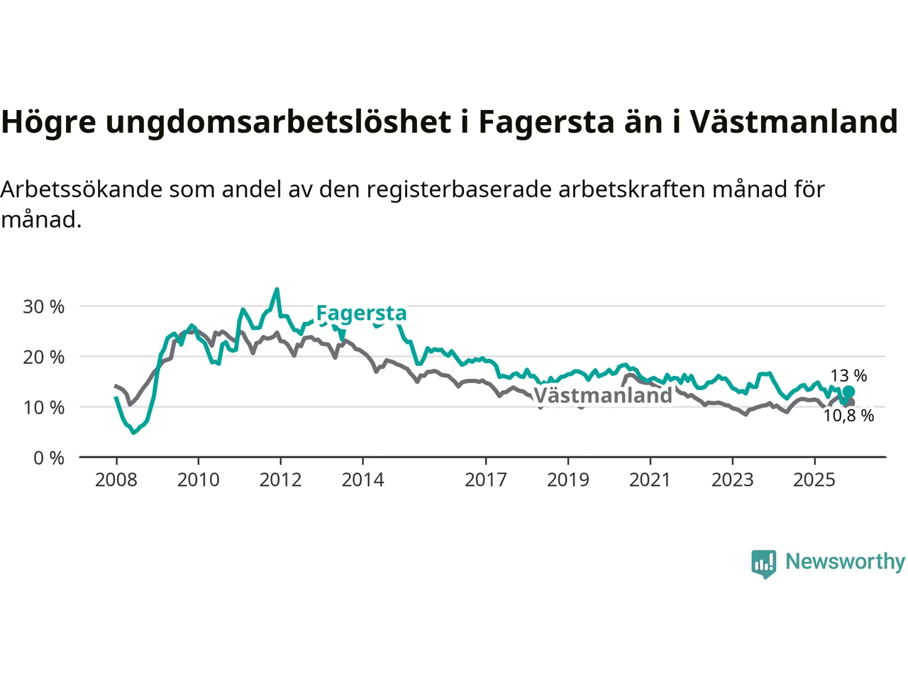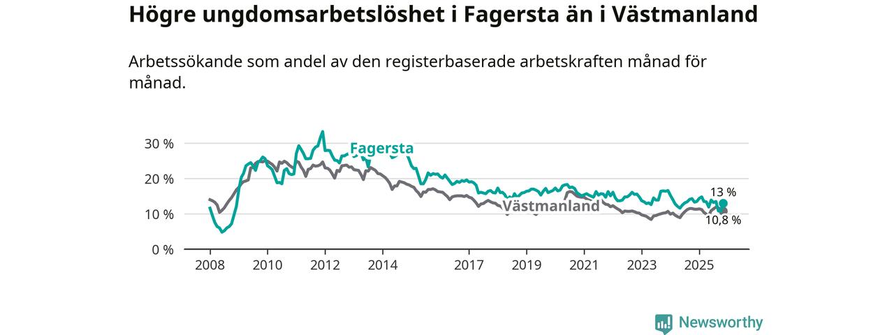 Precis som den totala arbetslösheten ligger ungdomsarbetslösheten i Fagersta högre än i Västmanland som helhet. Skillnaden mellan kommunen och länet är 2,2 procentenheter.