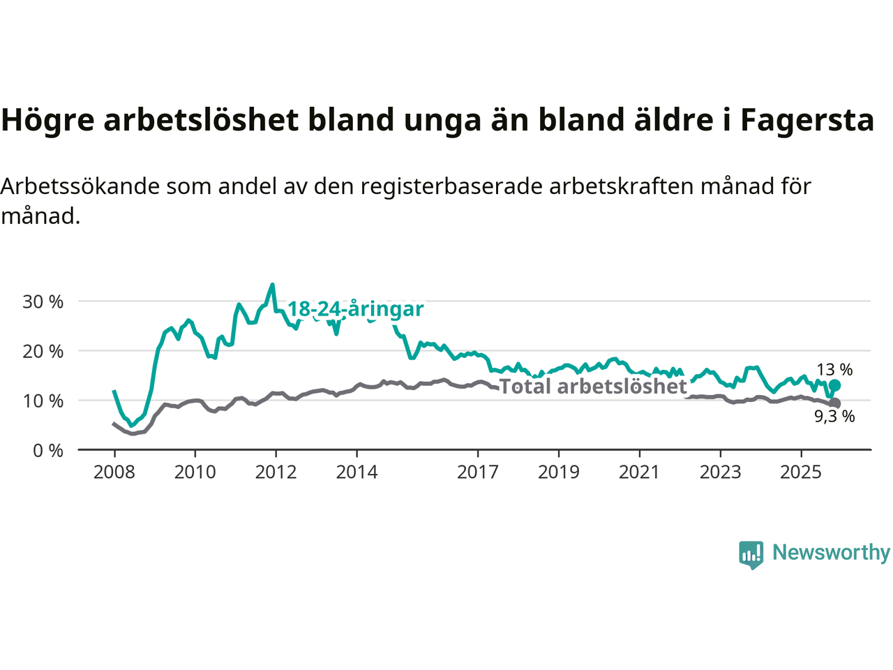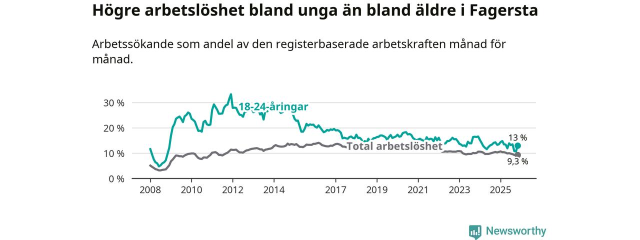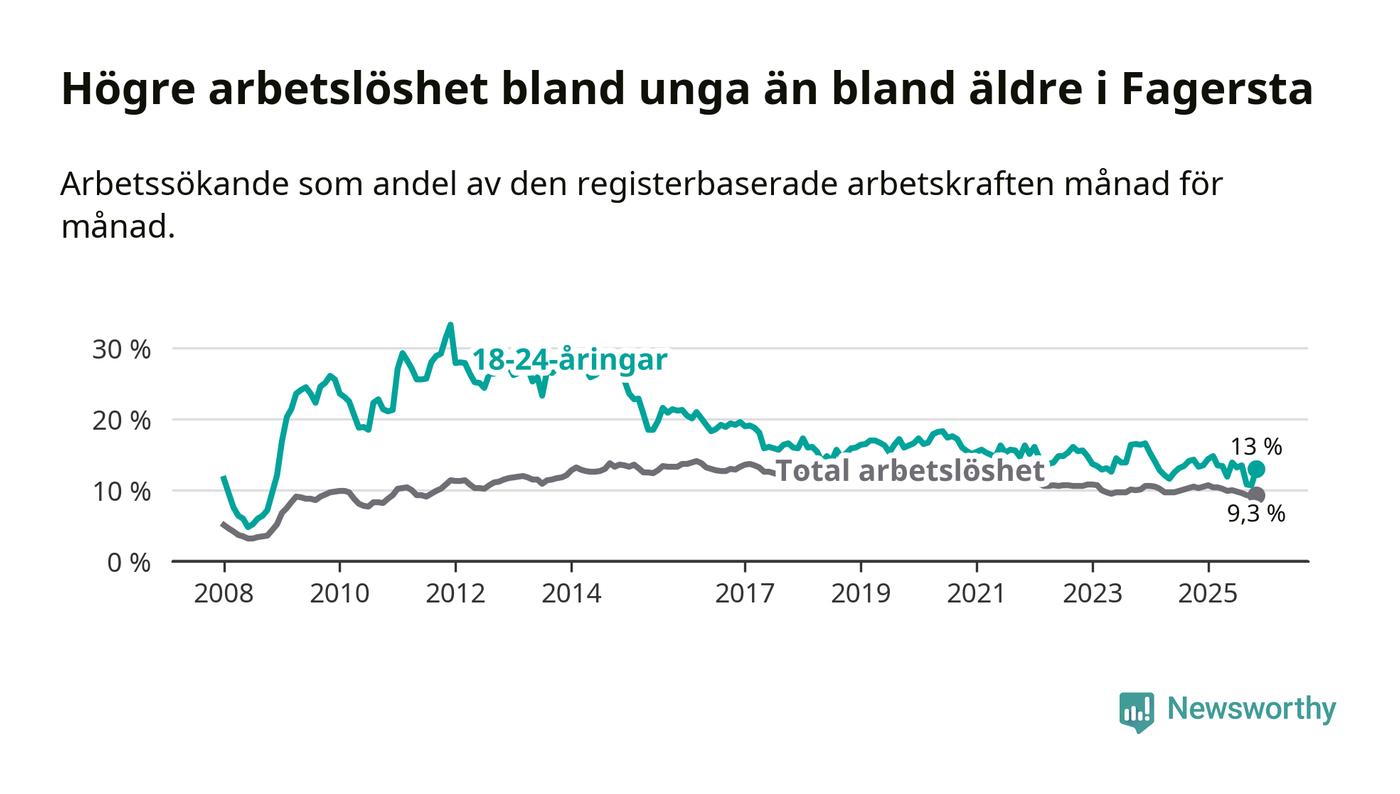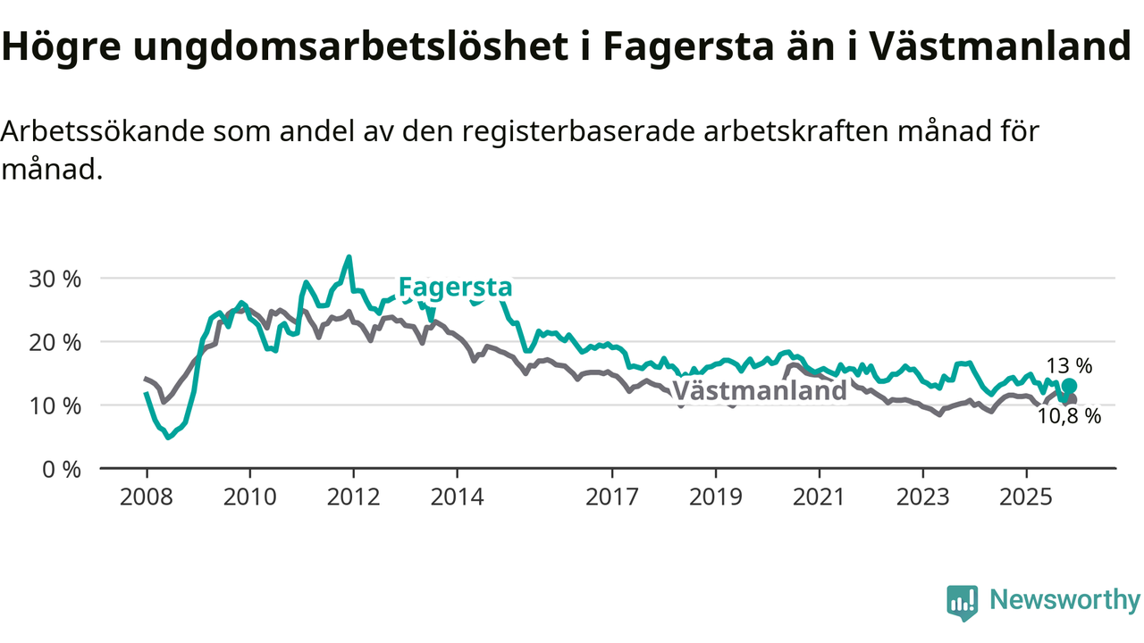 Precis som den totala arbetslösheten ligger ungdomsarbetslösheten i Fagersta högre än i Västmanland som helhet. Skillnaden mellan kommunen och länet är 2,2 procentenheter.