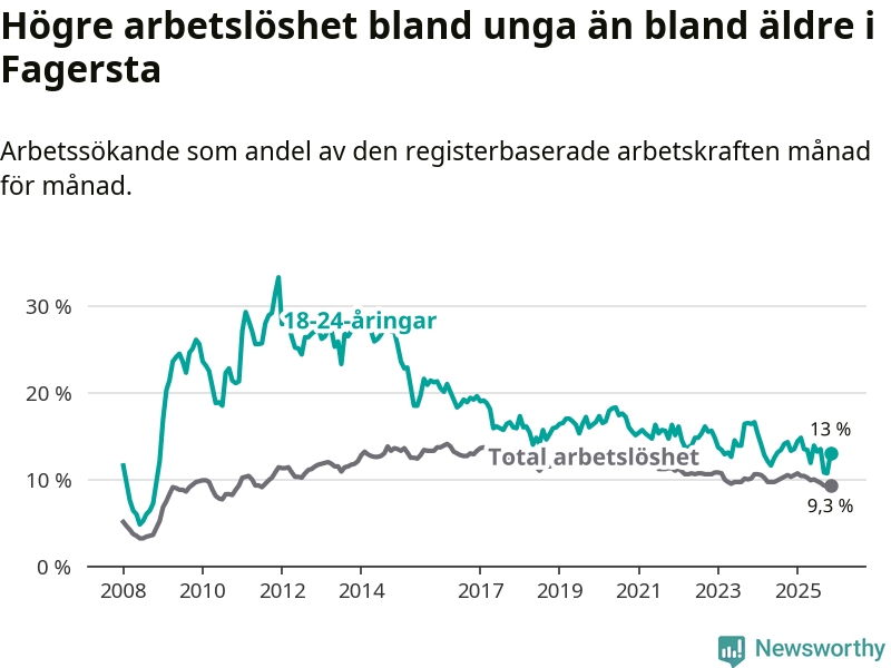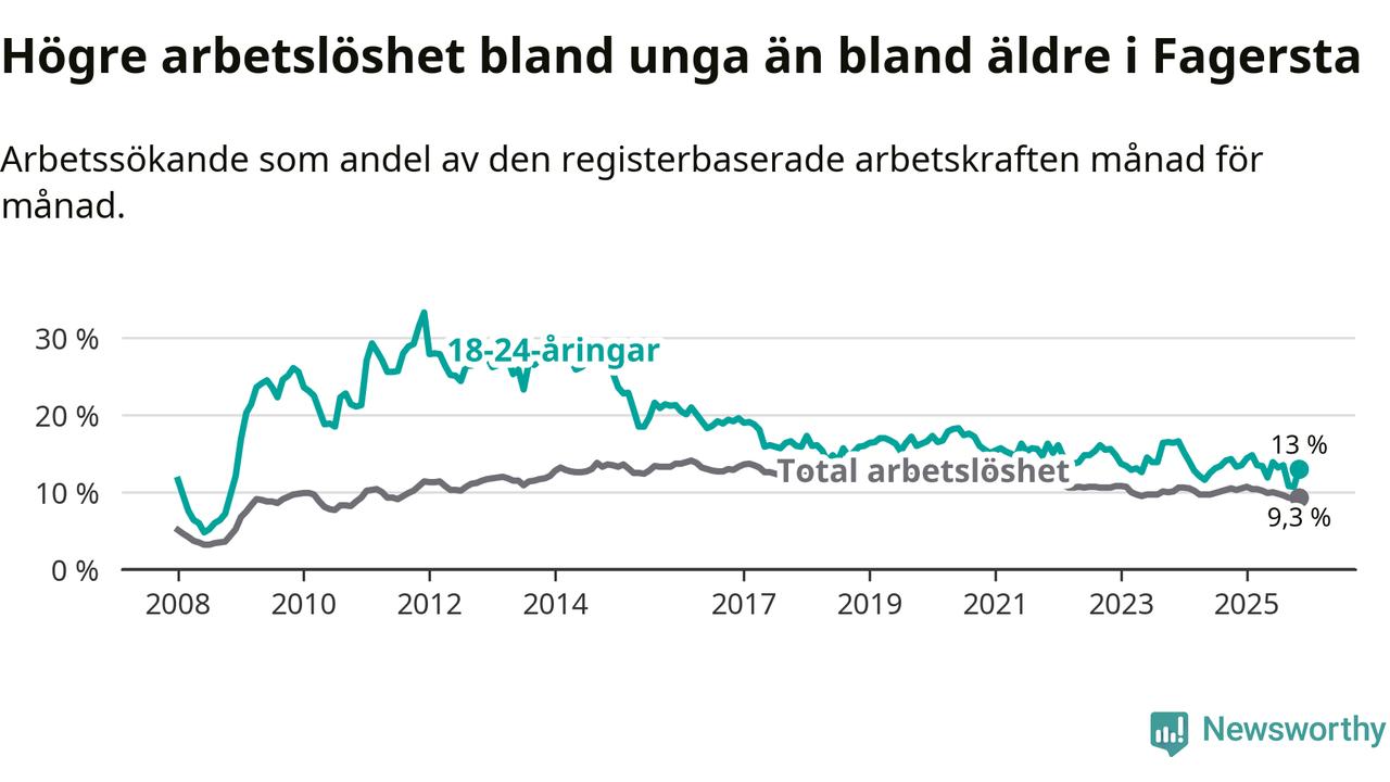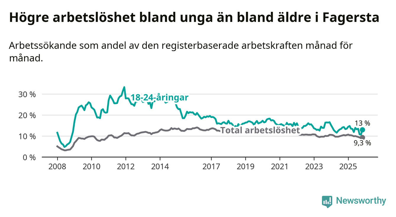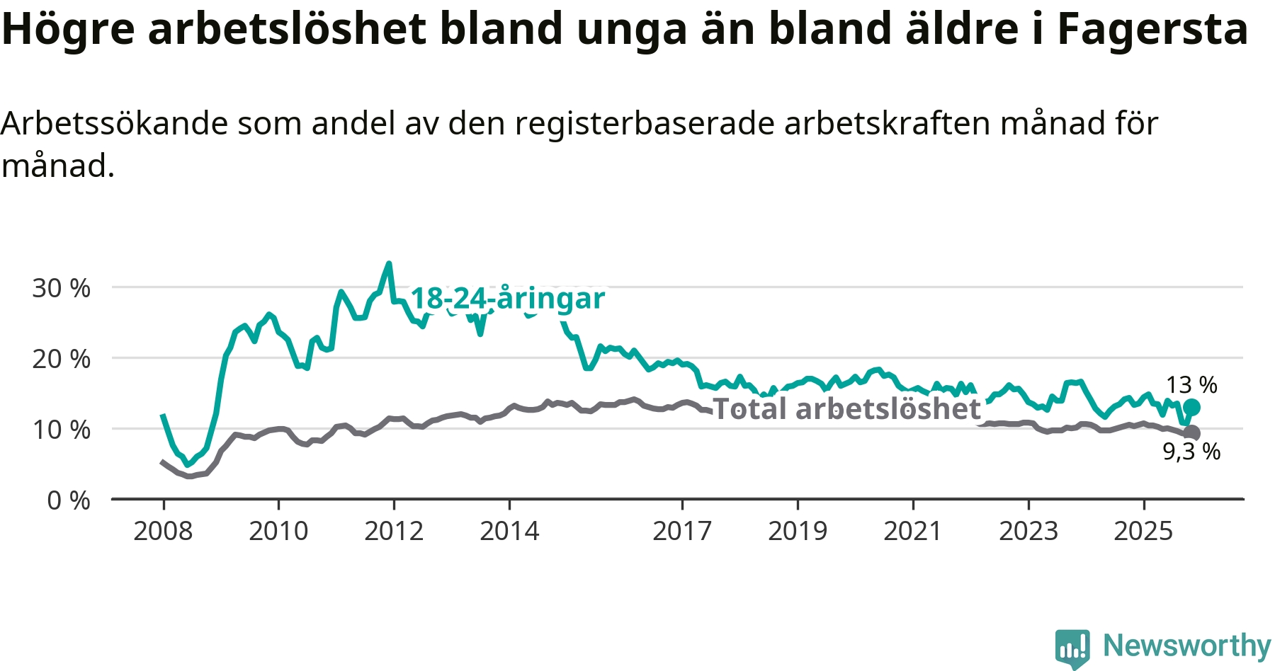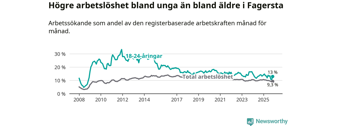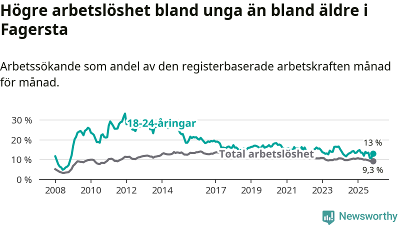 Precis som den totala arbetslösheten ligger ungdomsarbetslösheten i Fagersta högre än i Västmanland som helhet. Skillnaden mellan kommunen och länet är 2,2 procentenheter.