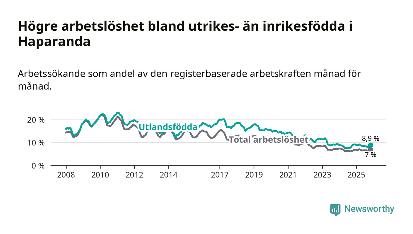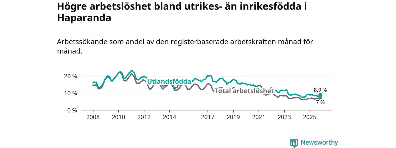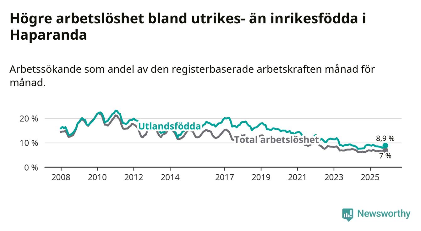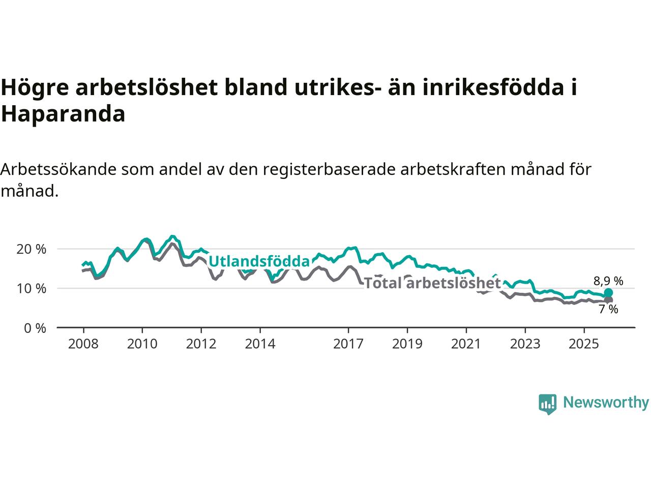 Arbetslösheten bland utlandsfödda var 8,9 procent i Haparanda under november månad, motsvarande 117 av 1 315 personer. Det är 0,2 procentenheter färre än vid samma tidpunkt i fjol (−3 om man räknar personer).