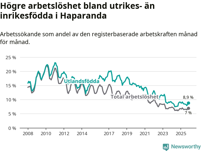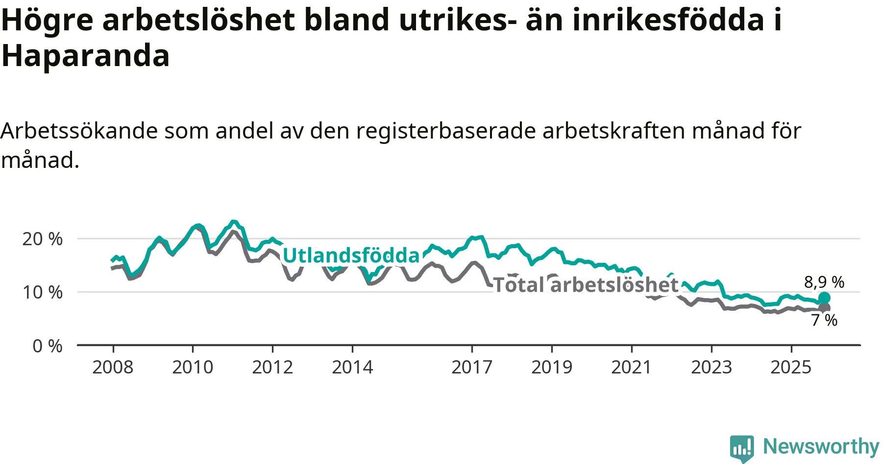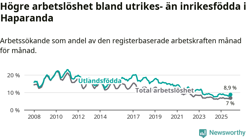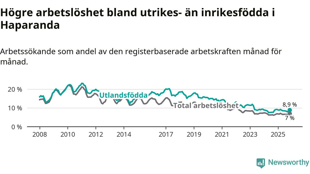 Arbetslösheten bland utlandsfödda var 8,9 procent i Haparanda under november månad, motsvarande 117 av 1 315 personer. Det är 0,2 procentenheter färre än vid samma tidpunkt i fjol (−3 om man räknar personer).