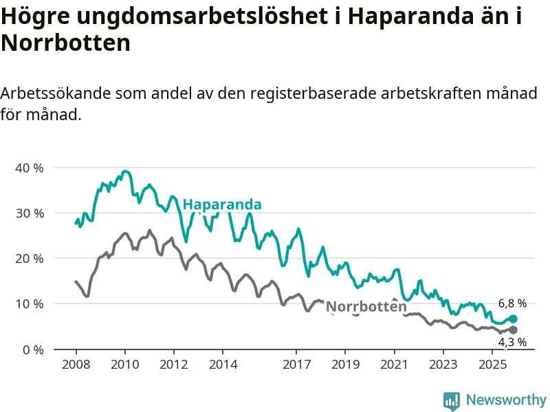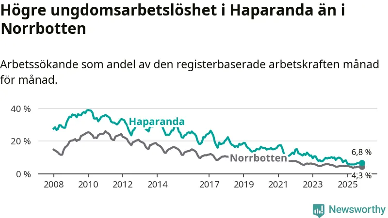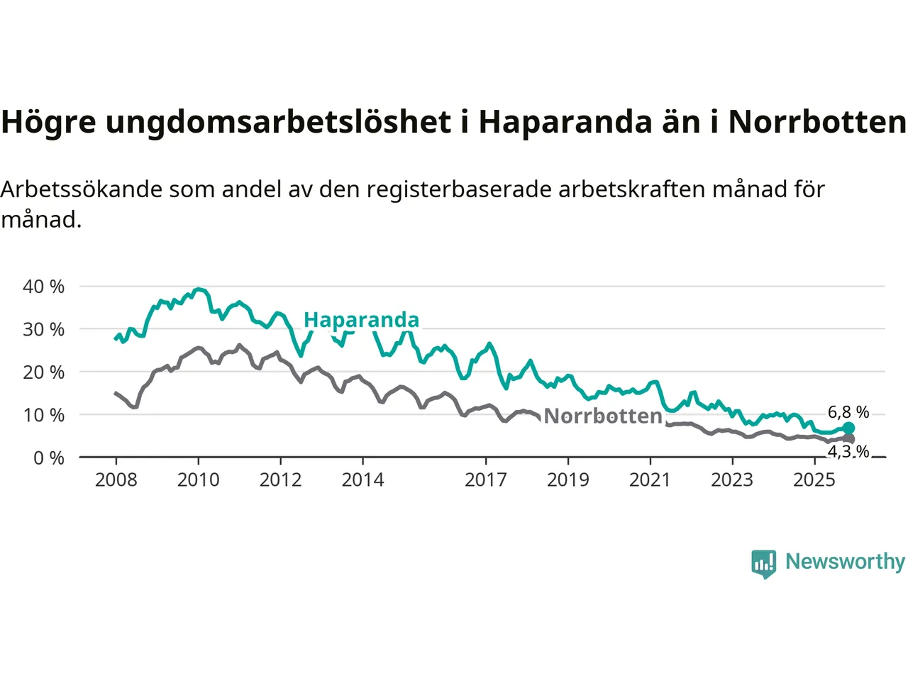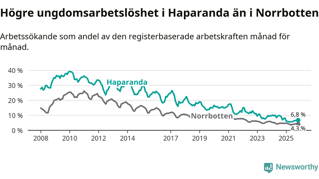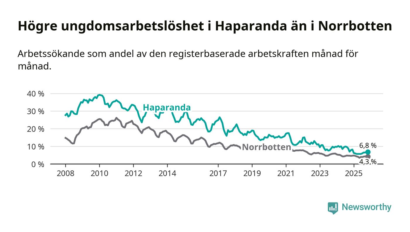 Precis som den totala arbetslösheten ligger ungdomsarbetslösheten i Haparanda högre än i Norrbotten som helhet. Skillnaden mellan kommunen och länet är 2,5 procentenheter.