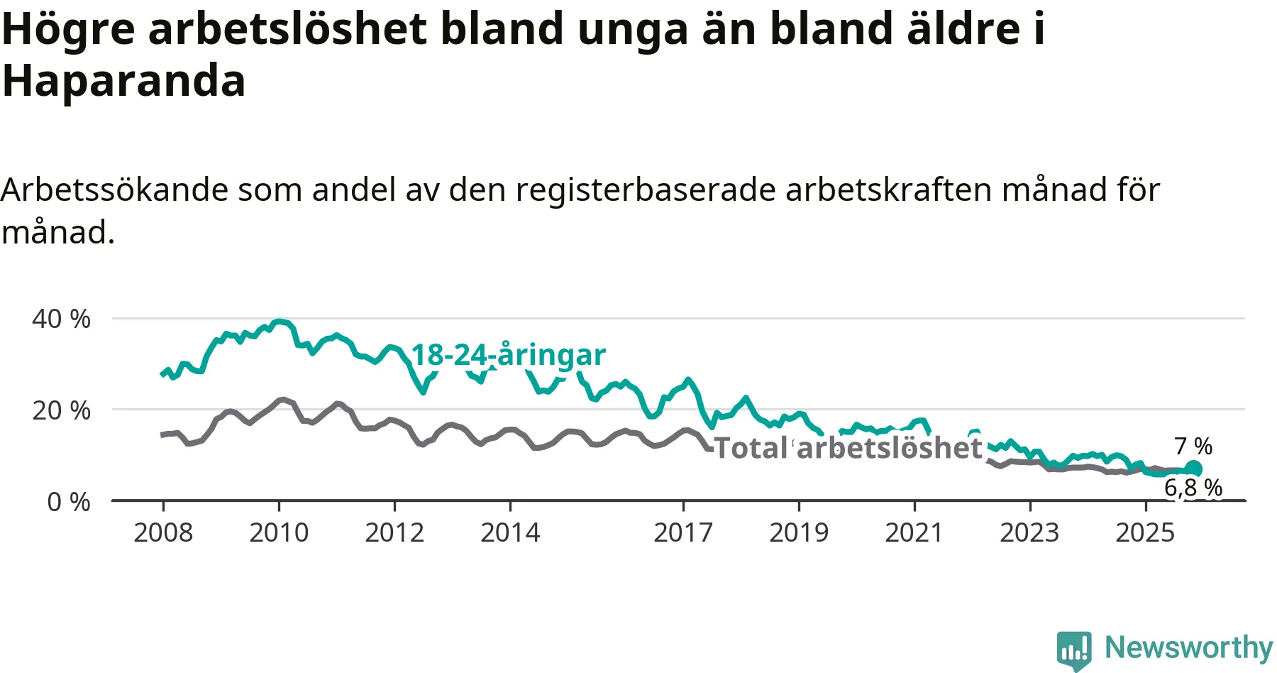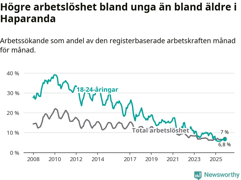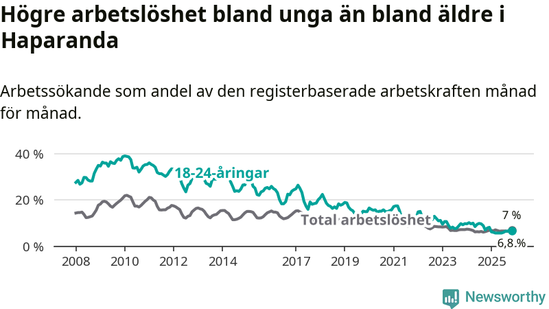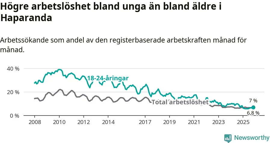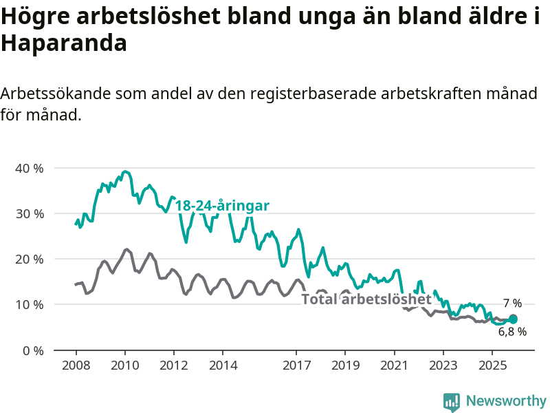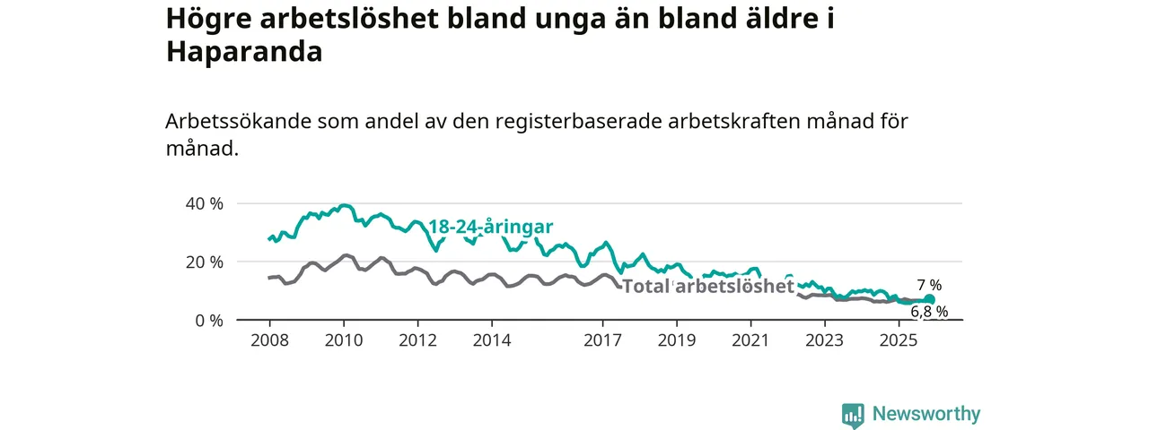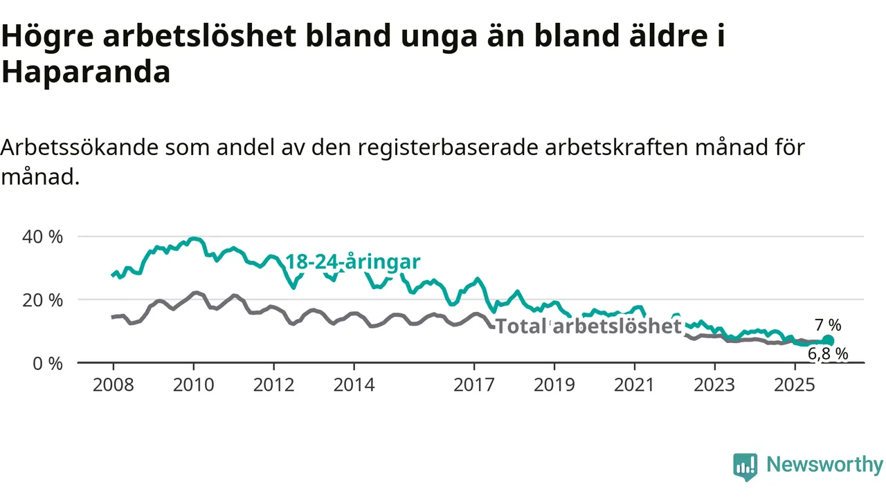Precis som den totala arbetslösheten ligger ungdomsarbetslösheten i Haparanda högre än i Norrbotten som helhet. Skillnaden mellan kommunen och länet är 2,5 procentenheter.