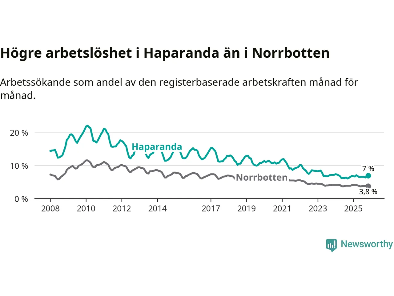 Under november månad rapporterade Haparanda kommun en total arbetslöshet på 7,0 procent. Det är en ökning jämfört med samma tidpunkt i fjol (+0,4 procentenheter). I Norrbottens län däremot sjunker arbetslösheten något.