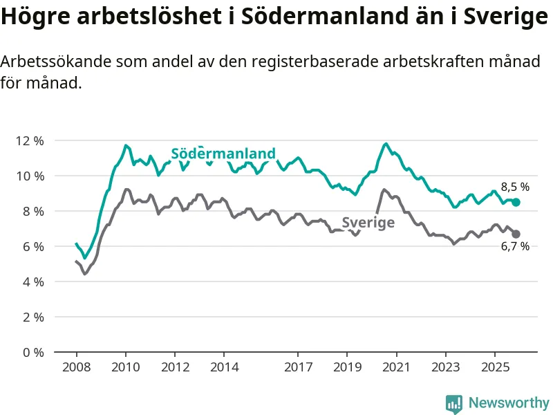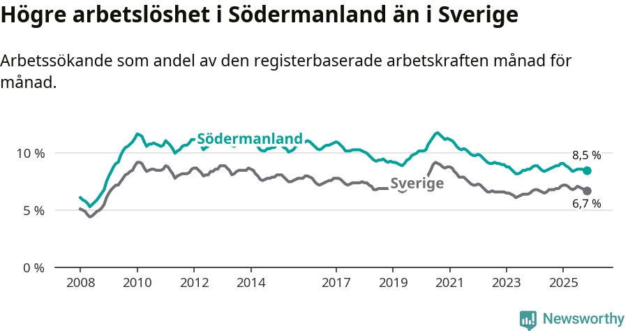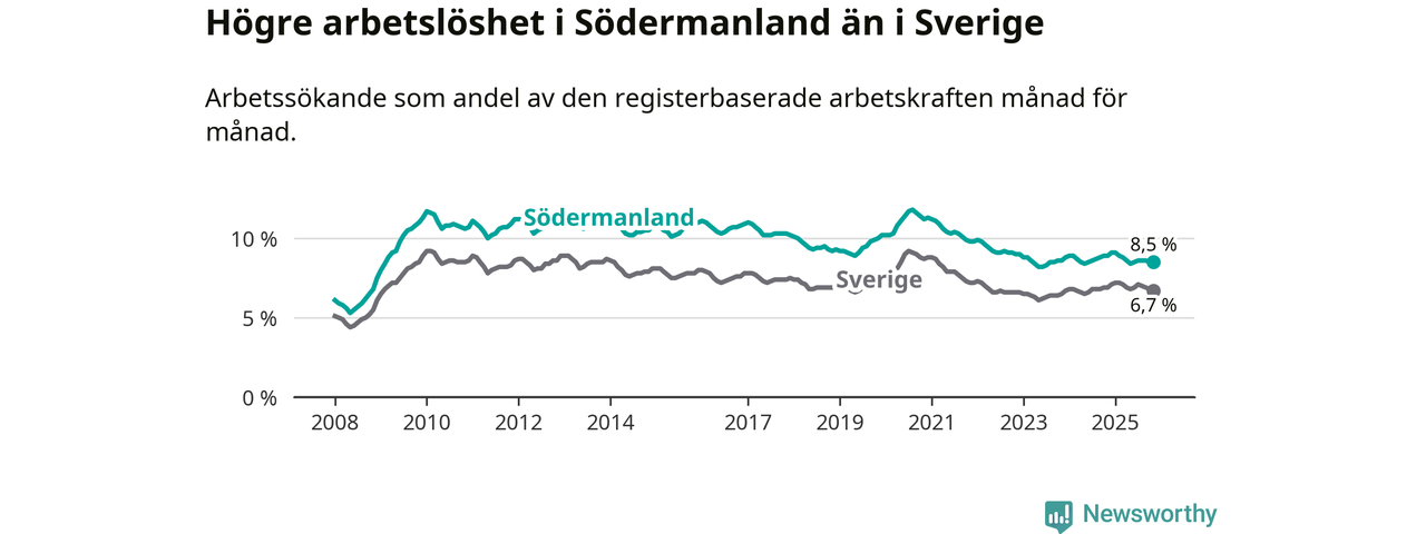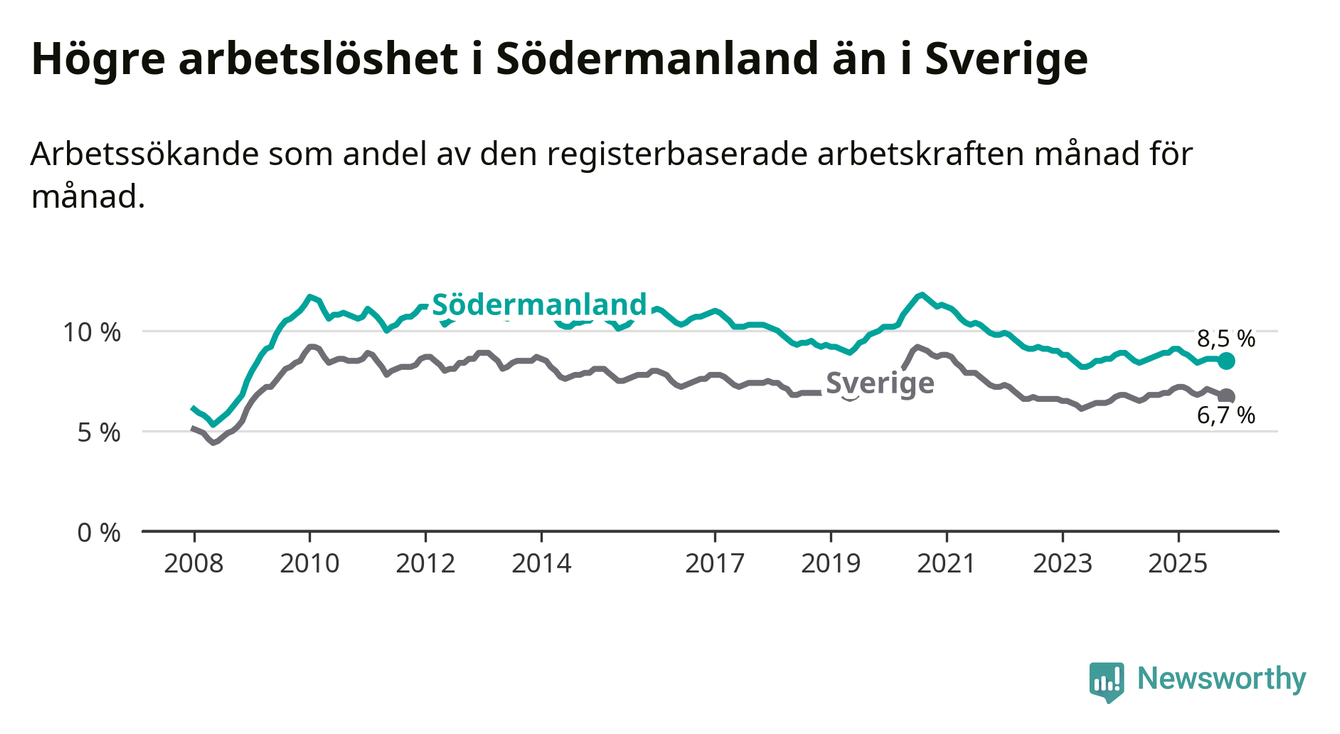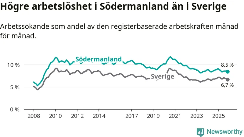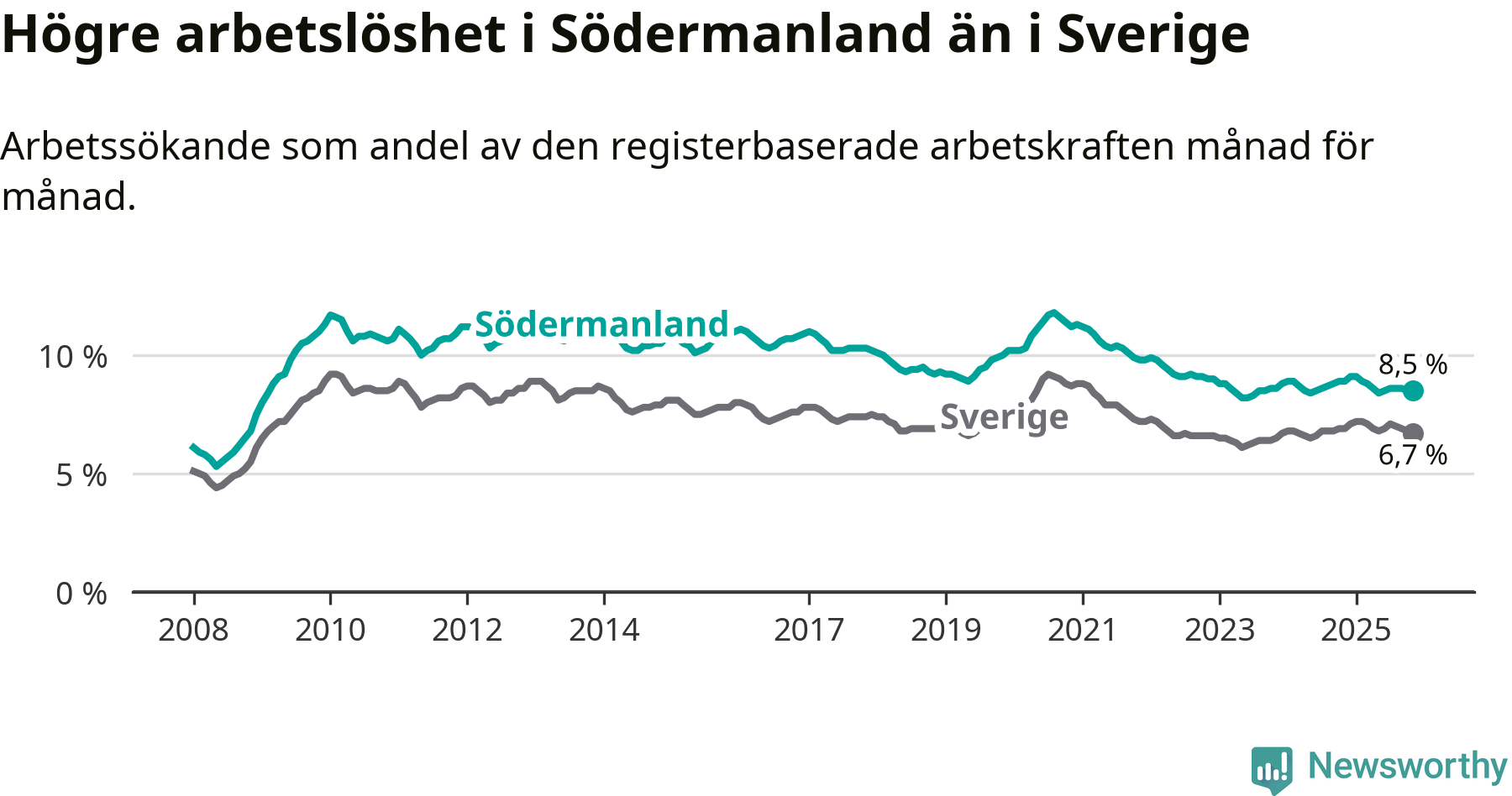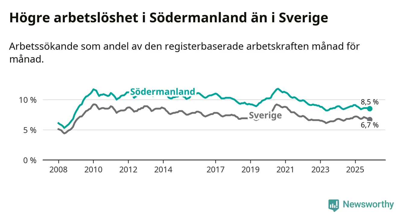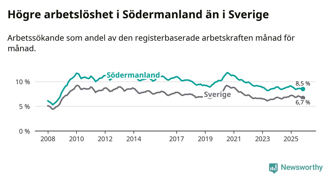 Under november månad rapporterade Södermanlands län en total arbetslöshet på 8,5 procent. Det är en minskning jämfört med samma tidpunkt i fjol (−0,4 procentenheter). Även i Sverige sjunker arbetslösheten .