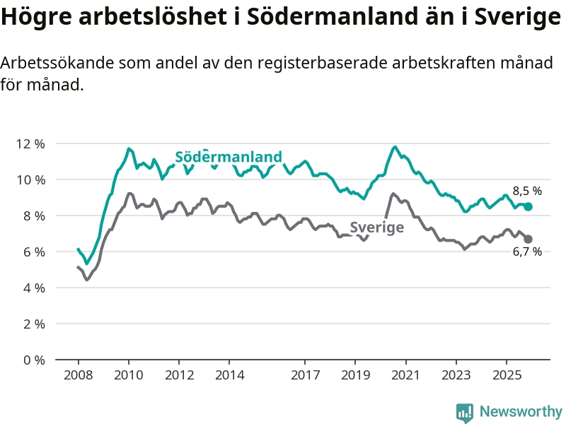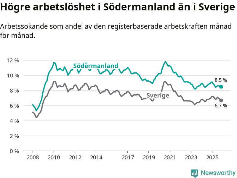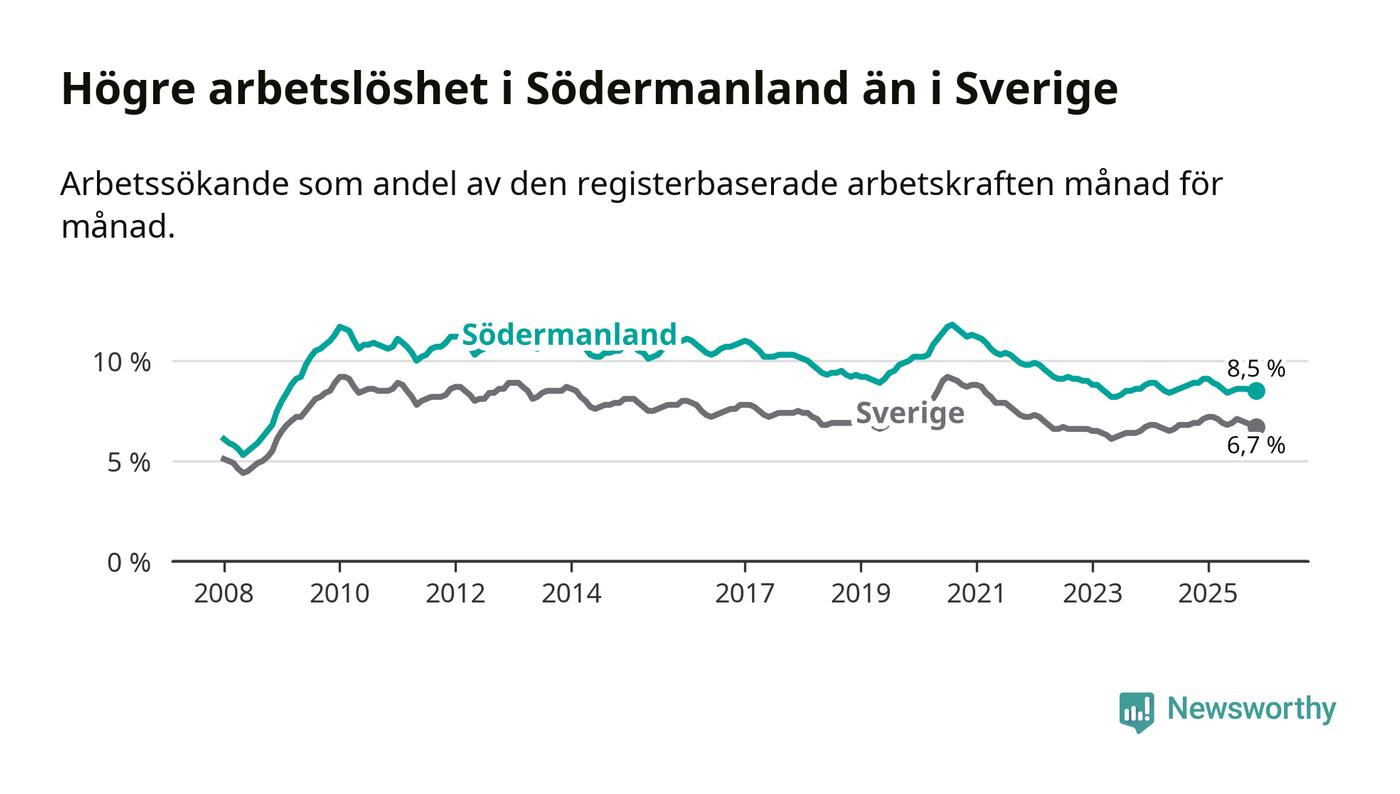 Även om arbetslösheten i Södermanland alltså minskar, så ligger den fortfarande över snittet i hela Sverige (8,5 procent i länet, jämfört med 6,7 procent i hela riket). Norrbotten har den lägsta arbetslösheten i riket (3,8 procent), medan Skåne har den högsta (8,8 procent). För att Södermanland skulle komma ner i samma arbetslöshetsnivå som Norrbotten skulle 6 676 personer behöva sysselsättas.