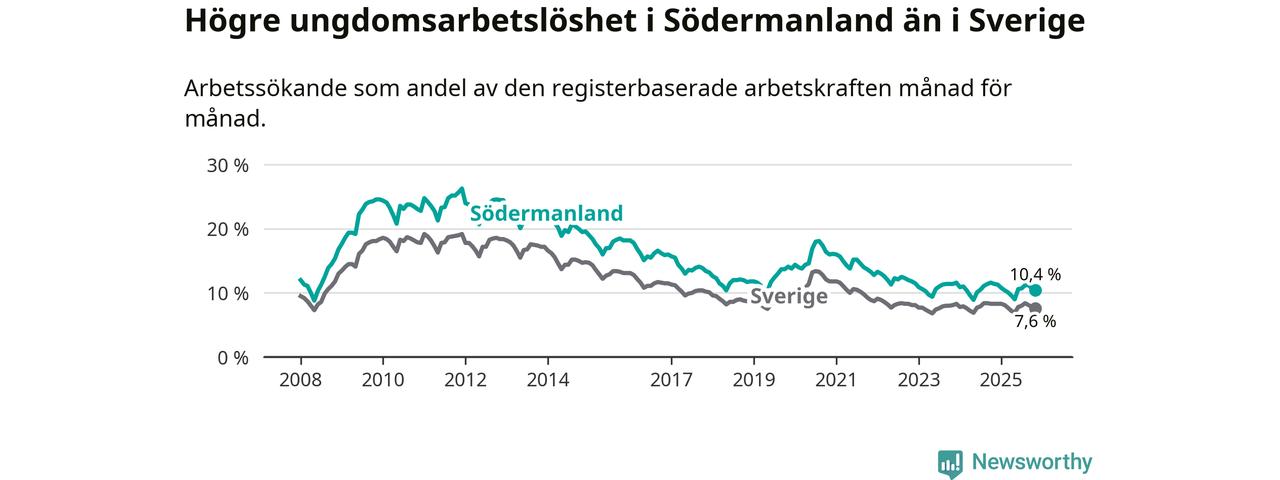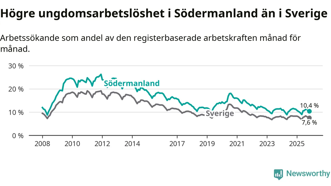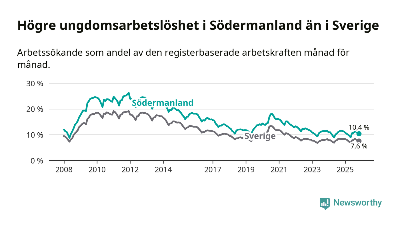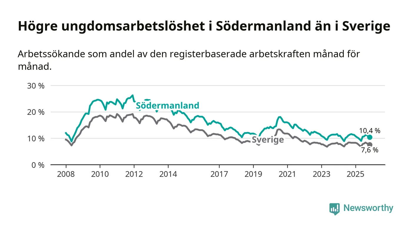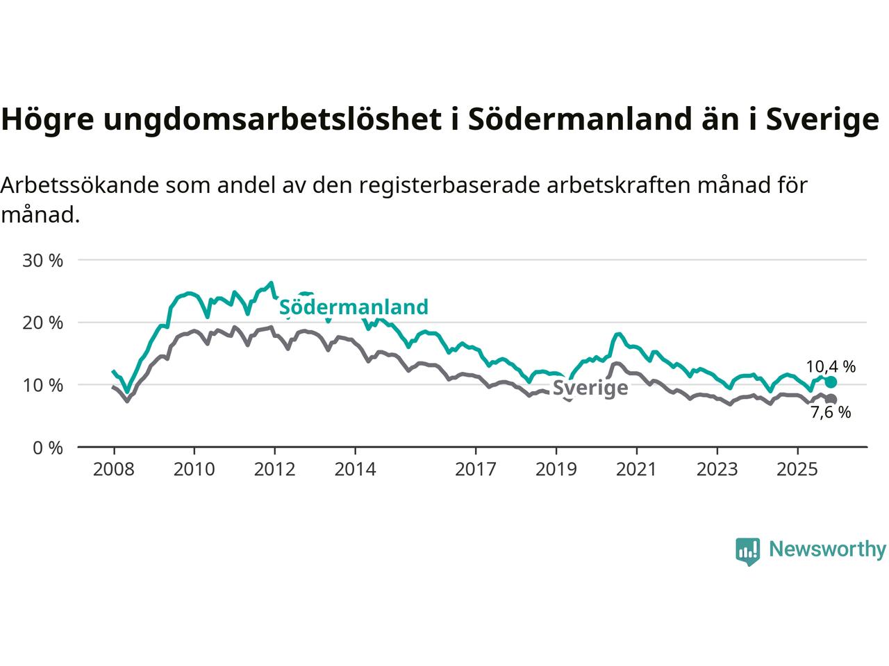 Graf: Arbetslöshet bland unga i Södermanlands län och Sverige