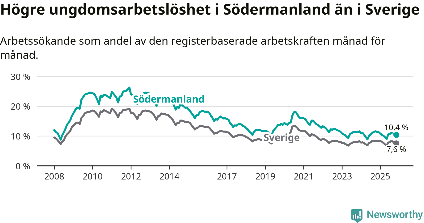 Precis som den totala arbetslösheten ligger ungdomsarbetslösheten i Södermanland högre än i Sverige som helhet. Skillnaden mellan länet och riket är 2,8 procentenheter.