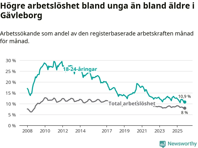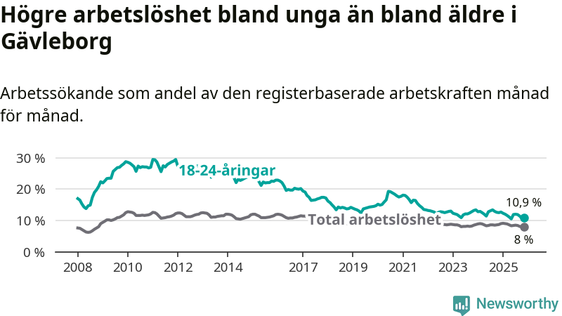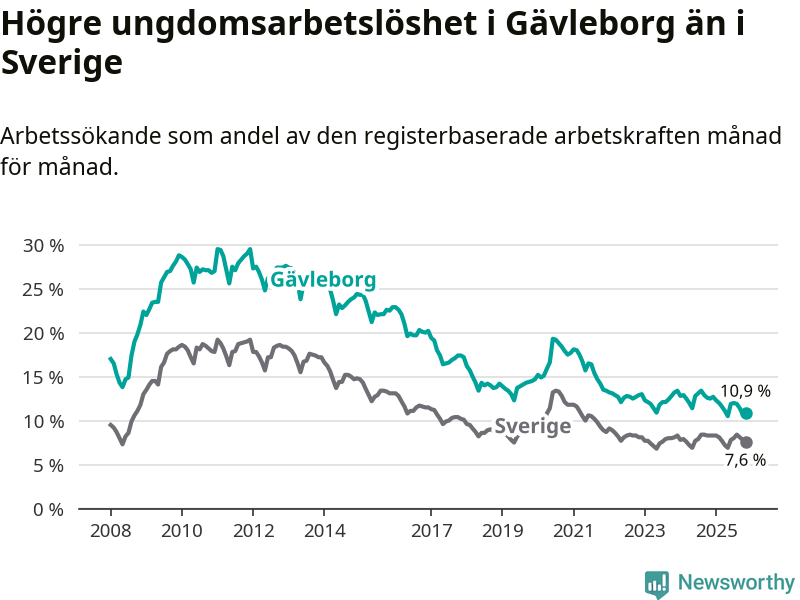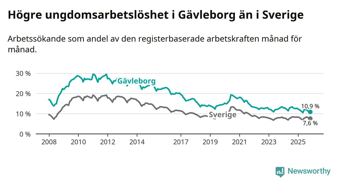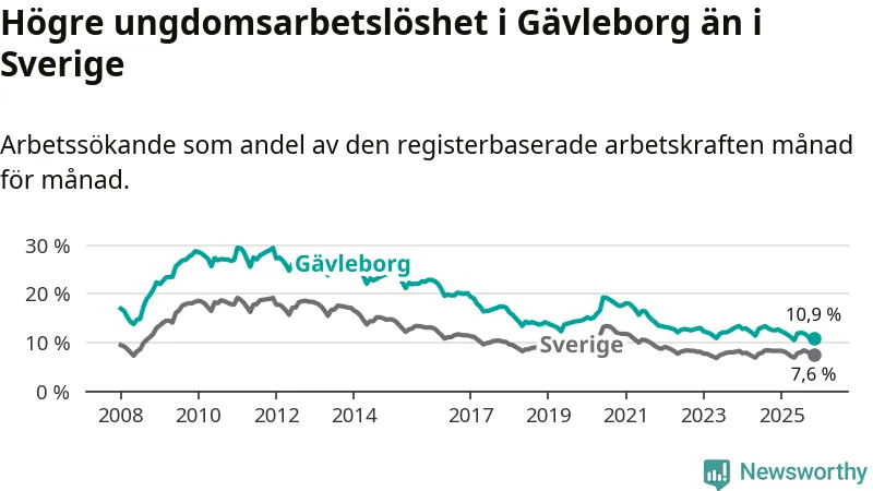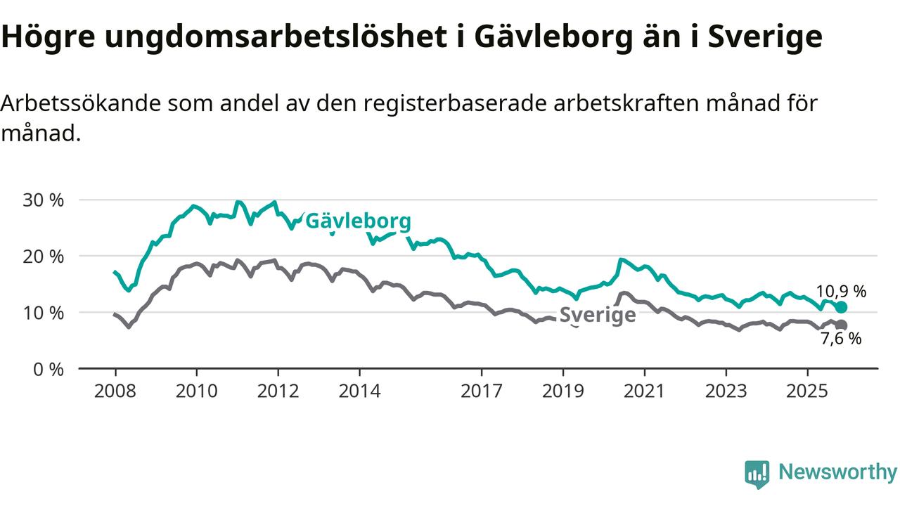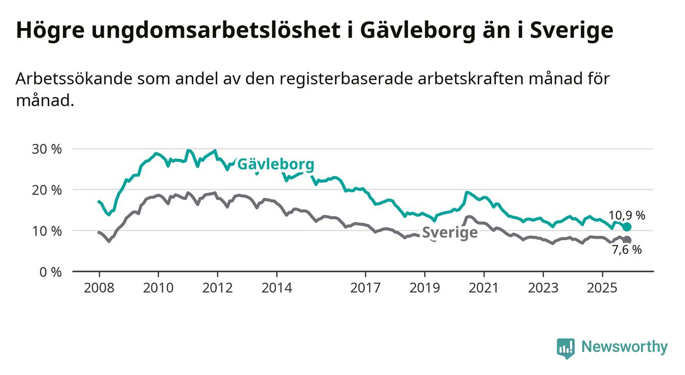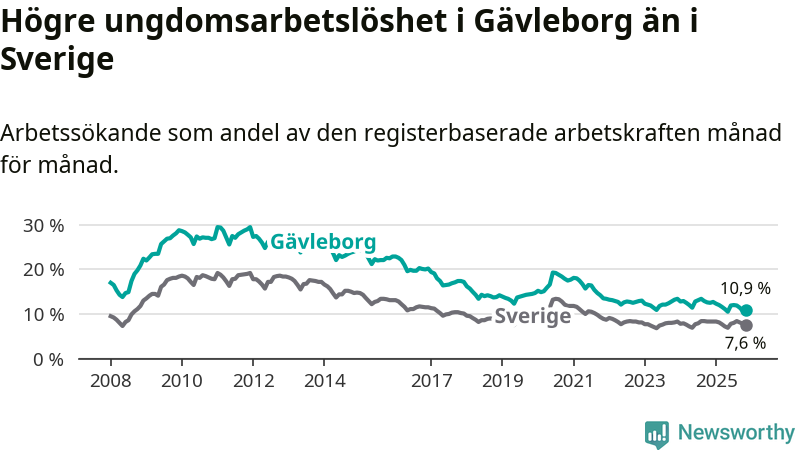 Precis som den totala arbetslösheten ligger ungdomsarbetslösheten i Gävleborg högre än i Sverige som helhet. Skillnaden mellan länet och riket är 3,3 procentenheter.
