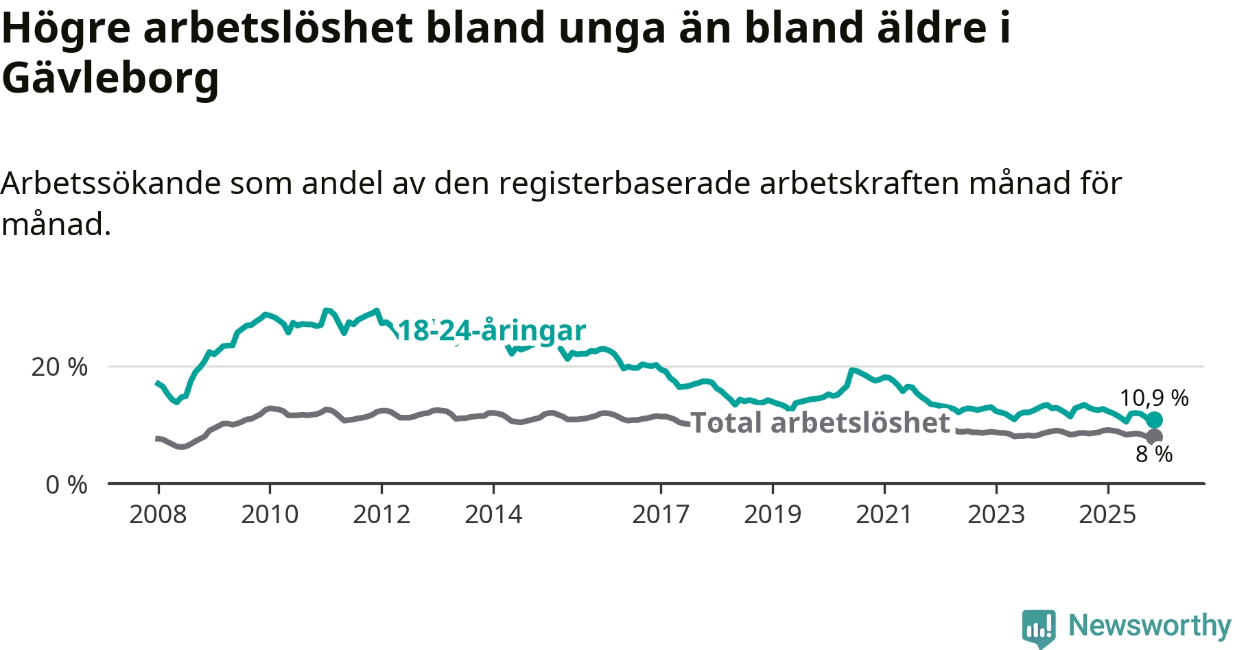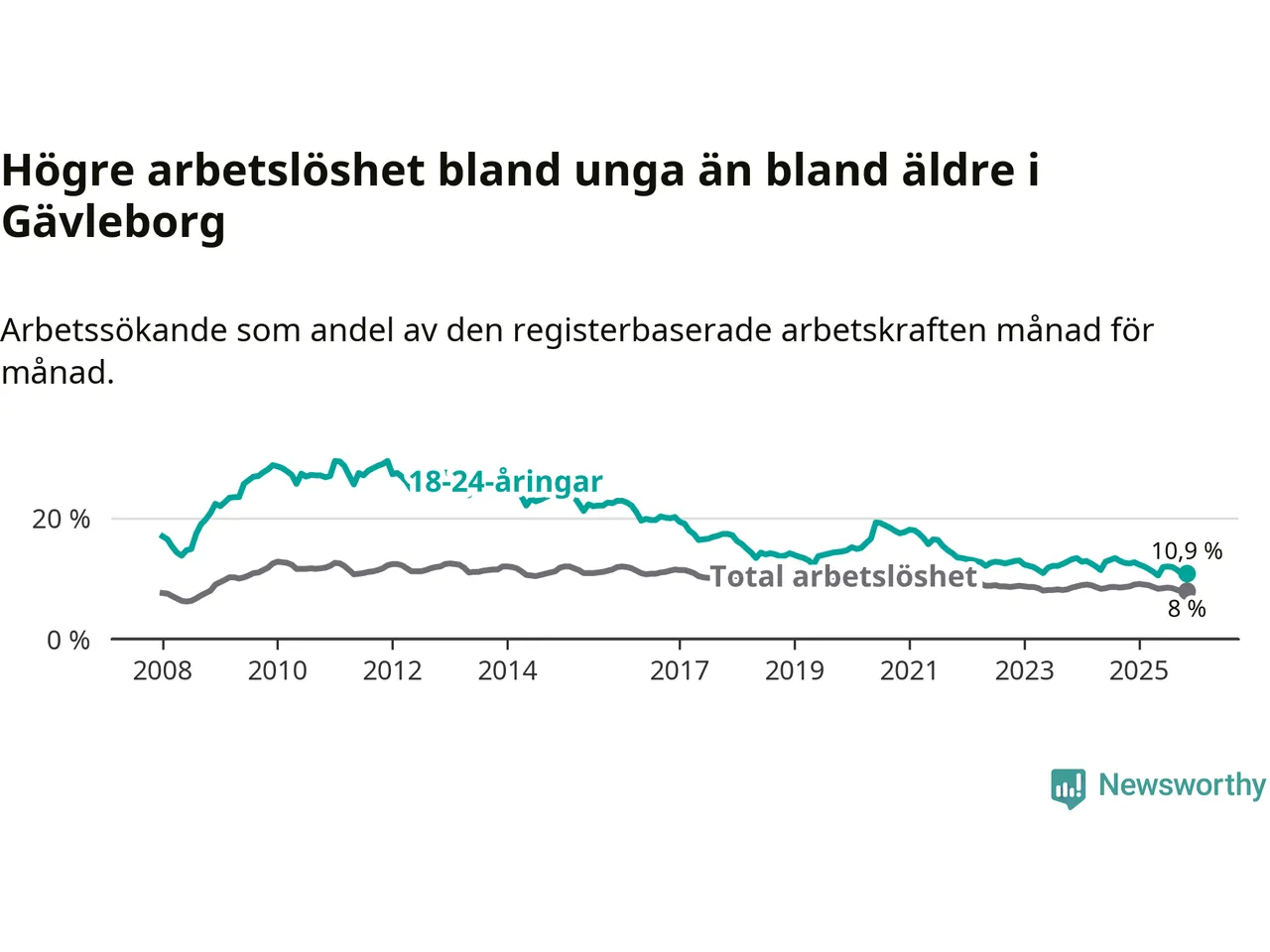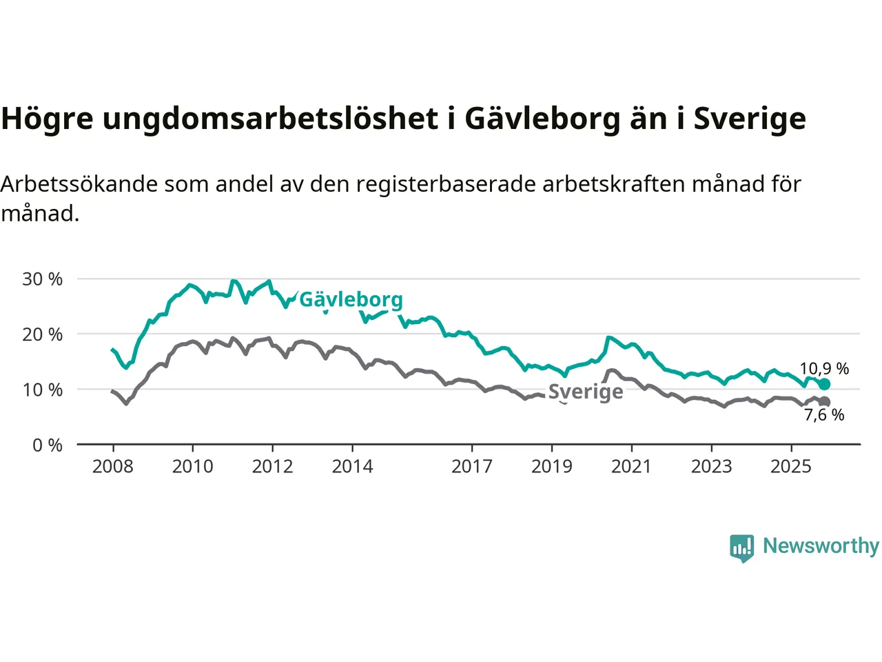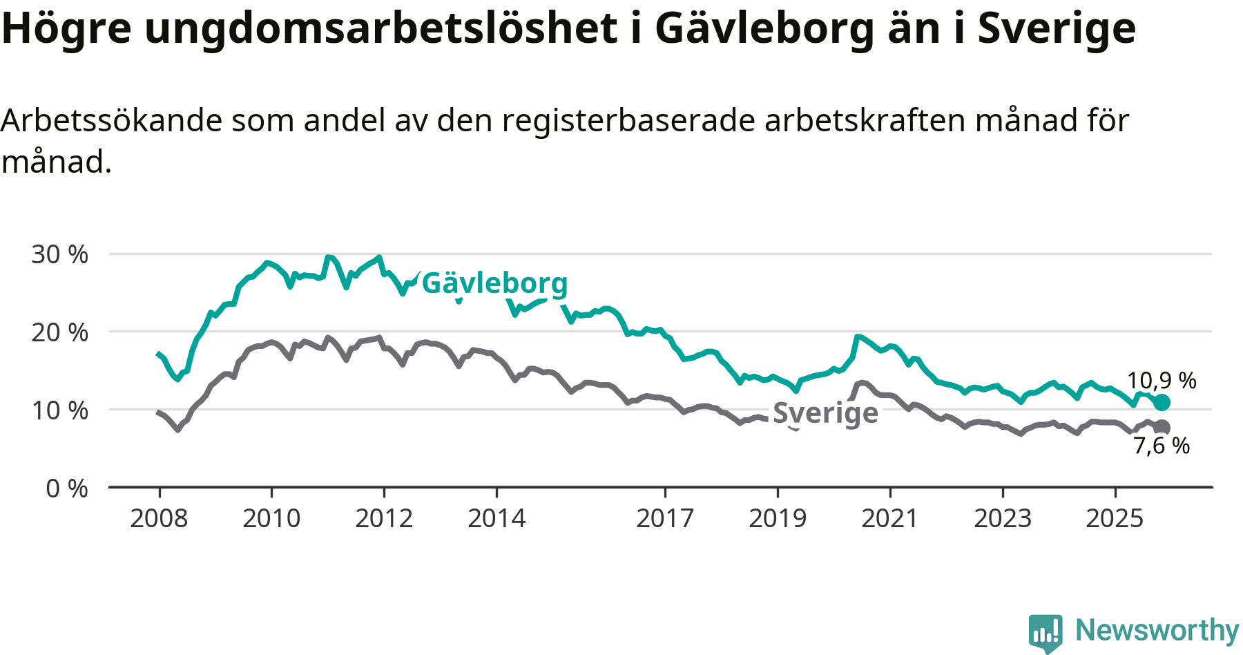 Precis som den totala arbetslösheten ligger ungdomsarbetslösheten i Gävleborg högre än i Sverige som helhet. Skillnaden mellan länet och riket är 3,3 procentenheter.
