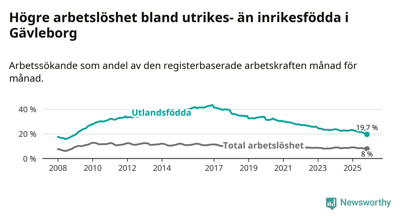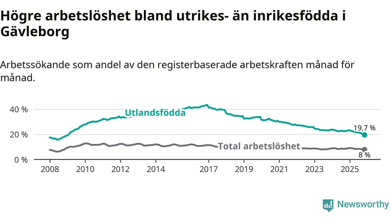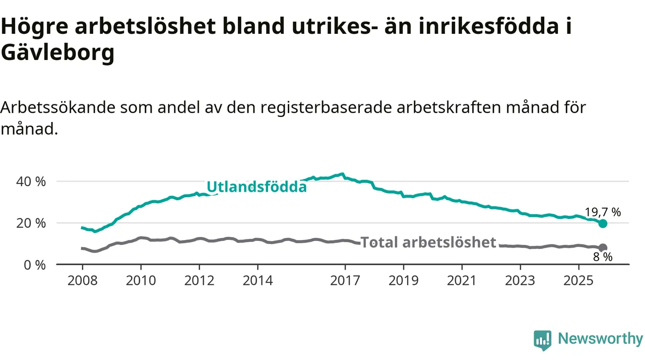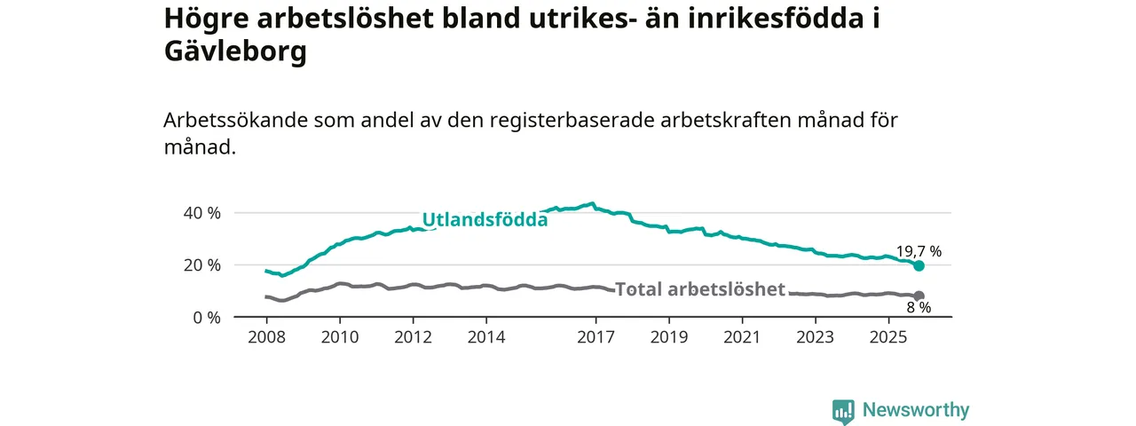 Arbetslösheten bland utlandsfödda var 19,7 procent i Gävleborg under november månad, motsvarande 4 736 av 24 041 personer. Det är 3,1 procentenheter färre än vid samma tidpunkt i fjol (−681 om man räknar personer). Därmed har de utlandsföddas arbetslöshet varit lägre än vid samma tidpunkt i fjol i över åtta år i sträck. Sedan februari 2017 har arbetslösheten bland utlandsfödda minskat från 41,4 till 19,7 procent. Den nuvarande arbetslöshetsnivån är den lägsta sedan januari 2009.