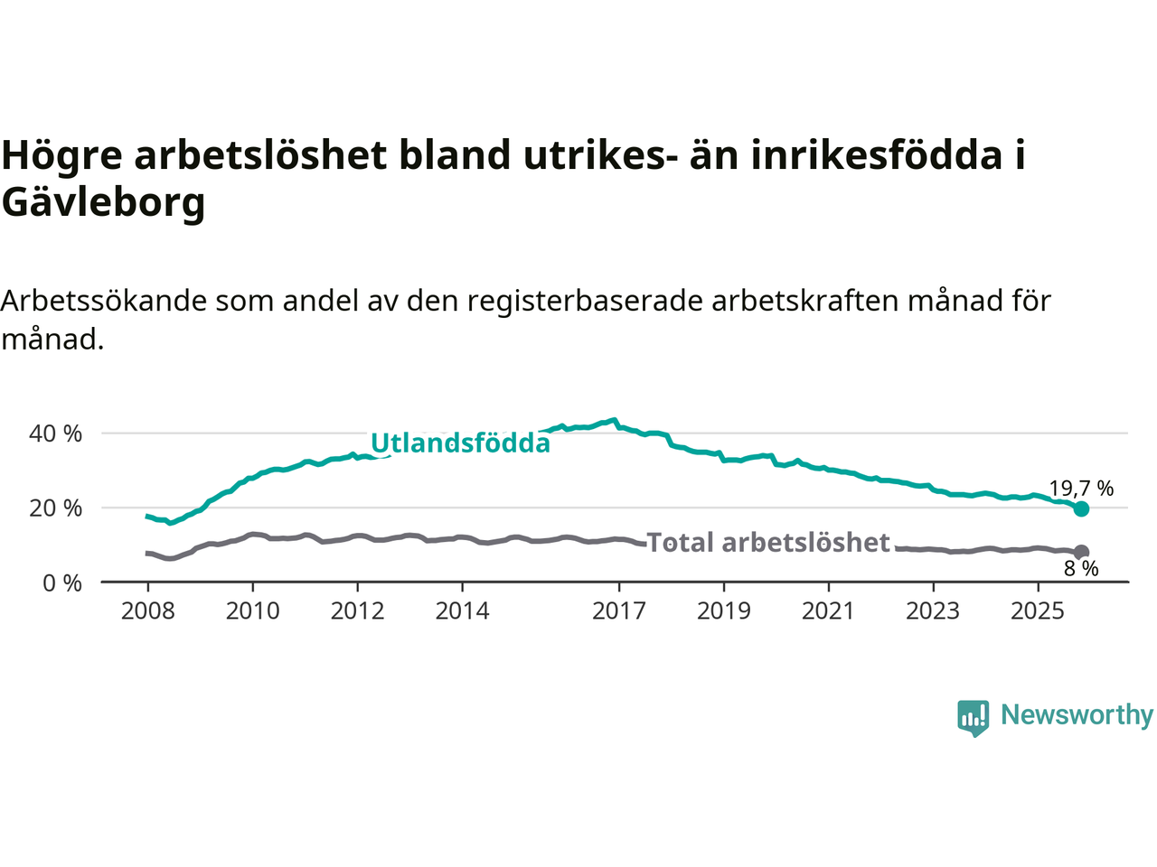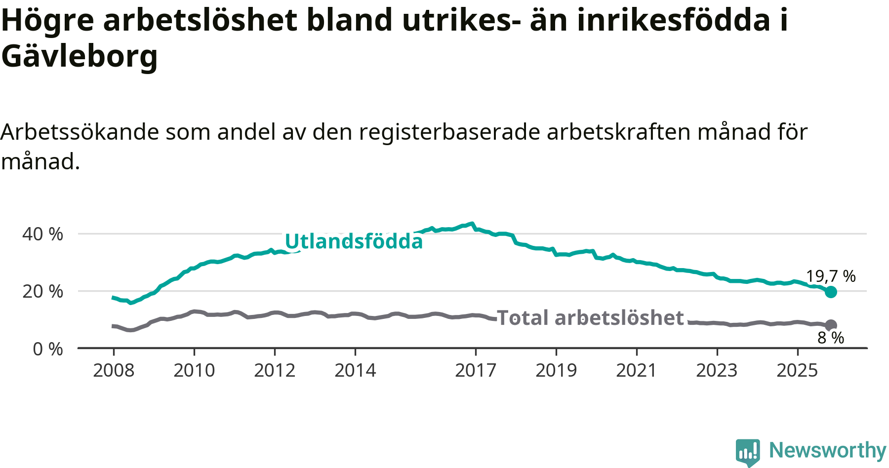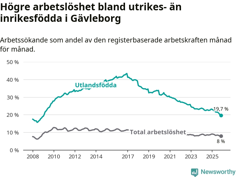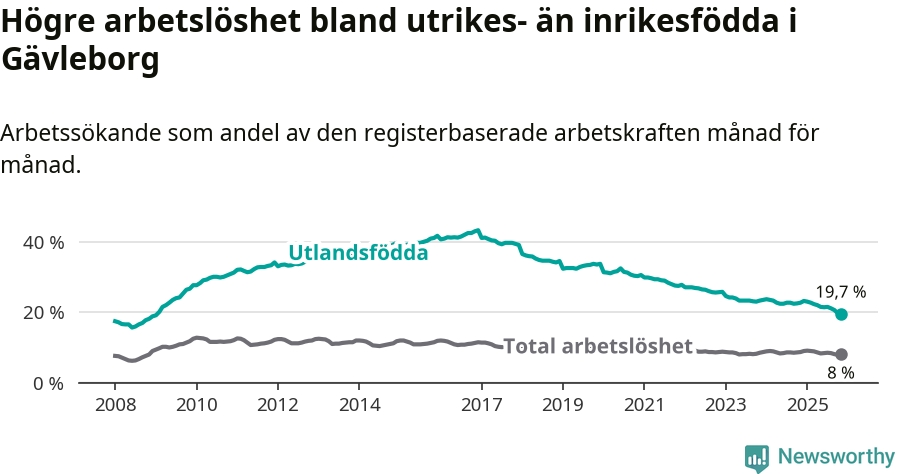 Arbetslösheten bland utlandsfödda var 19,7 procent i Gävleborg under november månad, motsvarande 4 736 av 24 041 personer. Det är 3,1 procentenheter färre än vid samma tidpunkt i fjol (−681 om man räknar personer). Därmed har de utlandsföddas arbetslöshet varit lägre än vid samma tidpunkt i fjol i över åtta år i sträck. Sedan februari 2017 har arbetslösheten bland utlandsfödda minskat från 41,4 till 19,7 procent. Den nuvarande arbetslöshetsnivån är den lägsta sedan januari 2009.