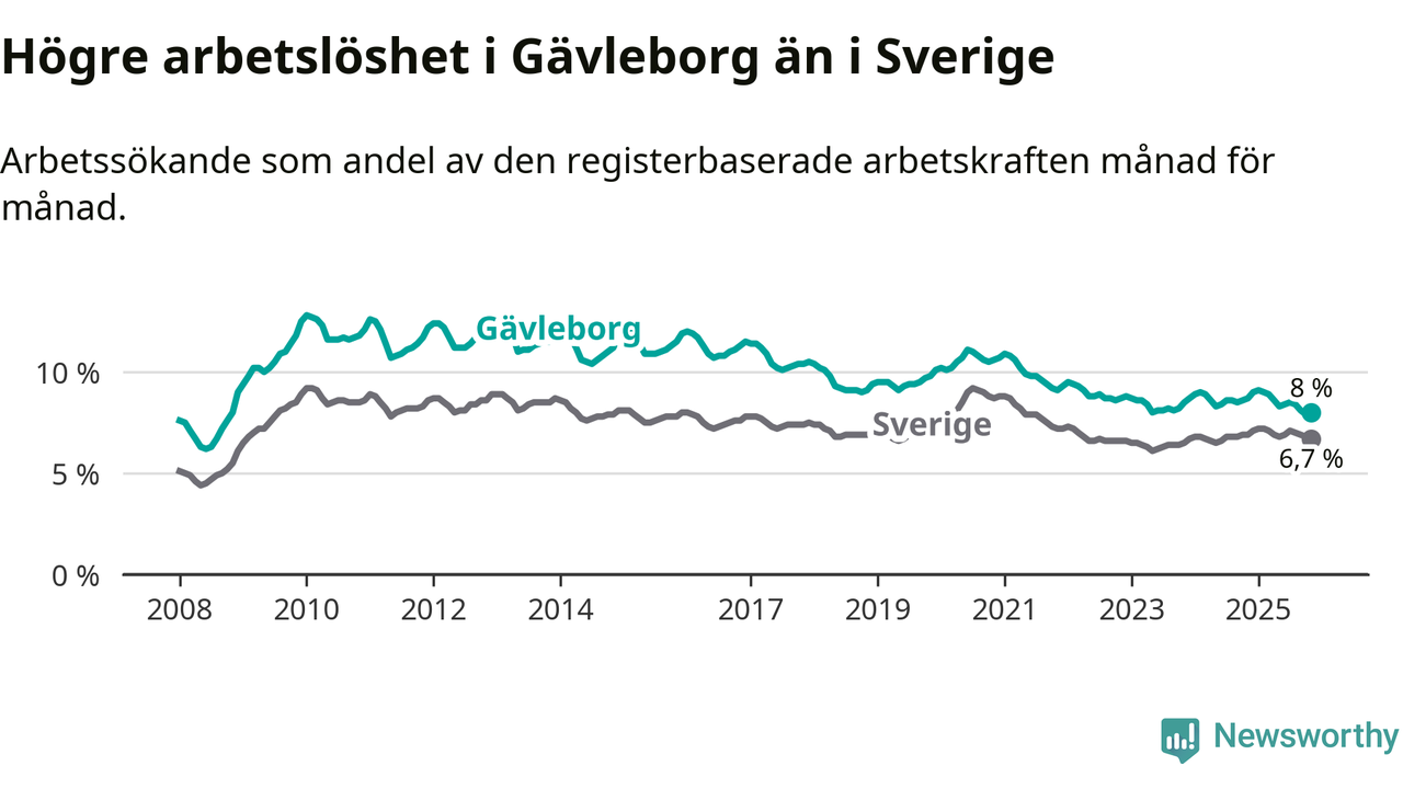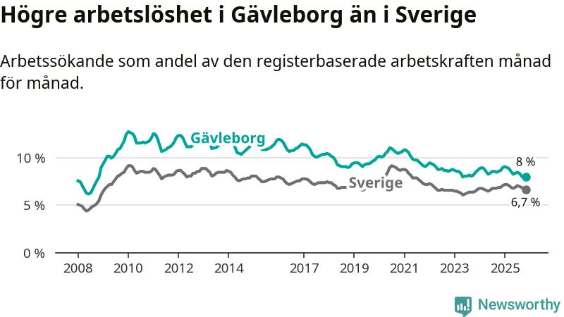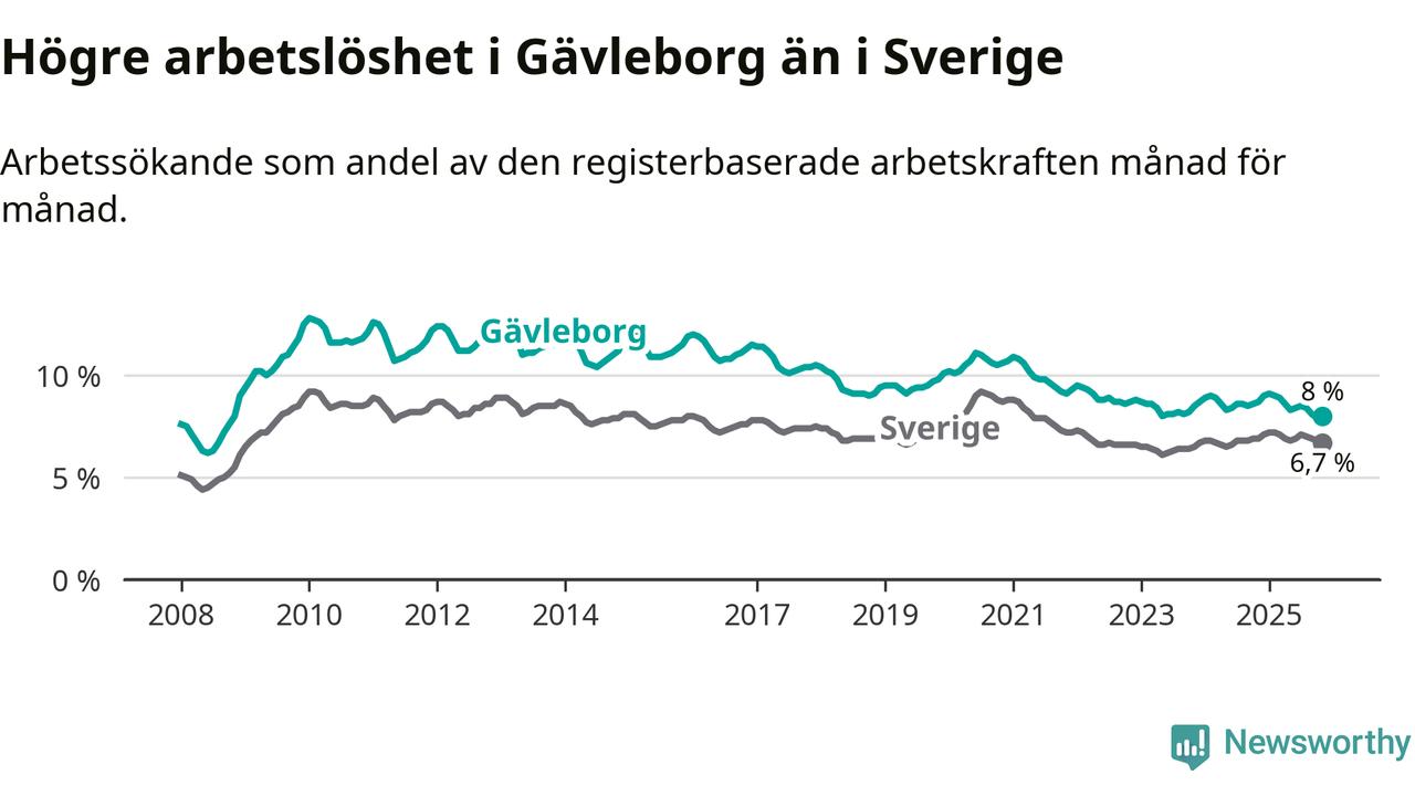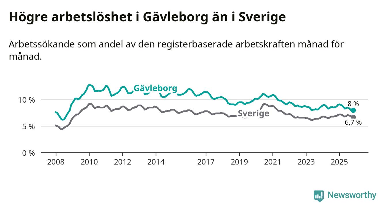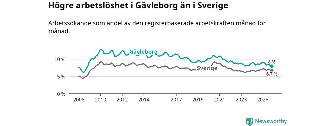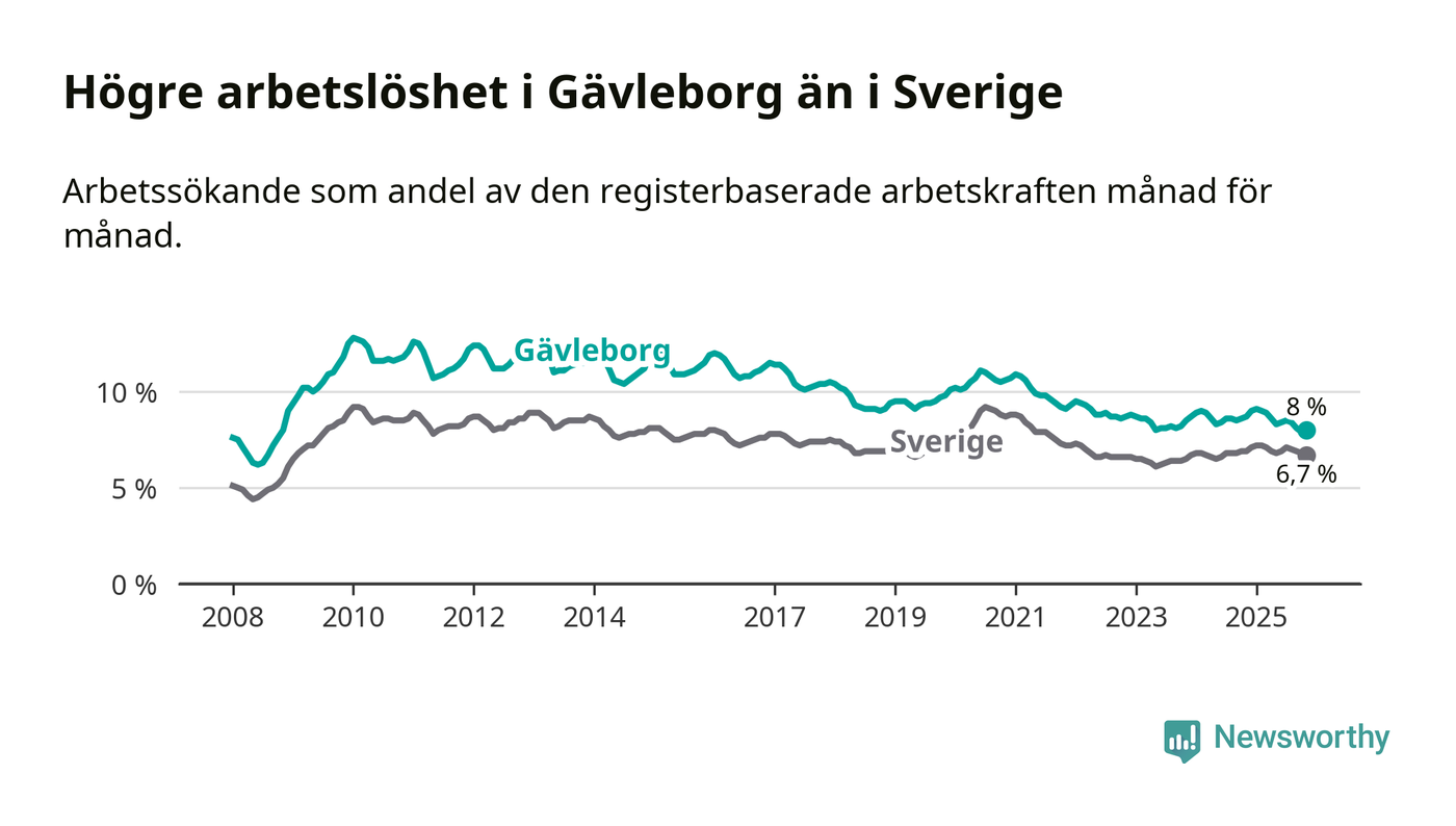 Även om arbetslösheten i Gävleborg alltså minskar, så ligger den fortfarande över snittet i hela Sverige (8,0 procent i länet, jämfört med 6,7 procent i hela riket). Norrbotten har den lägsta arbetslösheten i riket (3,8 procent), medan Skåne har den högsta (8,8 procent). För att Gävleborg skulle komma ner i samma arbetslöshetsnivå som Norrbotten skulle 5 707 personer behöva sysselsättas.