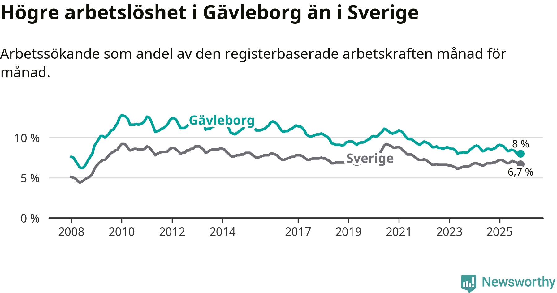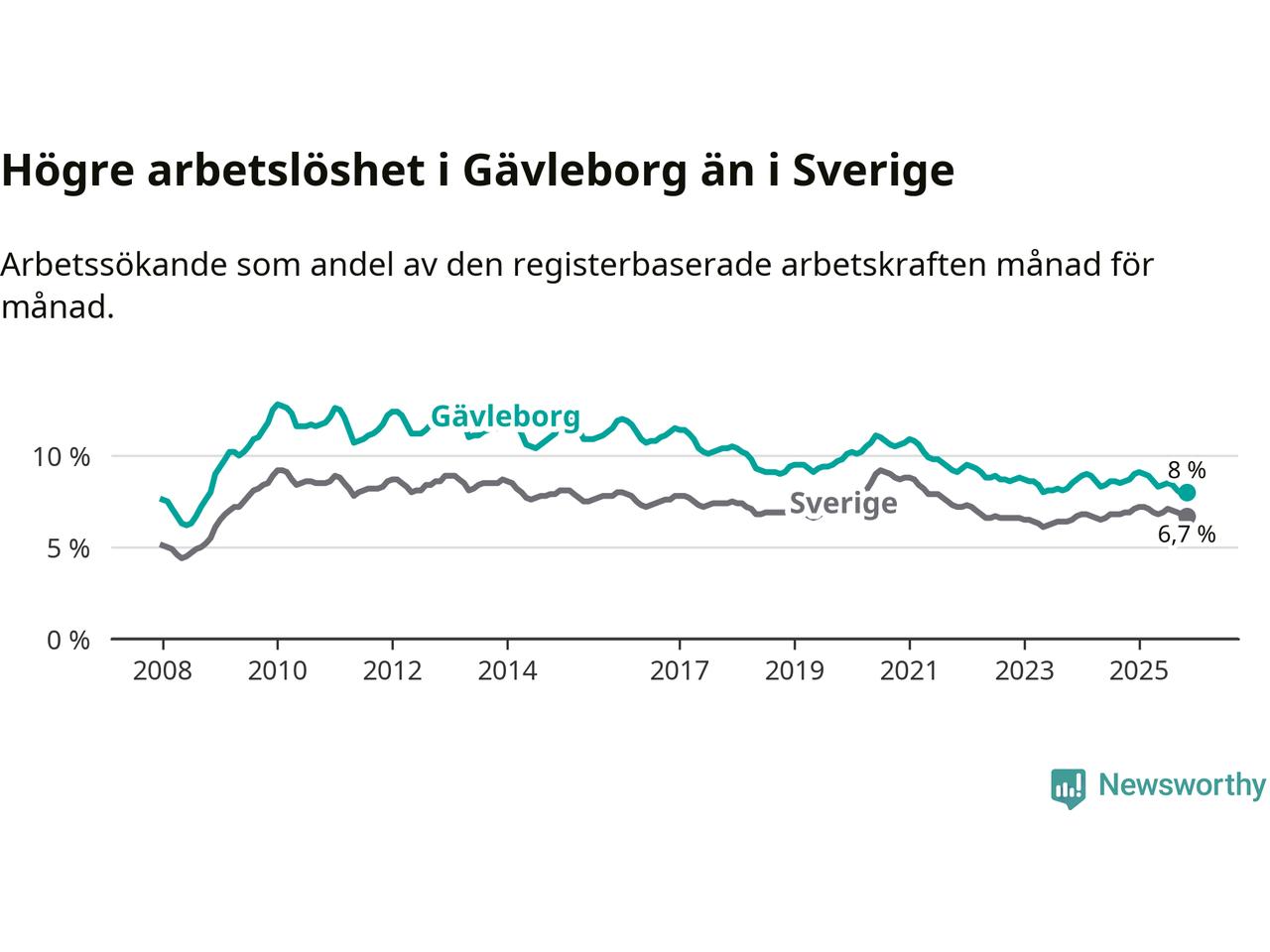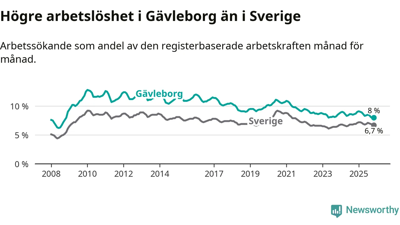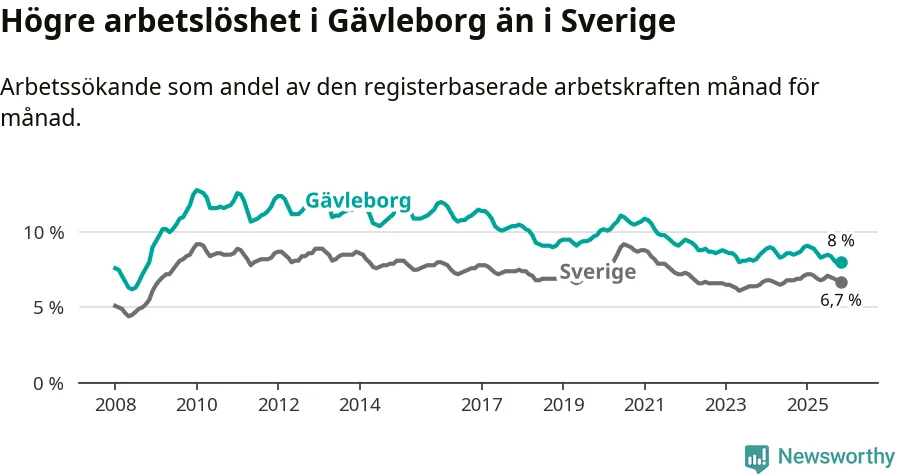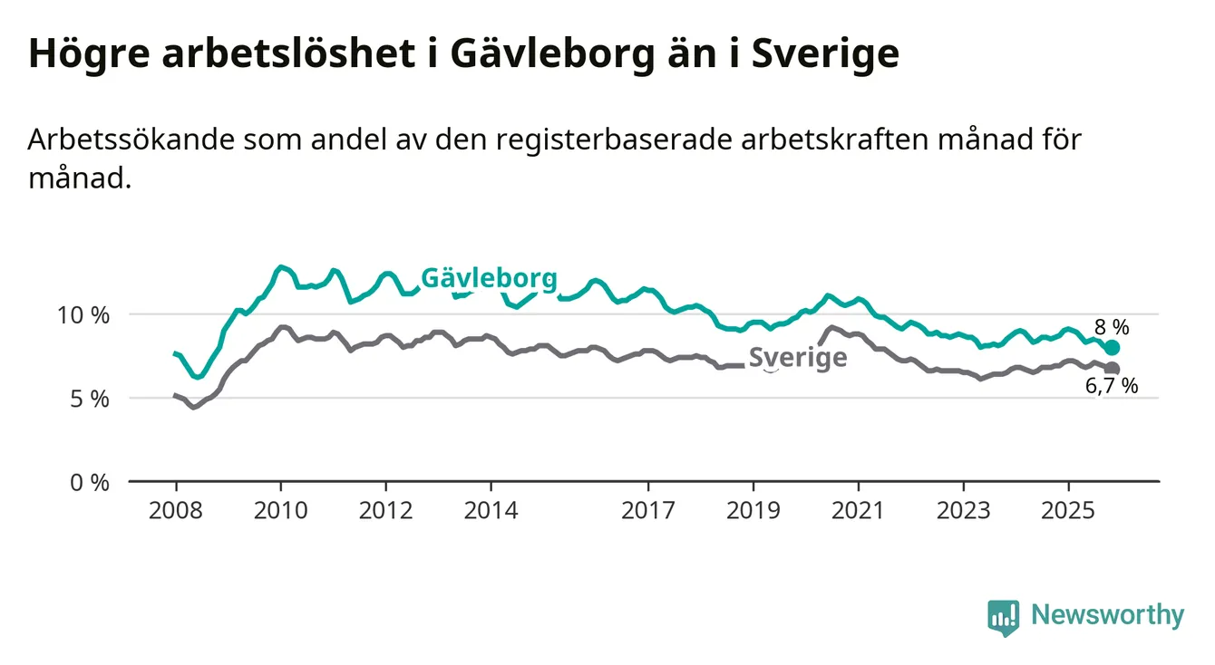 Även om arbetslösheten i Gävleborg alltså minskar, så ligger den fortfarande över snittet i hela Sverige (8,0 procent i länet, jämfört med 6,7 procent i hela riket). Norrbotten har den lägsta arbetslösheten i riket (3,8 procent), medan Skåne har den högsta (8,8 procent). För att Gävleborg skulle komma ner i samma arbetslöshetsnivå som Norrbotten skulle 5 707 personer behöva sysselsättas.